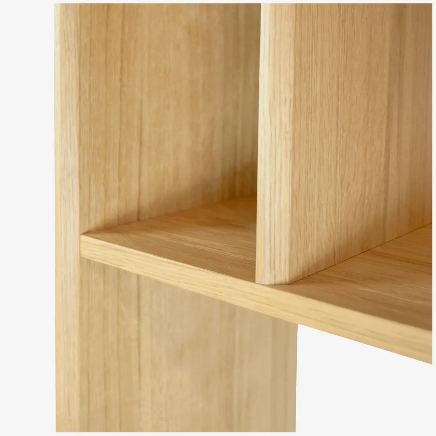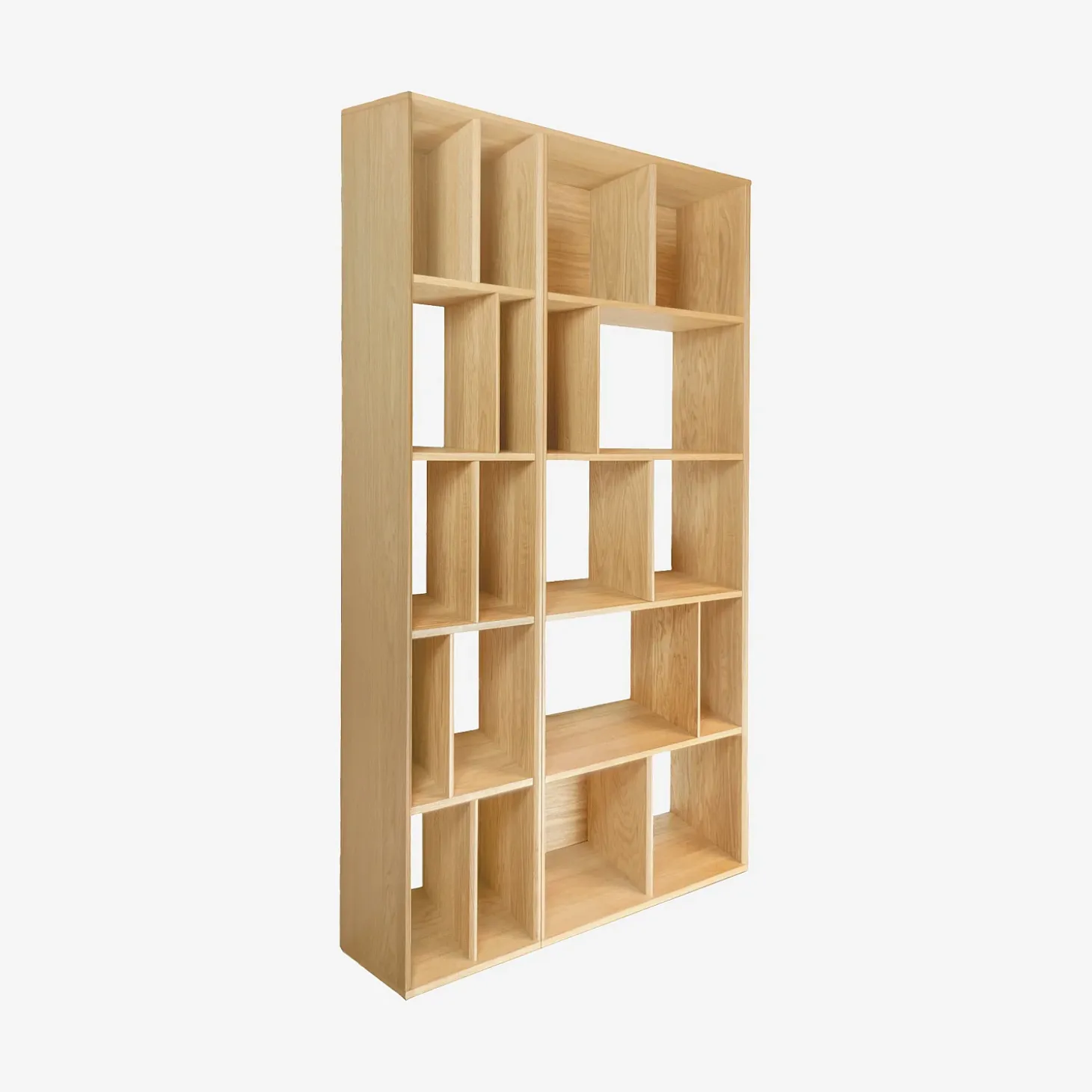 Ses ouvertures multiples partiellement ajourées créent un rythme visuel subtil laissant circuler la lumière et permettent un jeu de profondeur. L’agencement asymétrique structure la pièce tout en valorisant les objets exposés.
