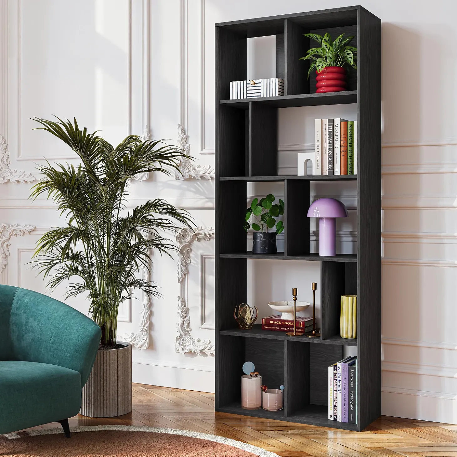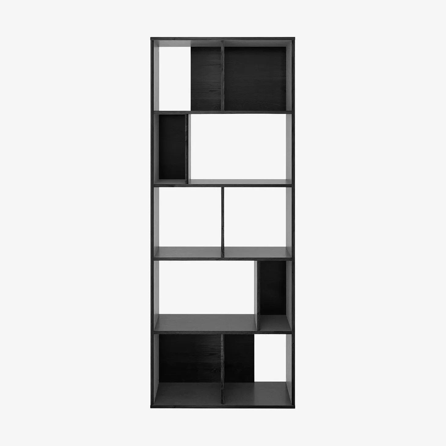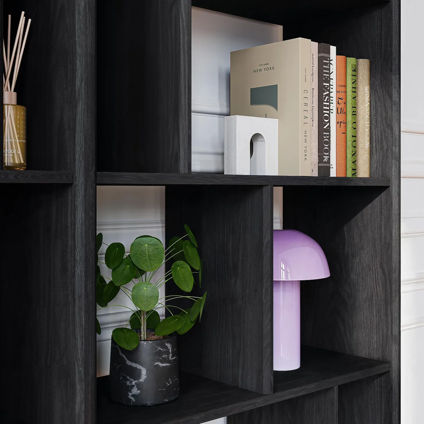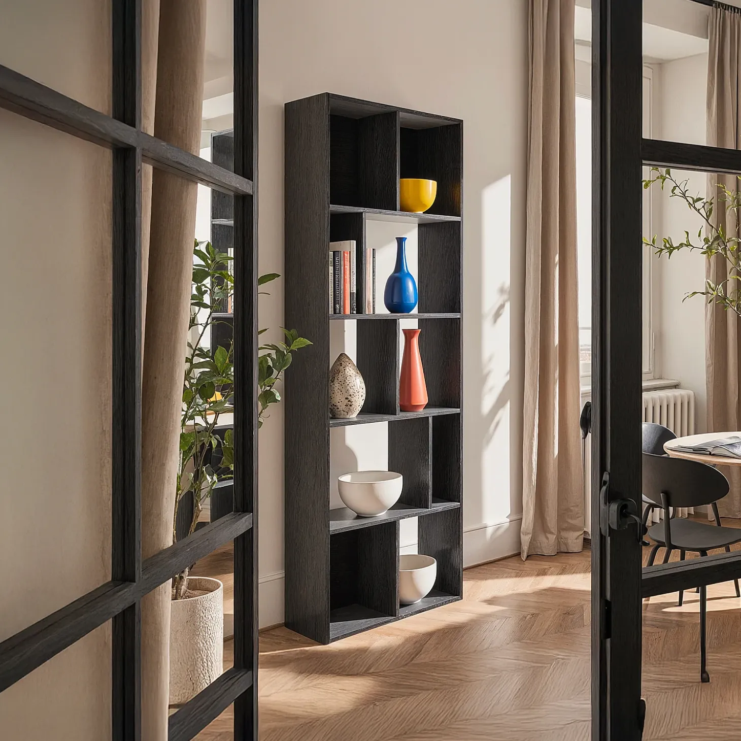 Ses ouvertures multiples partiellement ajourées créent un rythme visuel subtil laissant circuler la lumière et permettent un jeu de profondeur. L’agencement asymétrique structure la pièce tout en valorisant les objets exposés.