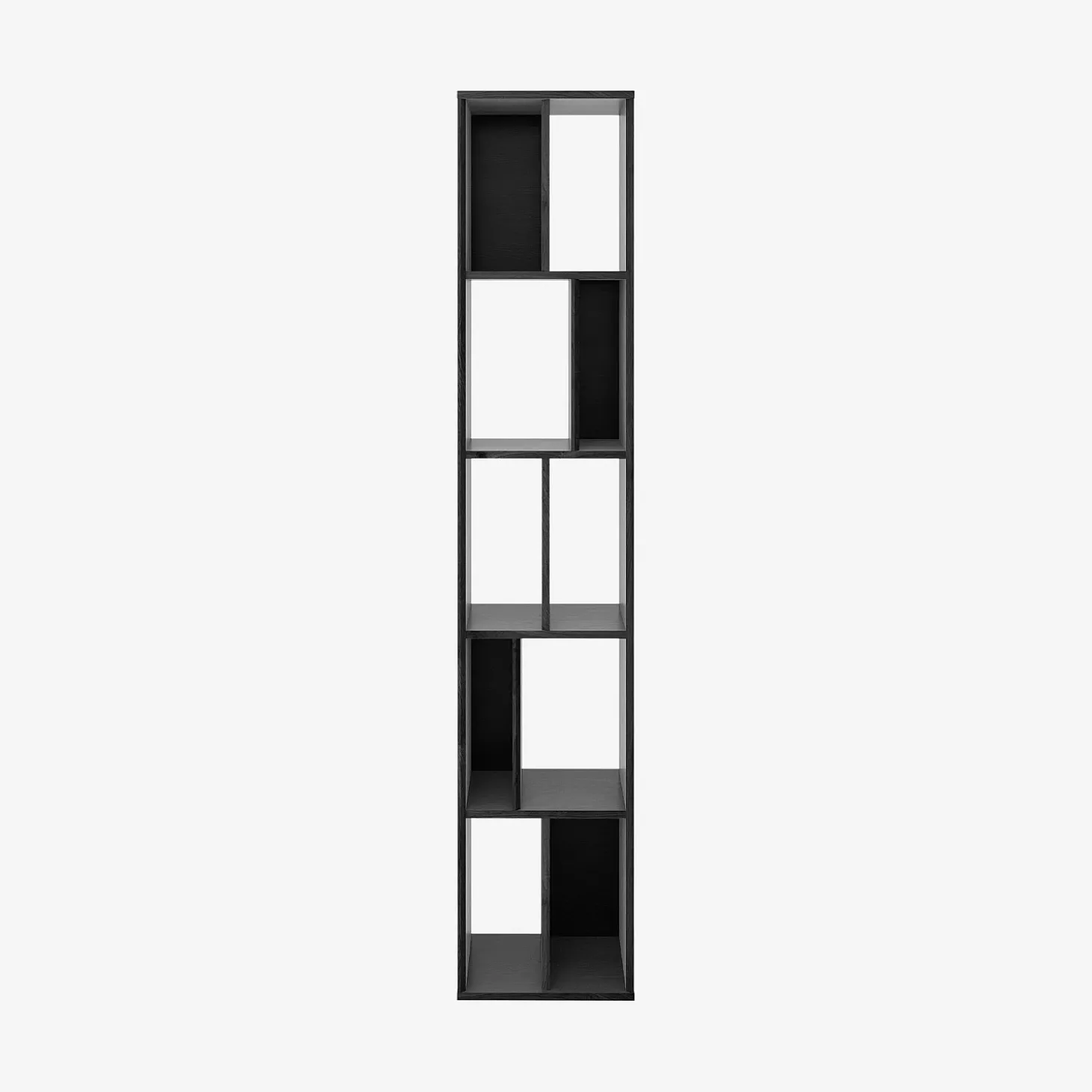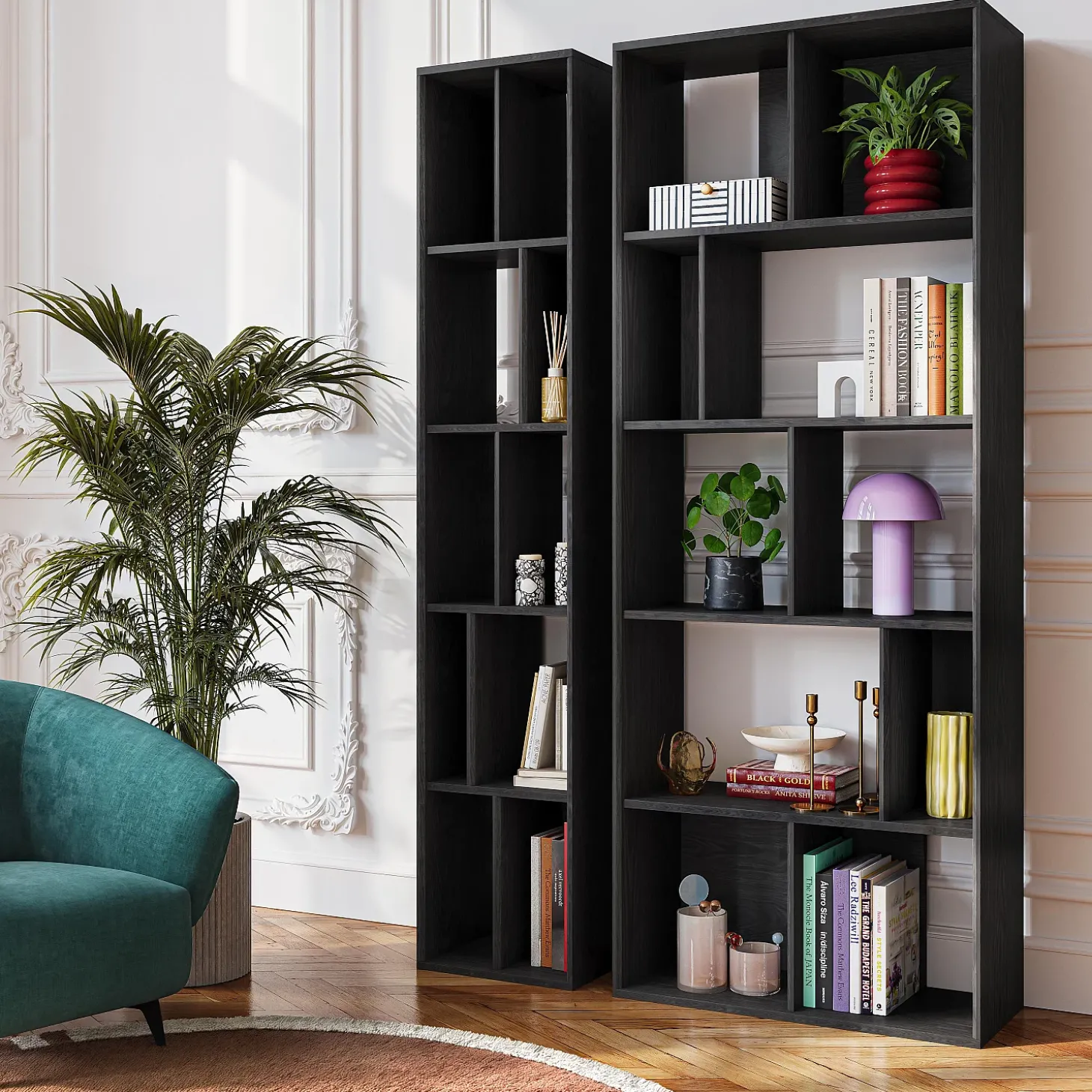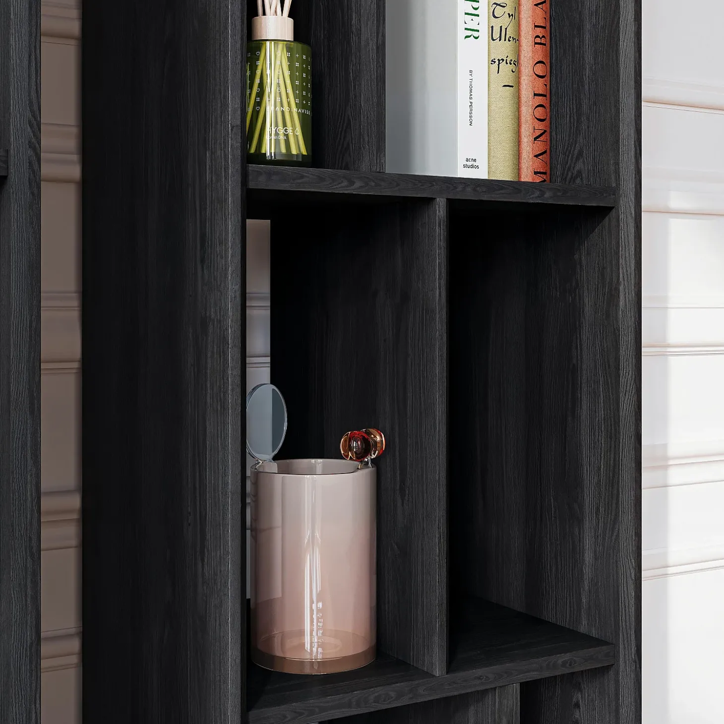 Ses ouvertures multiples partiellement ajourées créent un rythme visuel subtil laissant circuler la lumière et permettent un jeu de profondeur. L’agencement asymétrique structure la pièce tout en valorisant les objets exposés.