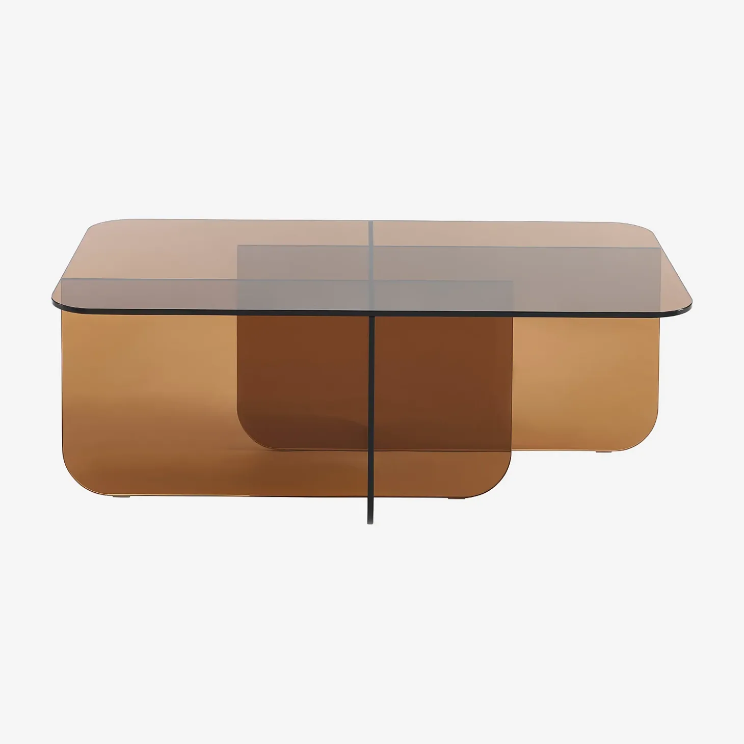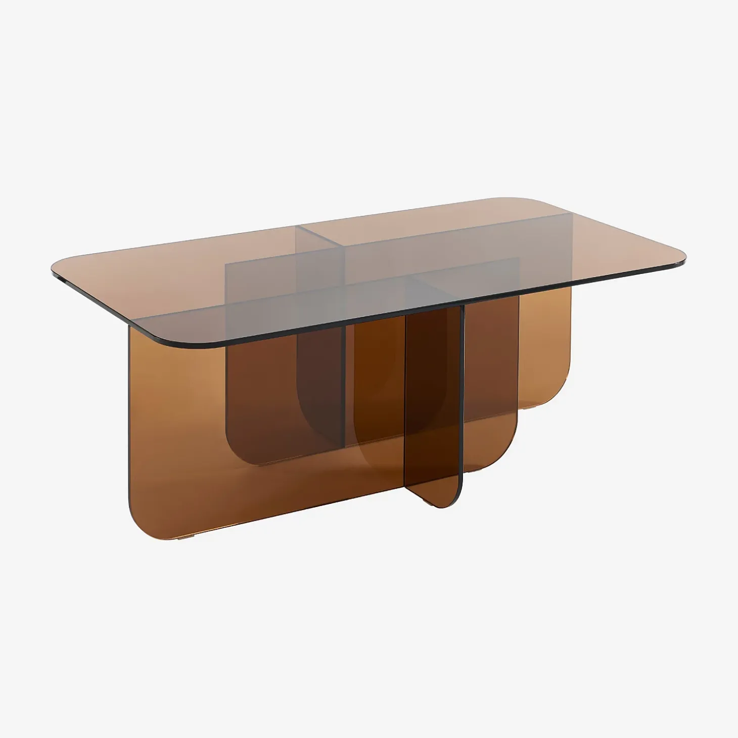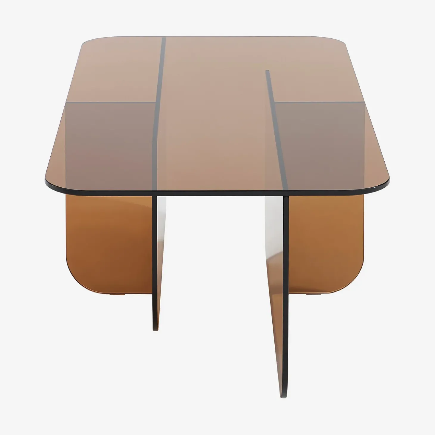 Son plateau rectangulaire marron ambré diffuse une lumière chaleureuse, révélant une profondeur raffinée qui anime l’espace. Les lignes aux angles adoucis insufflent fluidité et équilibre, tandis que le piètement, composé de formes semi-circulaires assemblées en croix, déploie une architecture intérieure spectaculaire. Selon l’angle de vue, sa silhouette évolue, laissant apparaître des facettes différentes de son design et donnant l’impression d’un piètement en perpétuelle métamorphose.