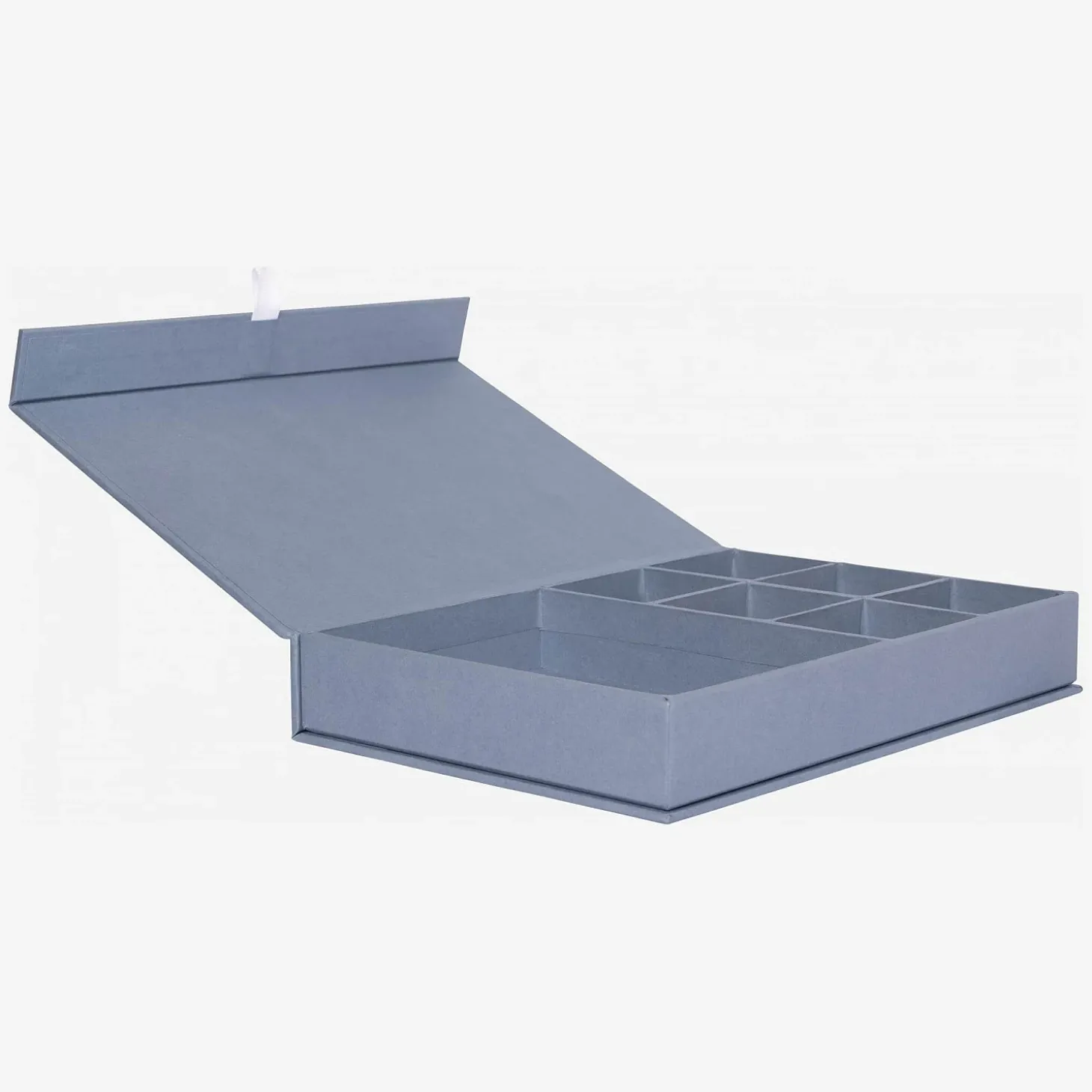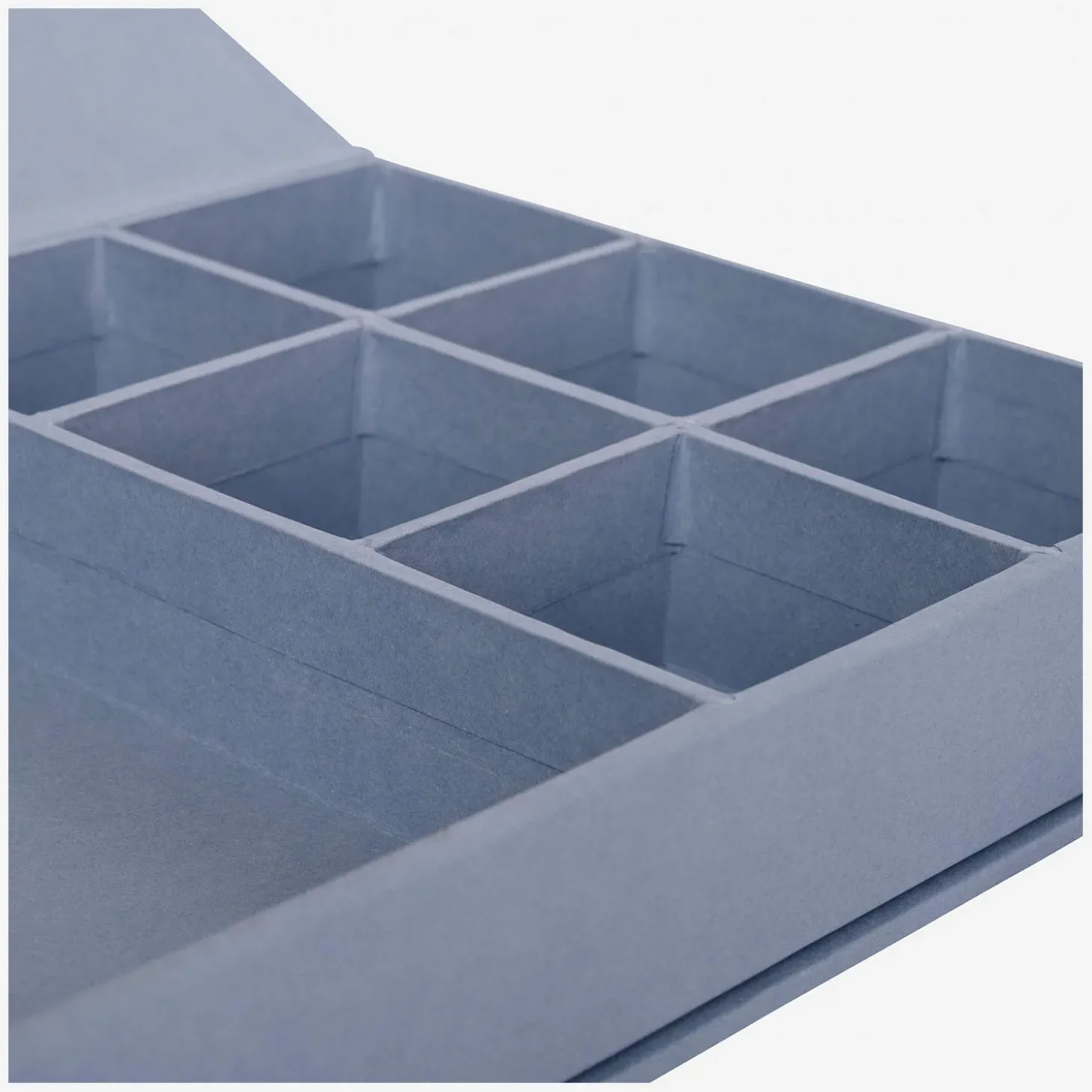 La boîte à bijoux Ada est en carton de couleur bleue. Elle possède 7 compartiments : 6 petits et 1 plus grand pour accueillir vos colliers, bagues, boucles-d ’oreilles, boutons de manchette, broches ou bracelets.
