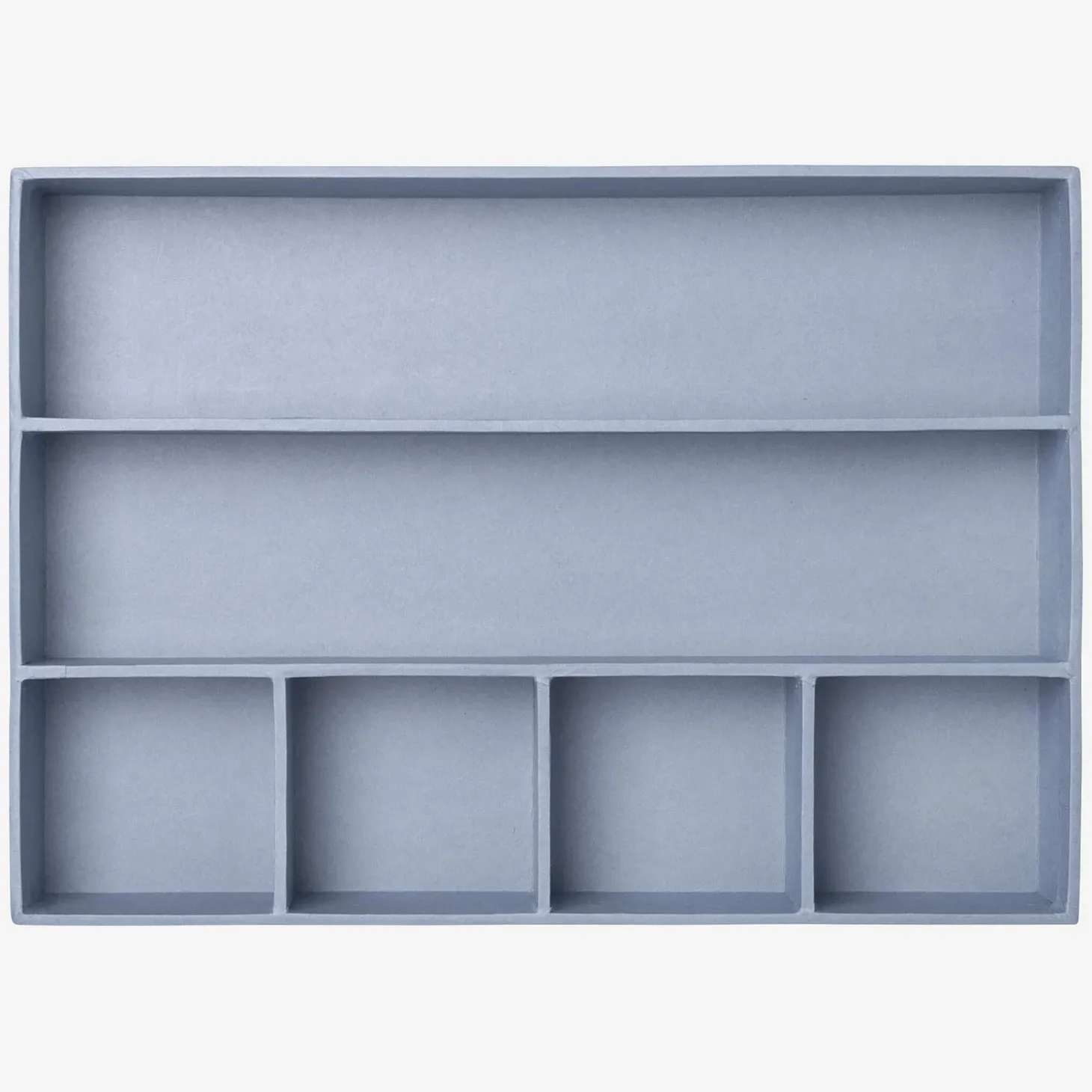 L’organisateur de tiroir Ada est en carton de couleur bleue. Pour ordonner et classer vos affaires, il dispose de 6 compartiments : 2 grands et 4 petits.
