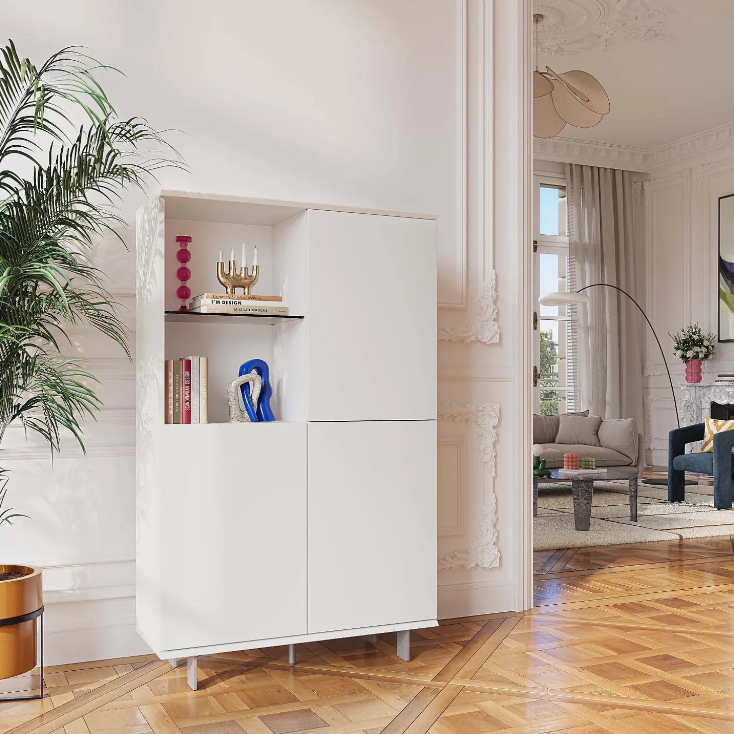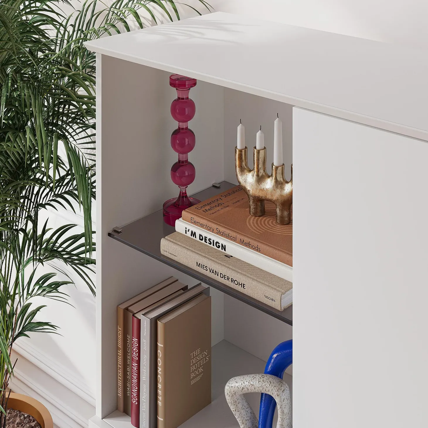 Sa composition intègre trois portes dissimulant plusieurs compartiments, parfaits pour organiser la vaisselle, les textiles ou les objets du quotidien. Une niche ouverte, rehaussée d’une tablette en verre trempé, permet de mettre en valeur des éléments décoratifs en toute simplicité.