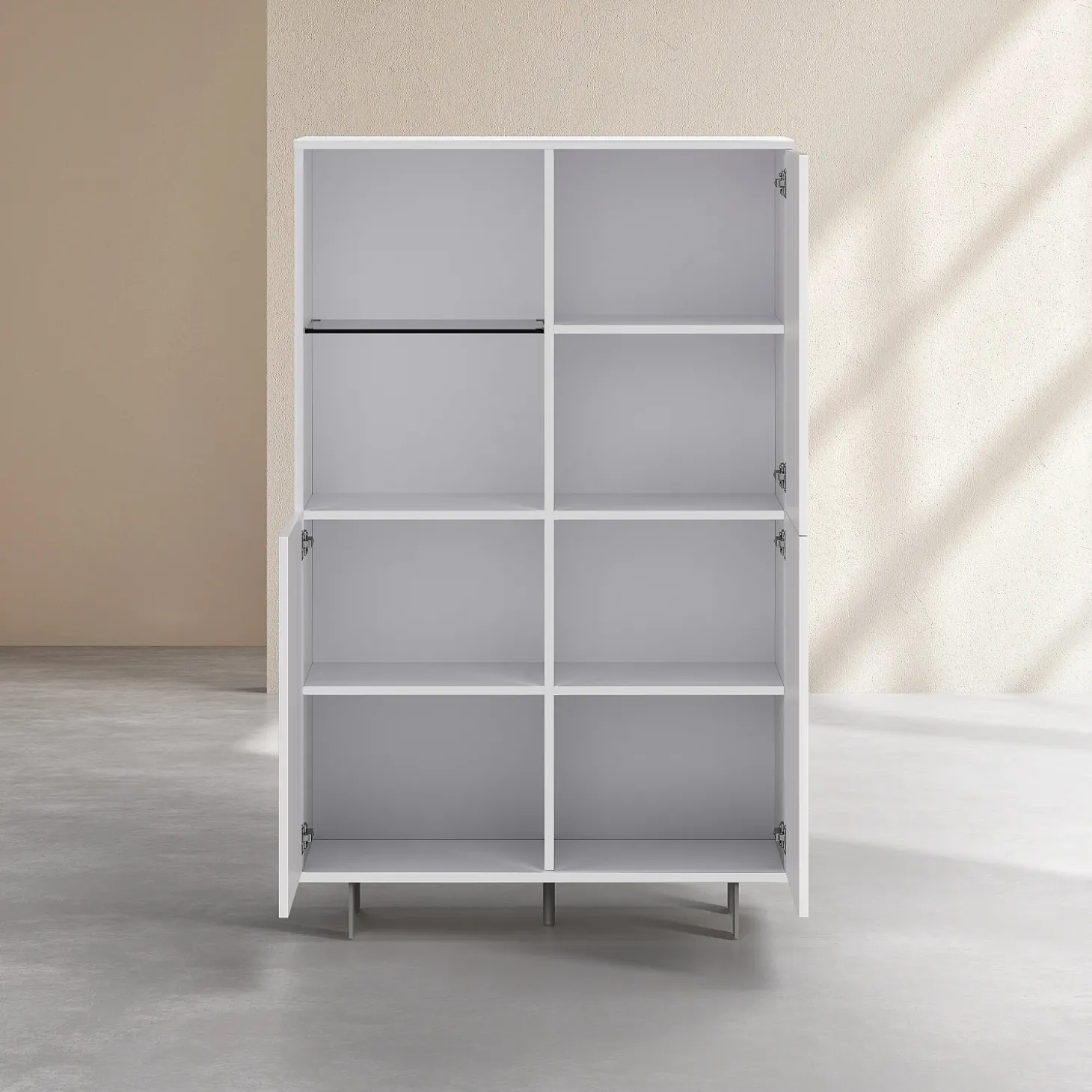 Charges maximales supportées : 30 kg pour le plateau supérieur et 10 kg par tablettes/casesDesign structuré, pieds fins et finition mate dessinent un buffet haut à l’élégance contemporaine. Une pièce pratique et équilibrée qui organise l’espace avec style.