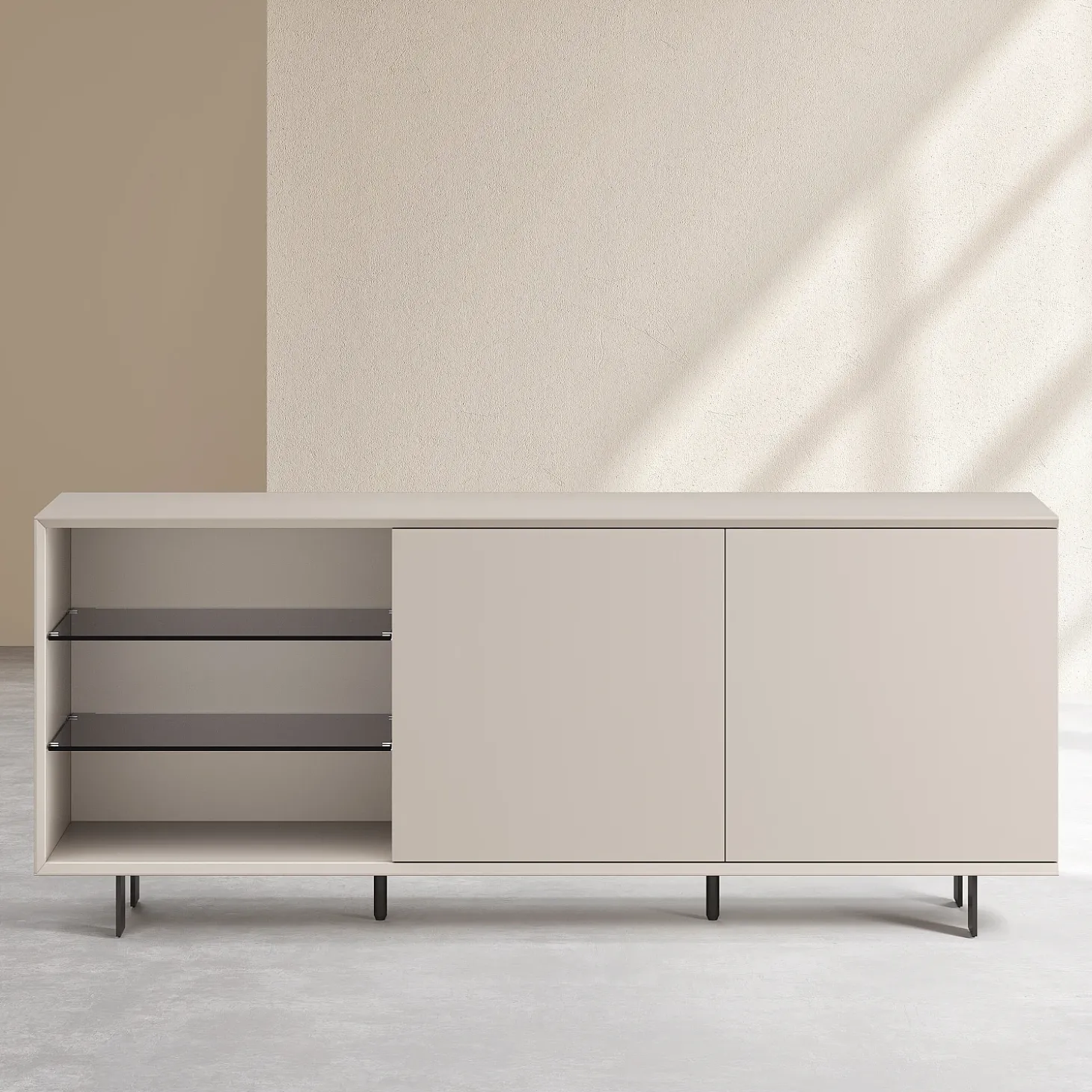 Rehaussé d’un piètement fin noir, le buffet adopte une finition crème mate, idéale pour accompagner des ambiances lumineuses et raffinées.