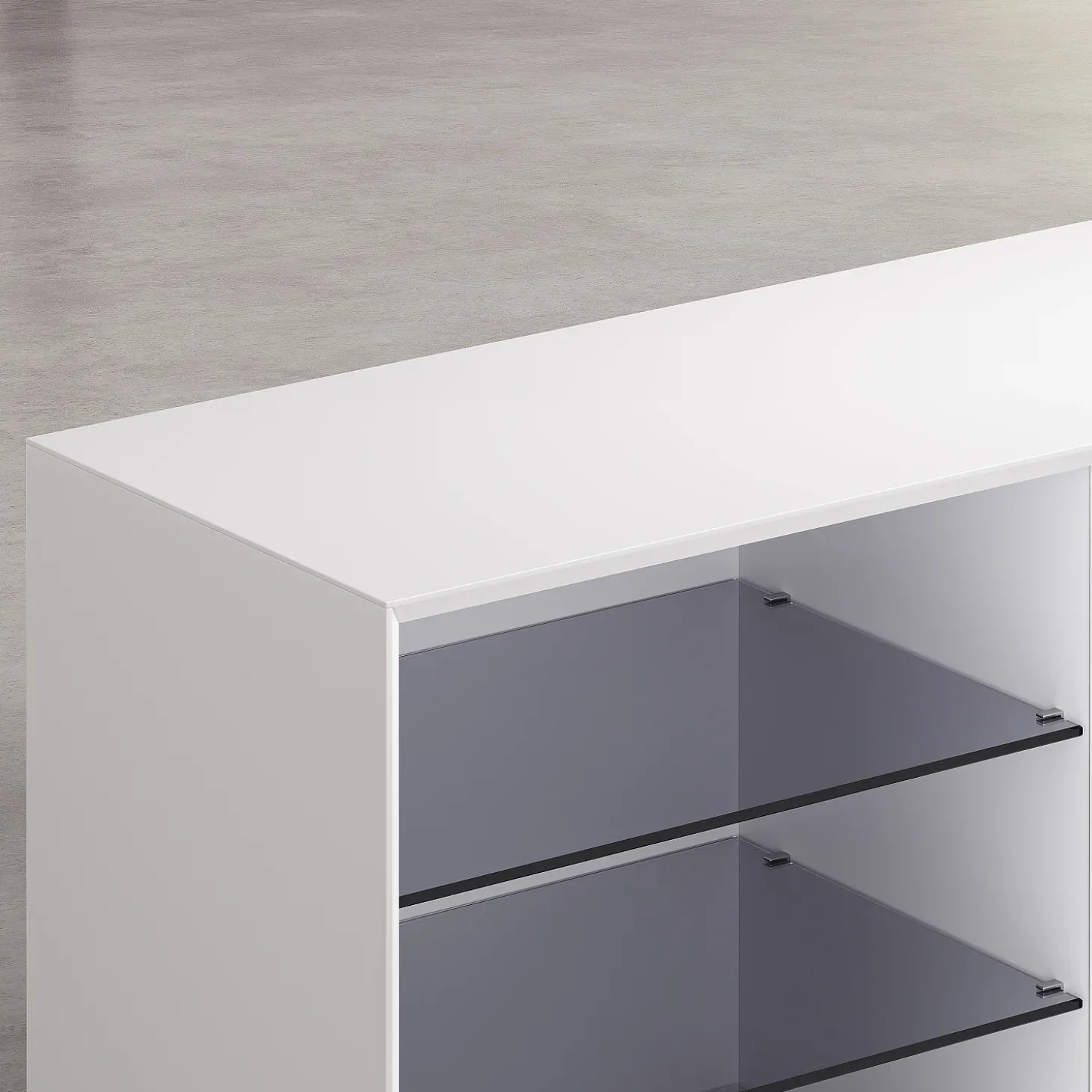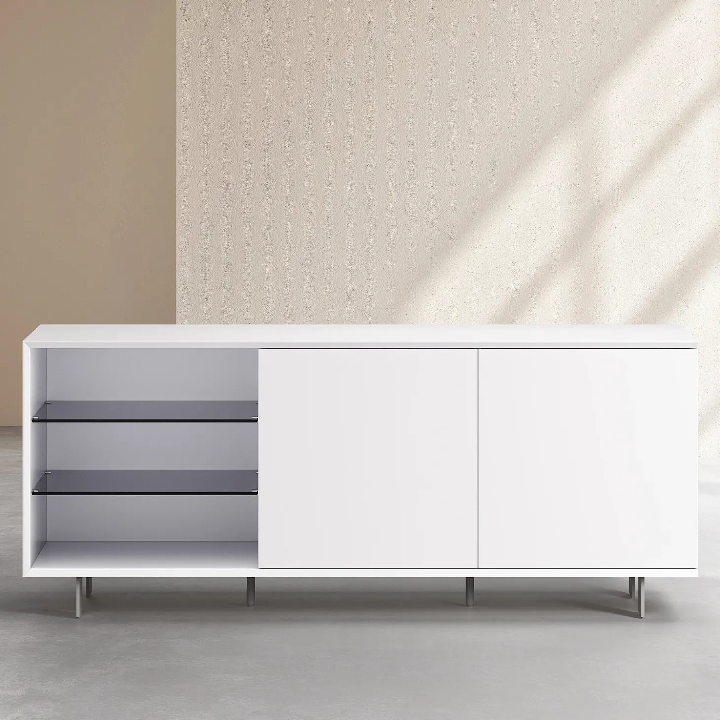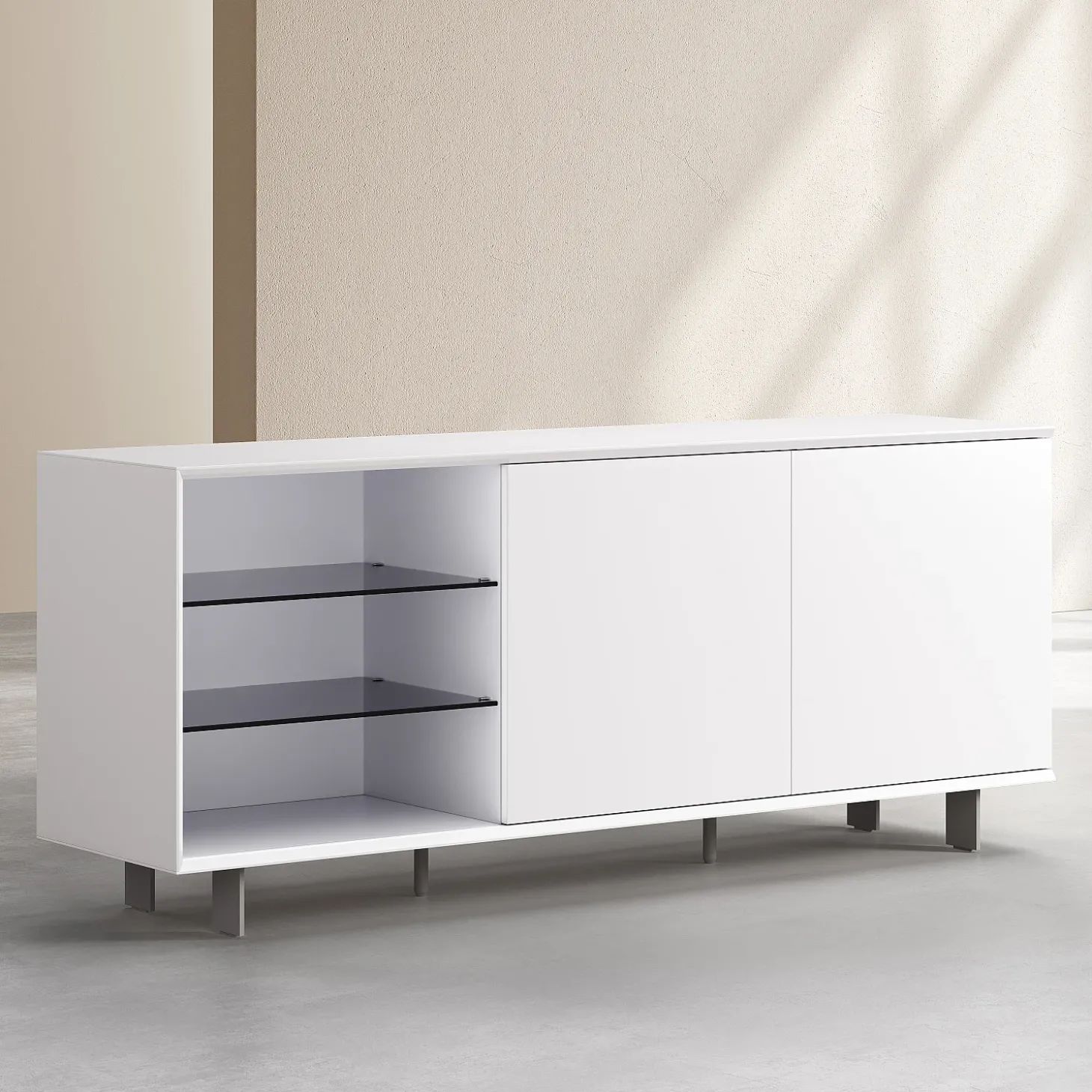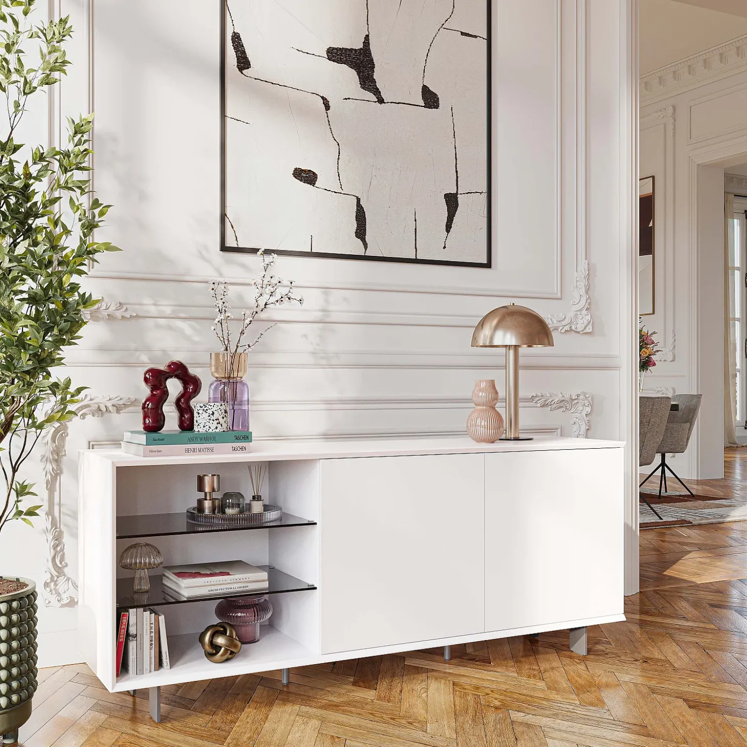 Rehaussé d’un piètement fin noir, le buffet adopte une finition blanche polaire mate au rendu soigné, idéale pour créer une ambiance lumineuse et minimaliste.