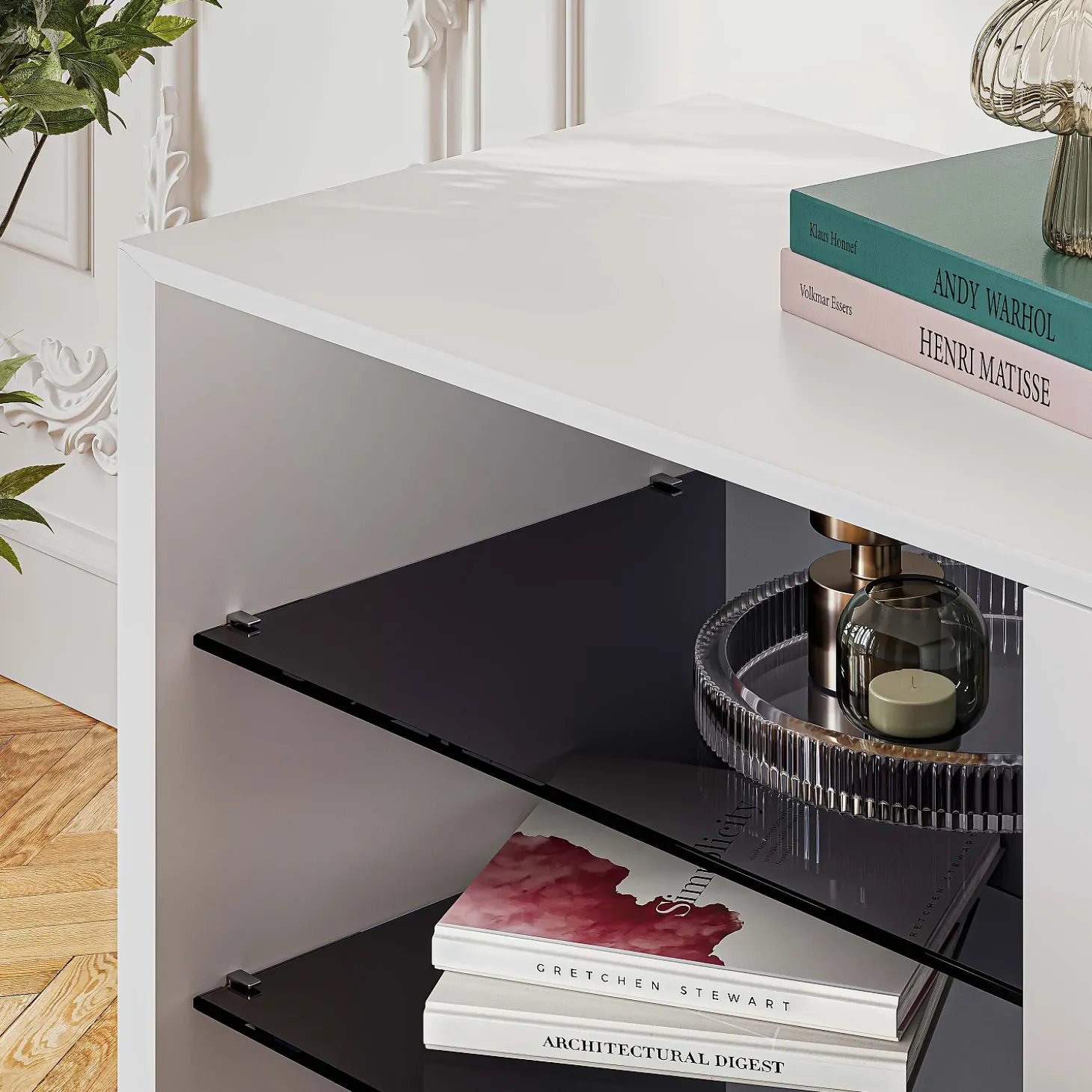 Équipé de deux portes dissimulant de multiples compartiments de rangement, il accueille aisément vaisselle, linge de maison ou objets du quotidien. Sur le côté, deux tablettes en verre trempé permettent de mettre en valeur des éléments décoratifs et de garder des accessoires essentiels à disposition.