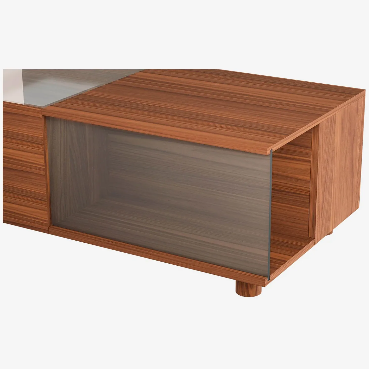 **Fabriqué en Europe**Akiro associe la chaleur du noyer et la transparence du verre dans une table basse aérienne et graphique. Une pièce de design qui allie rangement discret et élégance contemporaine.