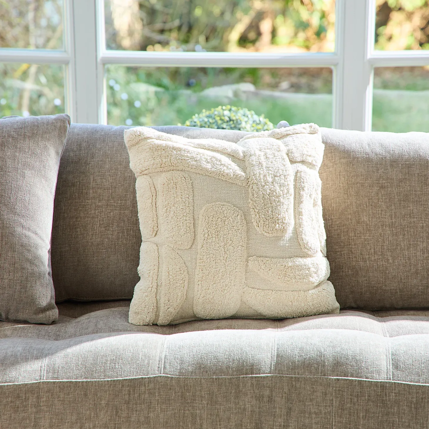 Le coussin tufté Anouk, fabriqué à la main en Inde, allie artisanat traditionnel et design moderne.