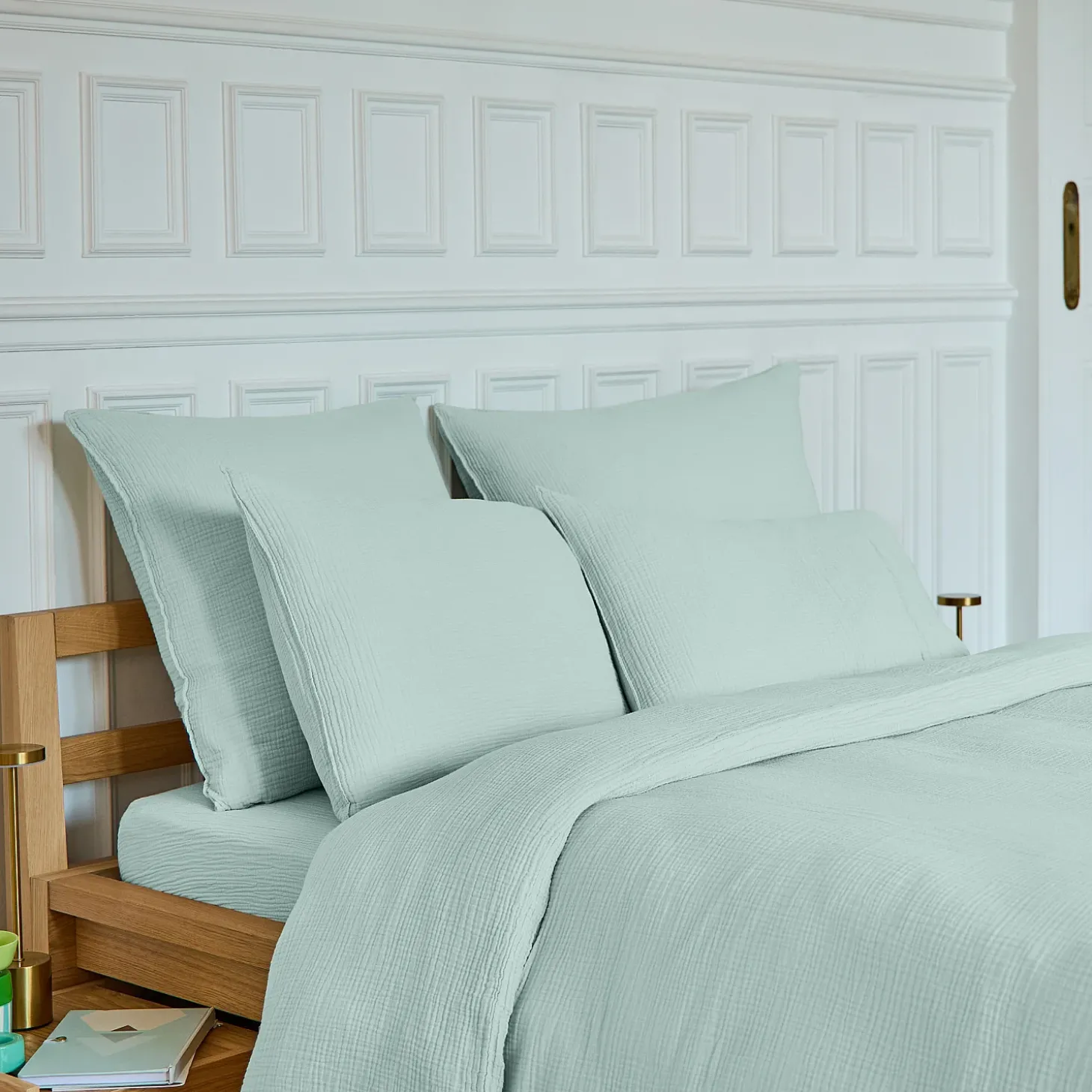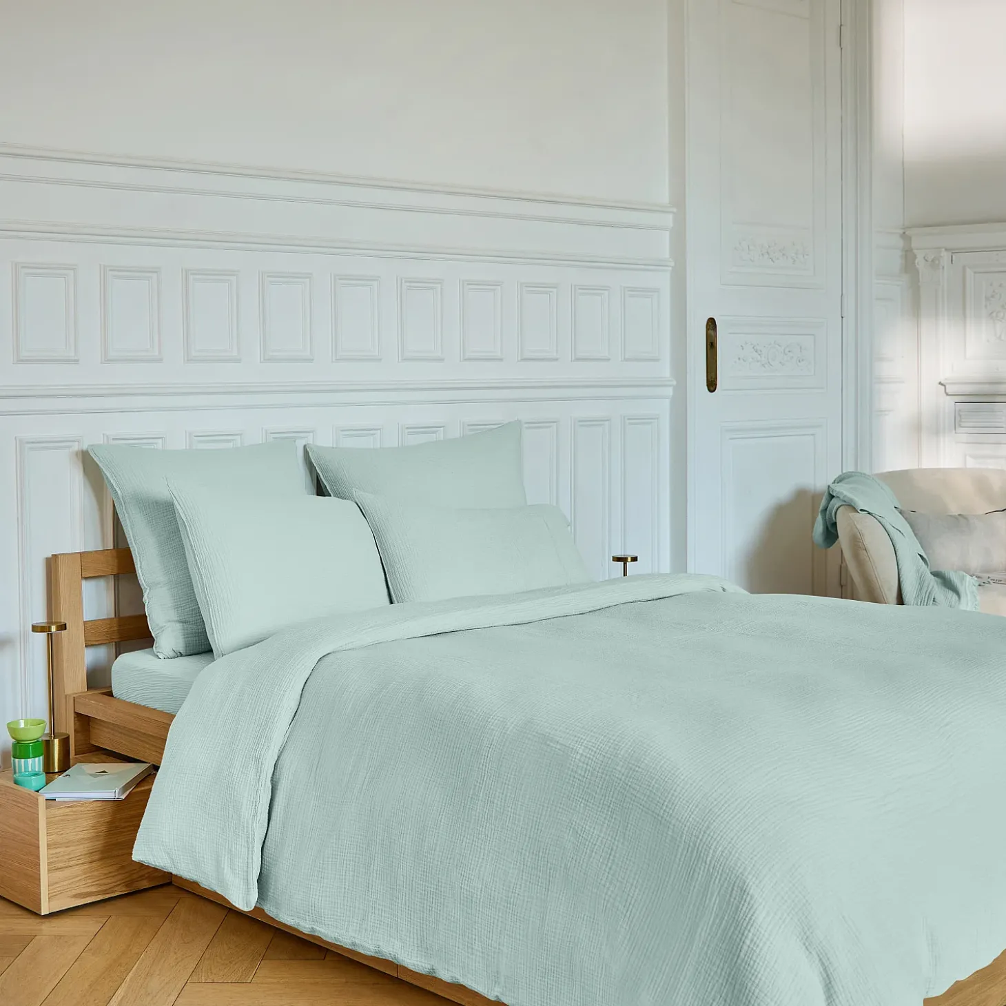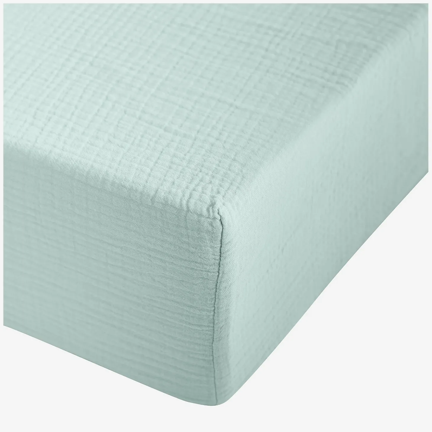 Le drap housse Arielle 160 x 200 cm en double gaze de coton céladon offre un souffle de fraîcheur naturelle à la chambre.