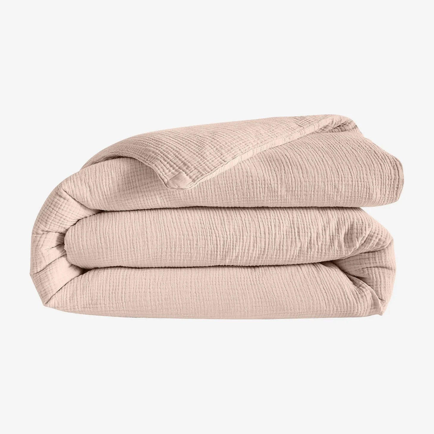 La housse de couette Arielle 240 x 220 cm en double gaze de coton rose poudré invite à la douceur et à la délicatesse.