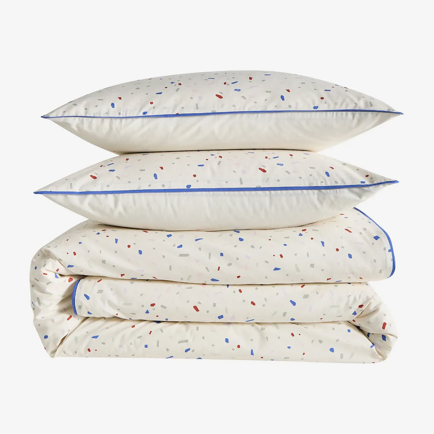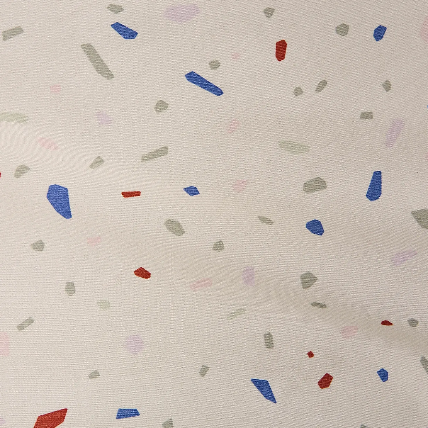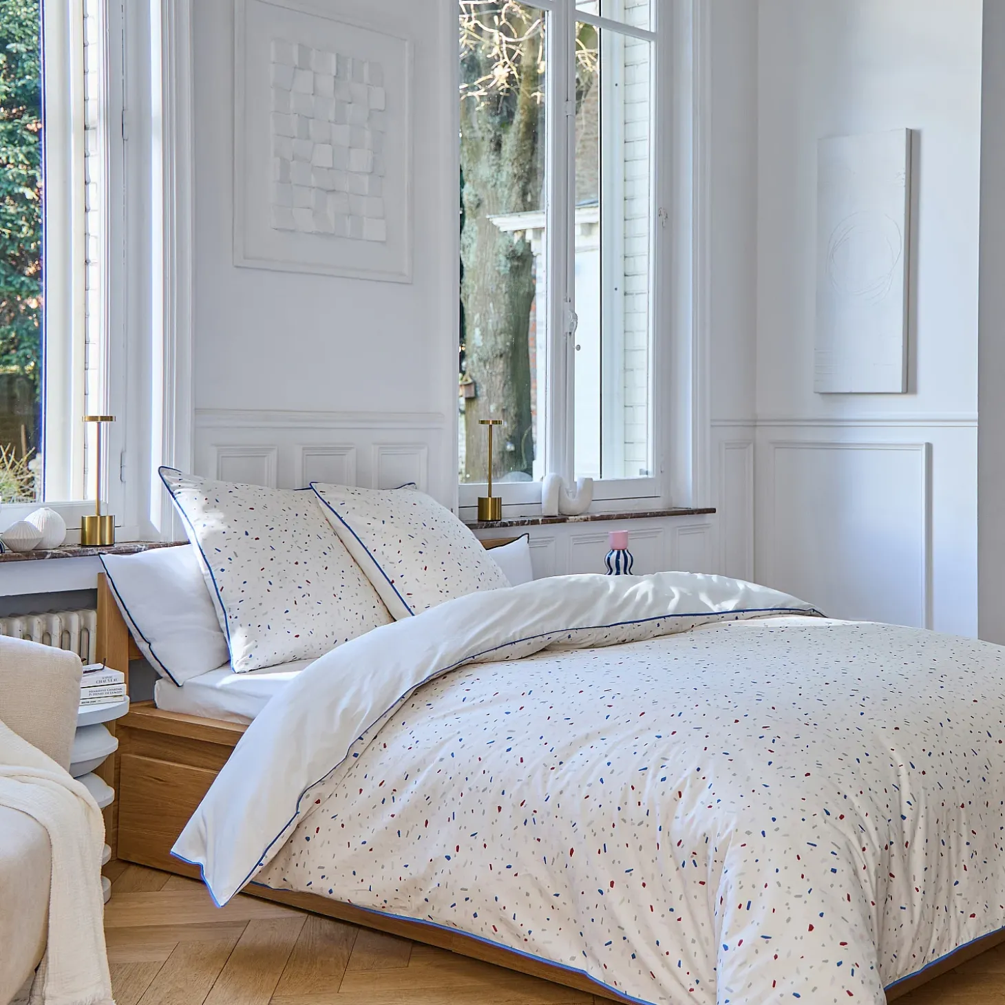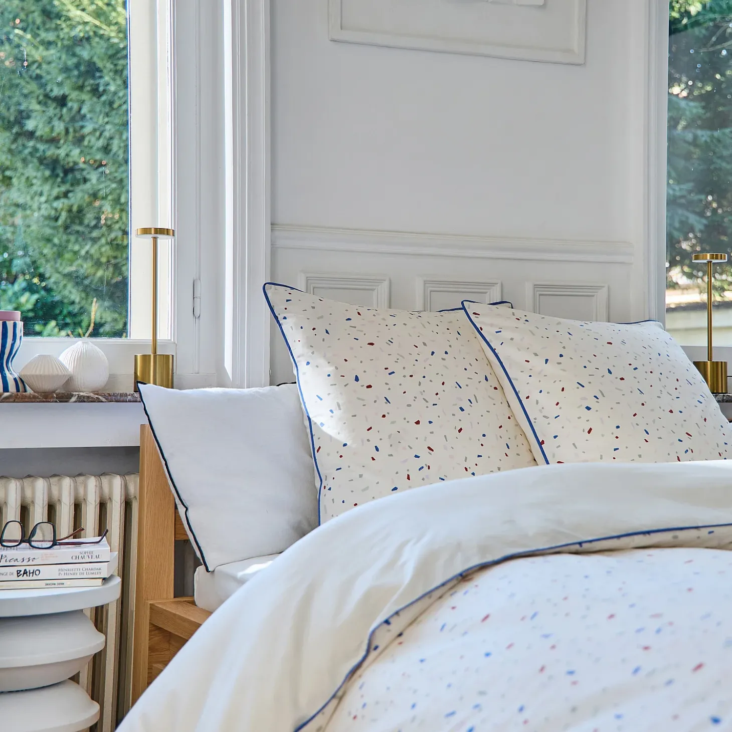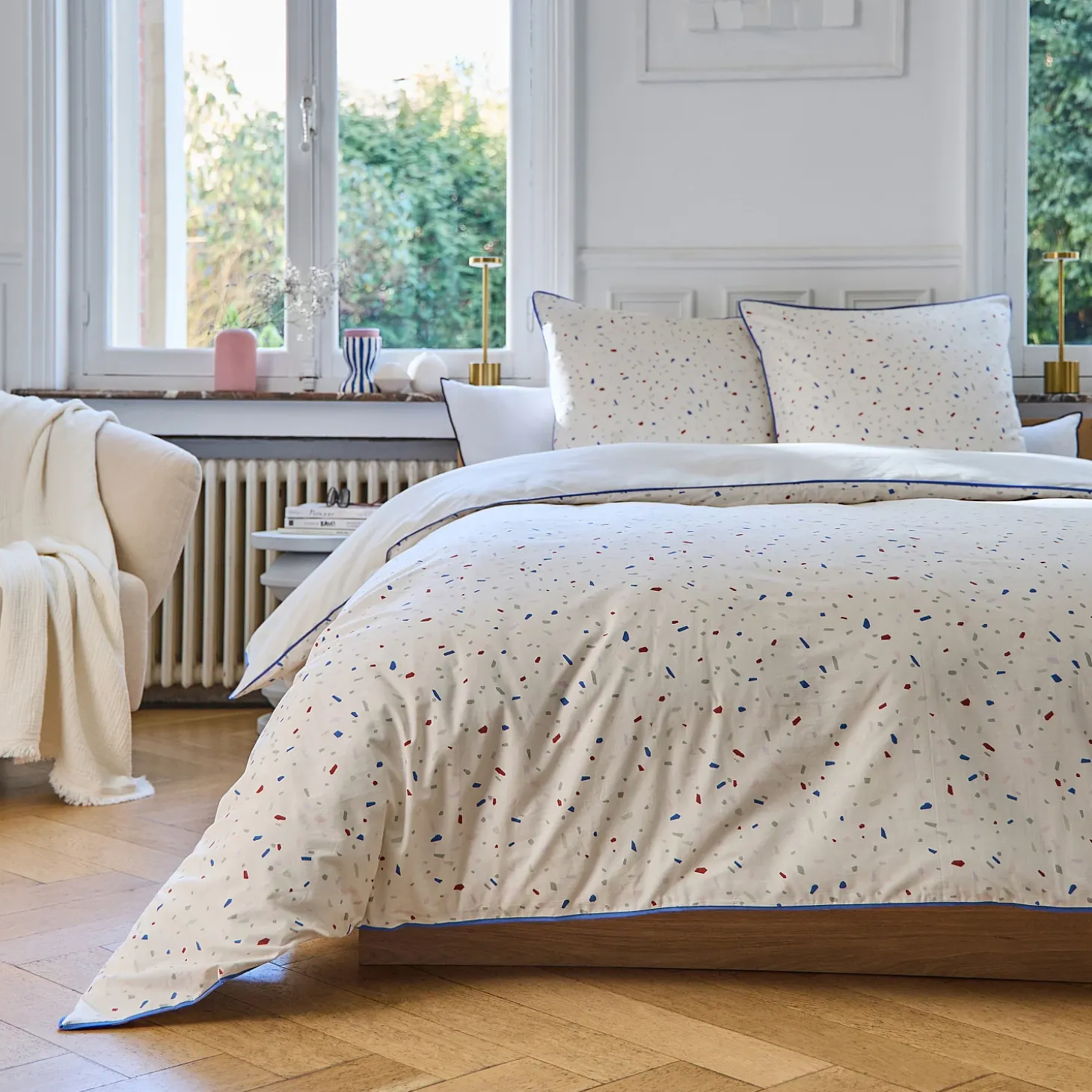 Conseils d’entretien : lavable en machine à 60°, repassage facileLa parure de lit Arlette séduit par son motif délicat inspiré du terrazzo et sa percale de coton au toucher soyeux. Une composition douce et poétique pour une chambre empreinte de sérénité.