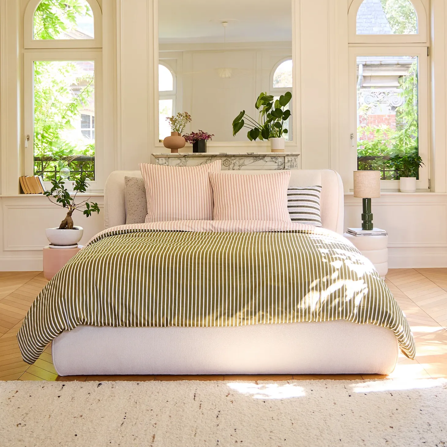 Sur le recto, les rayures vertes et écrues se déploient avec élégance, créant une harmonie visuelle à la fois moderne et apaisante. Au verso, le rose et l’écru s’entrelacent délicatement, apportant une touche de chaleur et de sérénité.