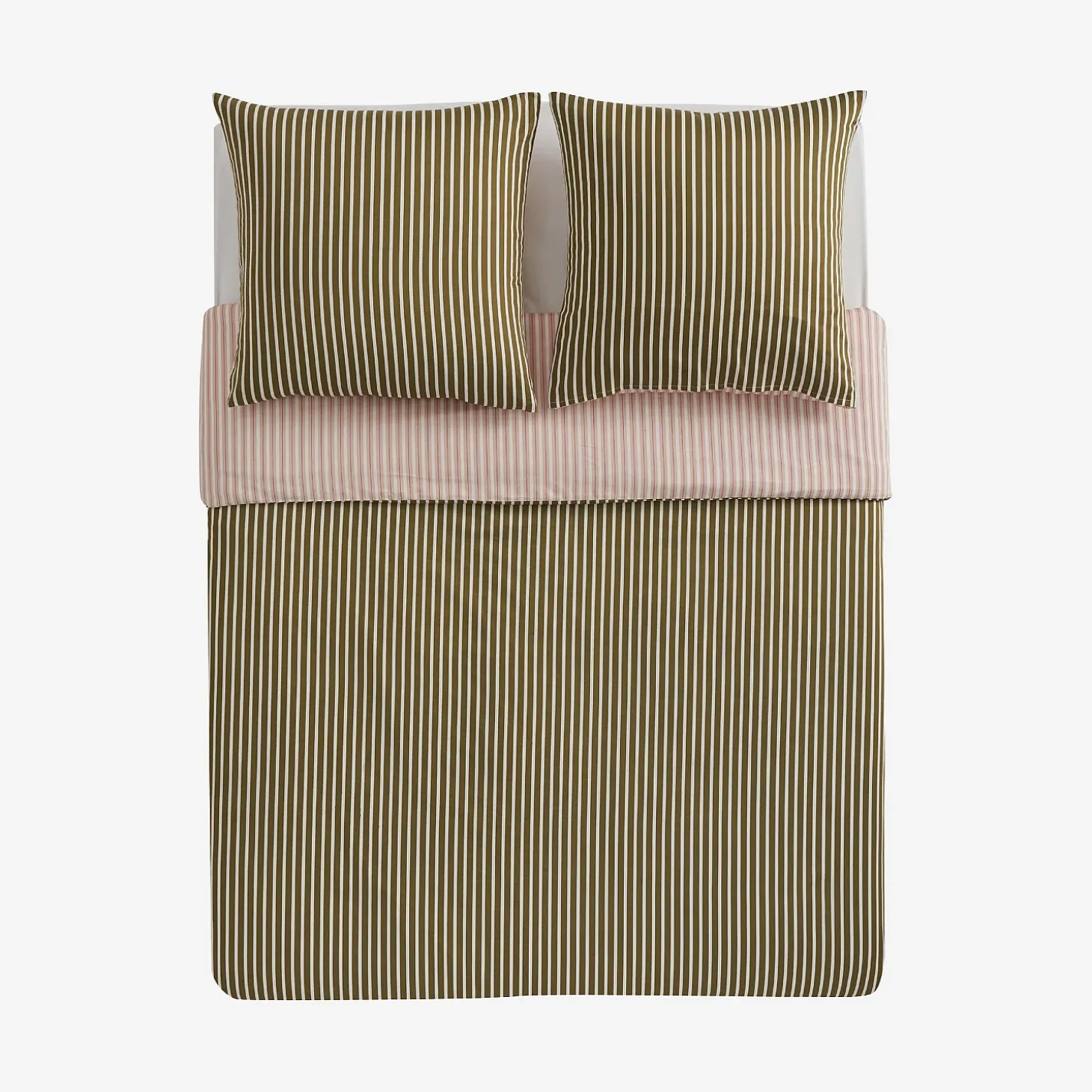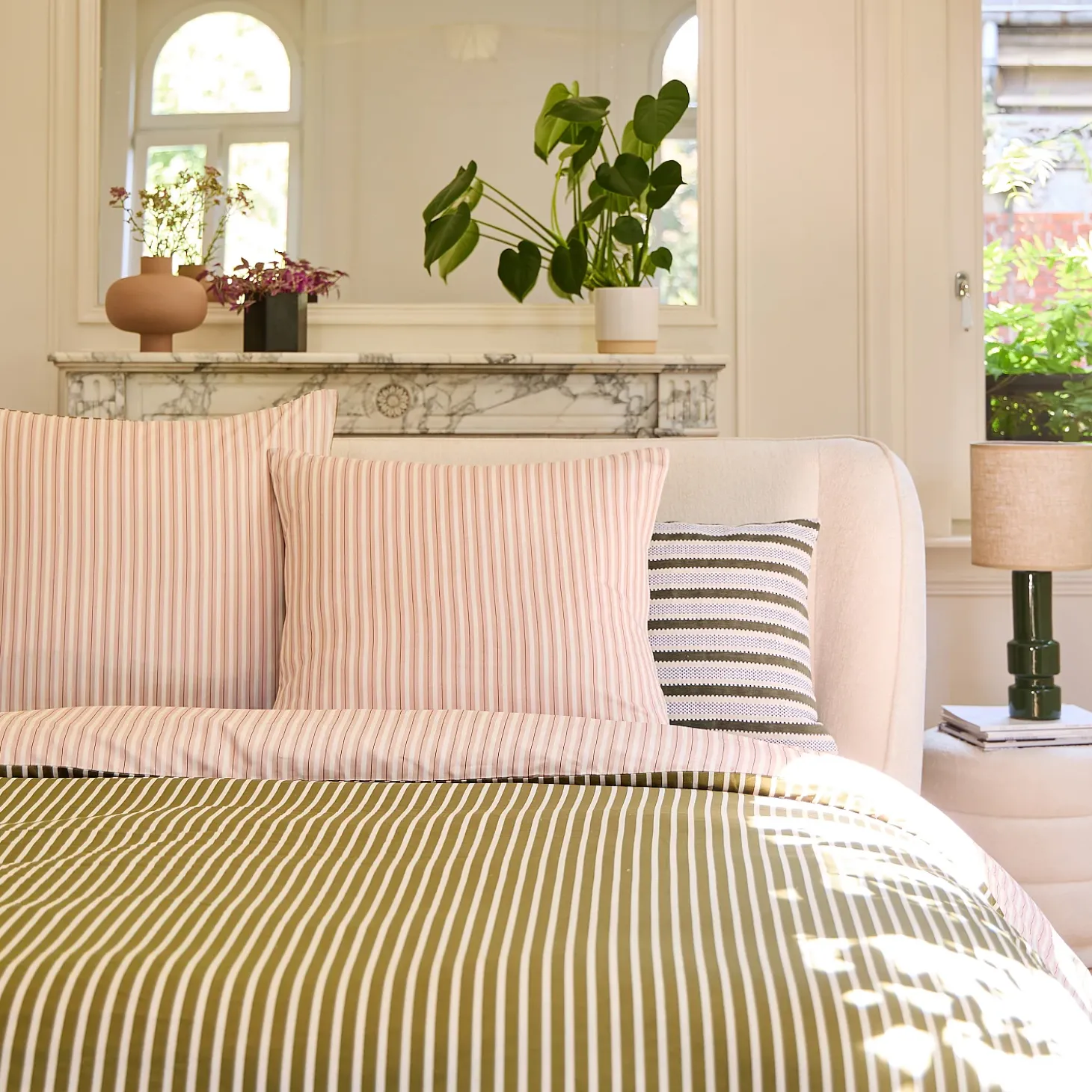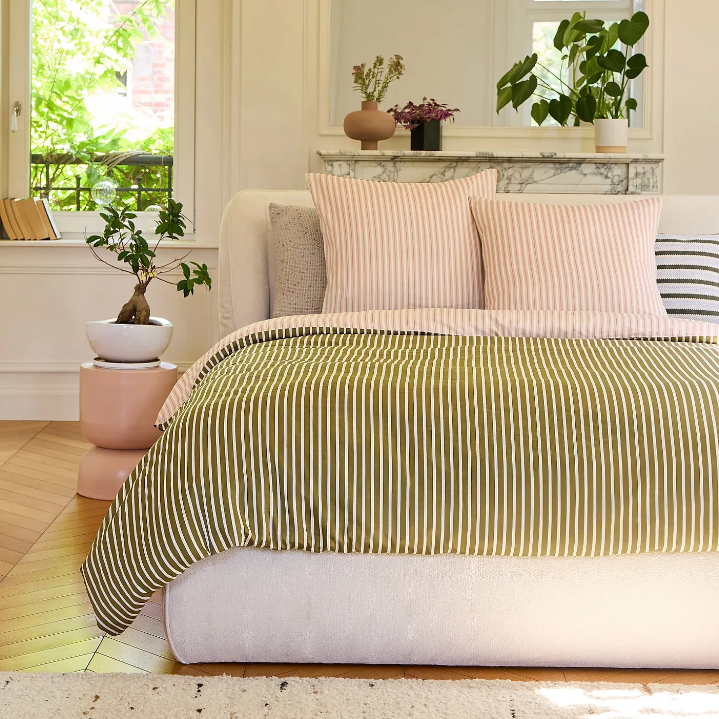 Sur le recto, les rayures vertes et écrues se déploient avec élégance, créant une harmonie visuelle à la fois moderne et apaisante. Au verso, le rose et l’écru s’entrelacent délicatement, apportant une touche de chaleur et de sérénité.