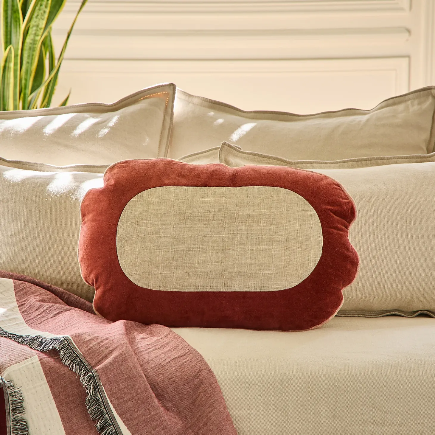 Avec sa forme allongée et ses matières naturelles, le coussin Bérénice joue la carte de l’élégance discrète.