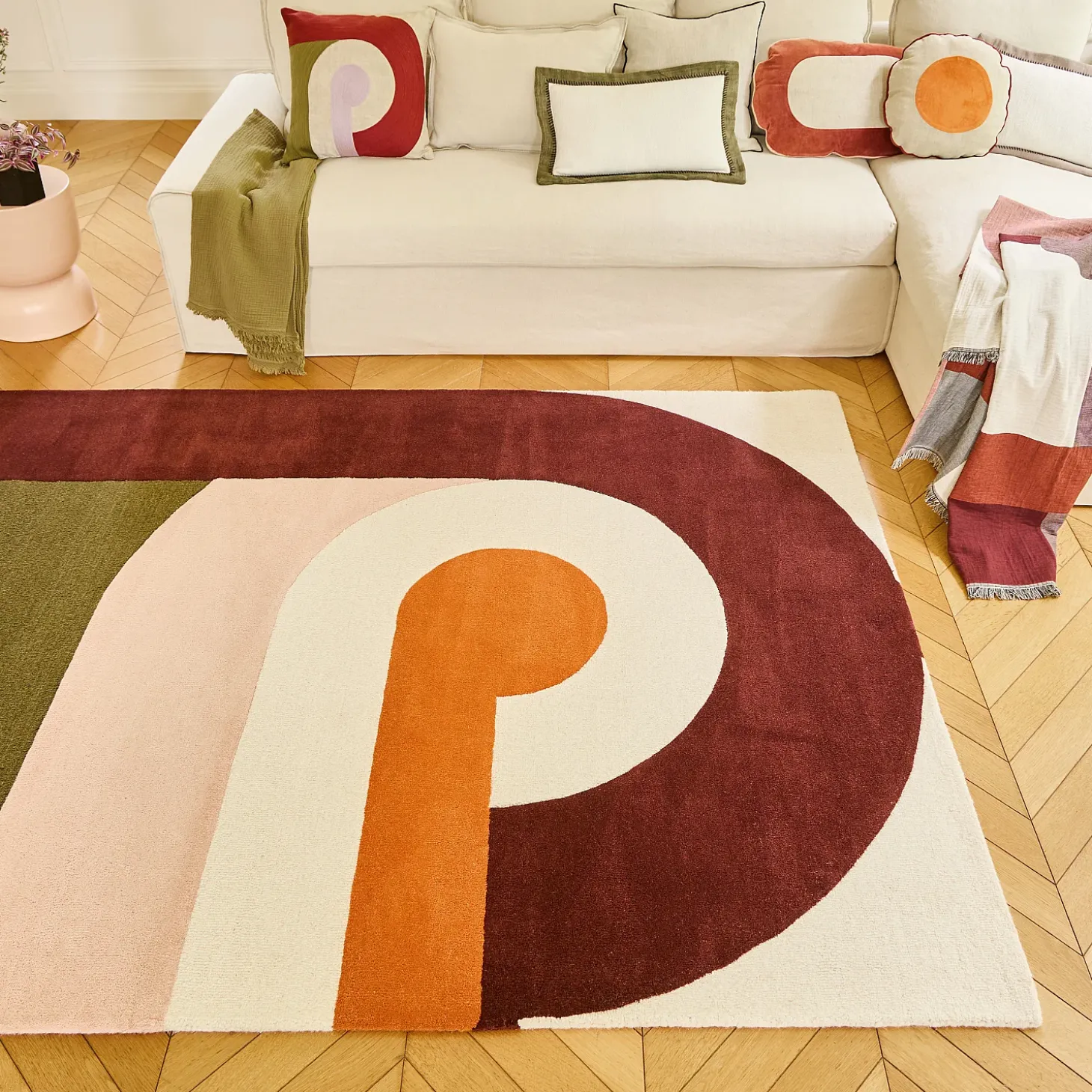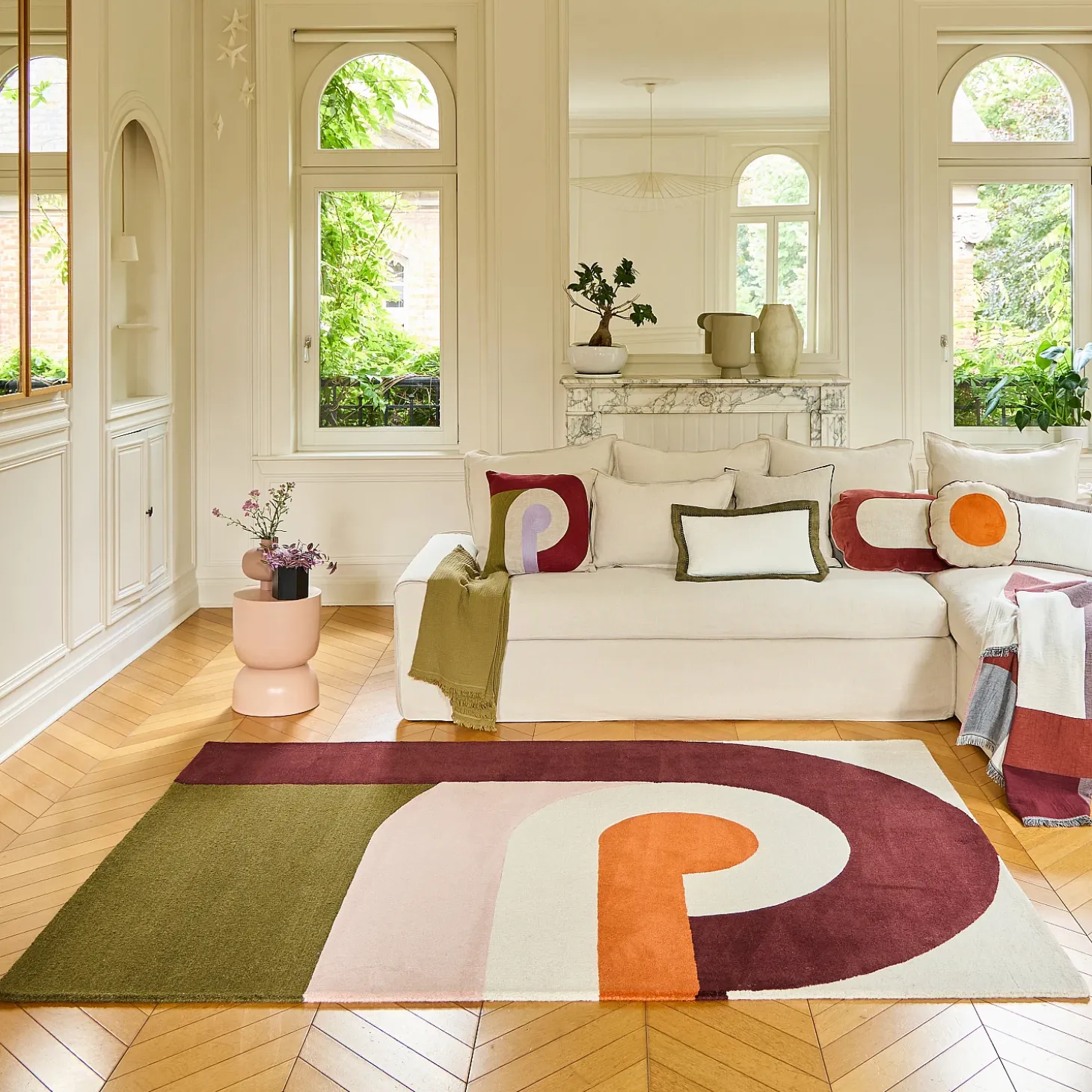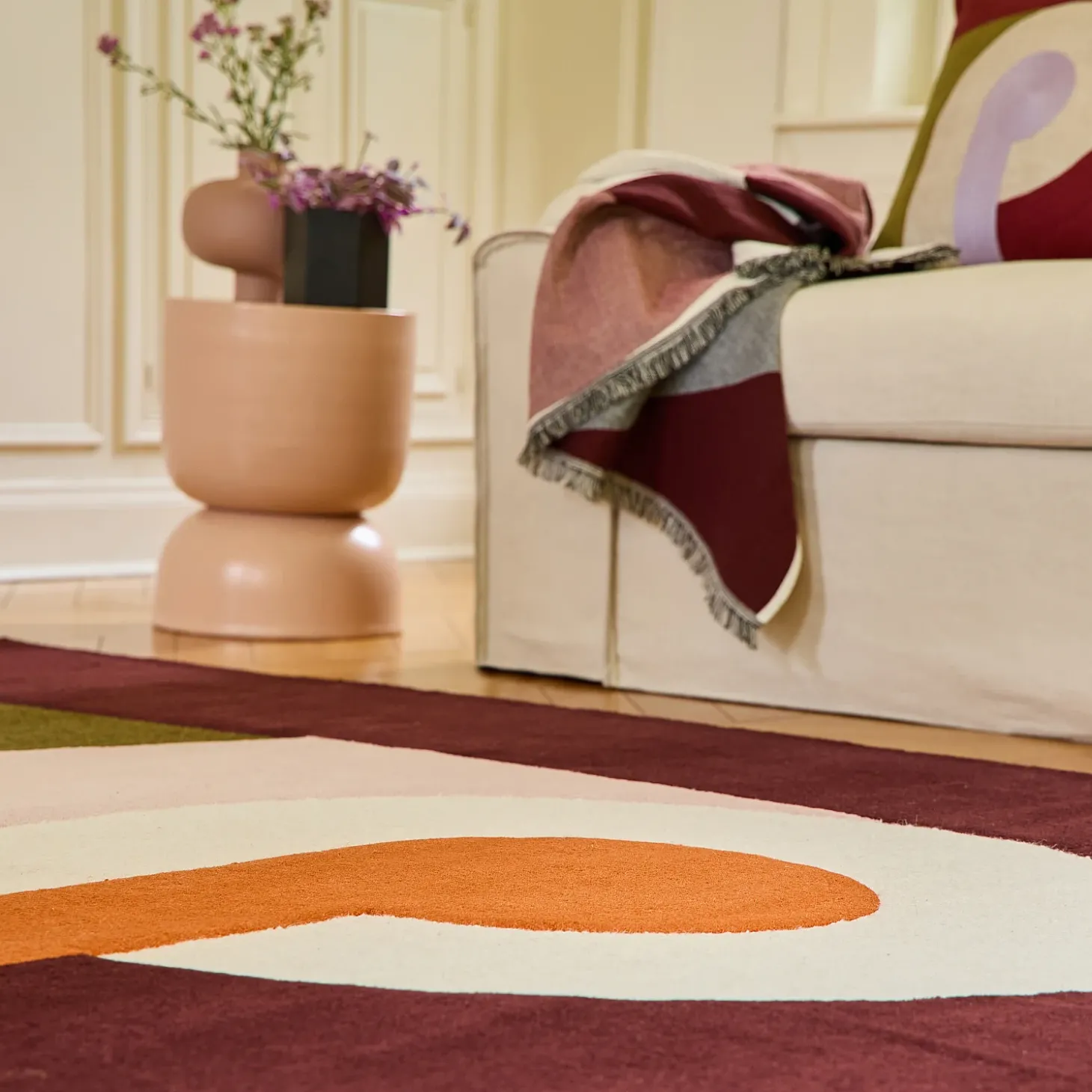 Le tapis Bonnie se distingue par un motif abstrait, évoquant des formes entrelacées qui suggèrent un jeu subtil entre ouverture et fermeture, comme une invitation à explorer des espaces secrets.