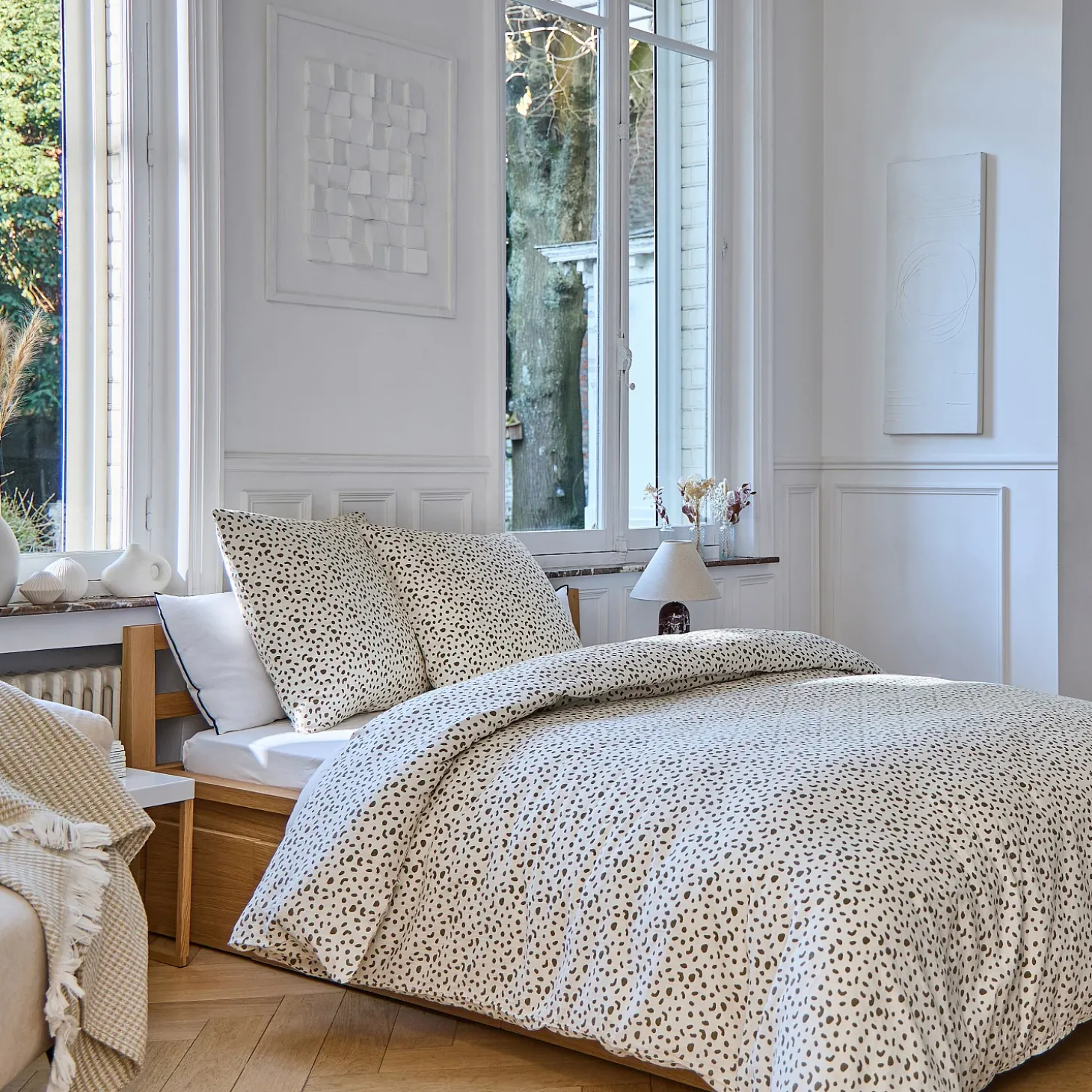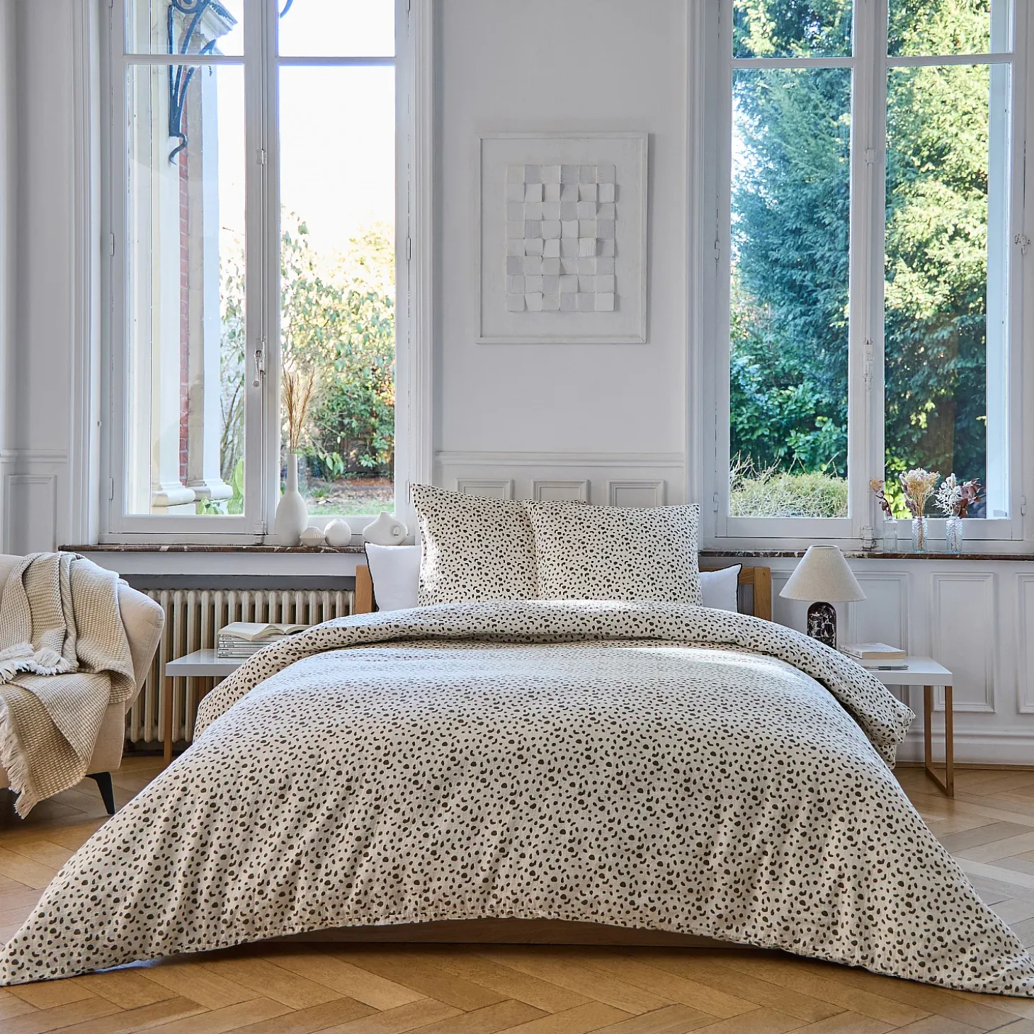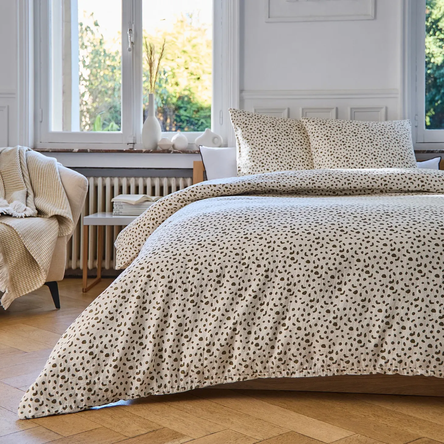 Conseils d’entretien : lavable en machine à 60°La parure de lit Briac joue sur la légèreté de la double gaze de coton et un motif à pois revisité pour créer une atmosphère douce et contemporaine. Un équilibre subtil entre modernité, confort et délicatesse.