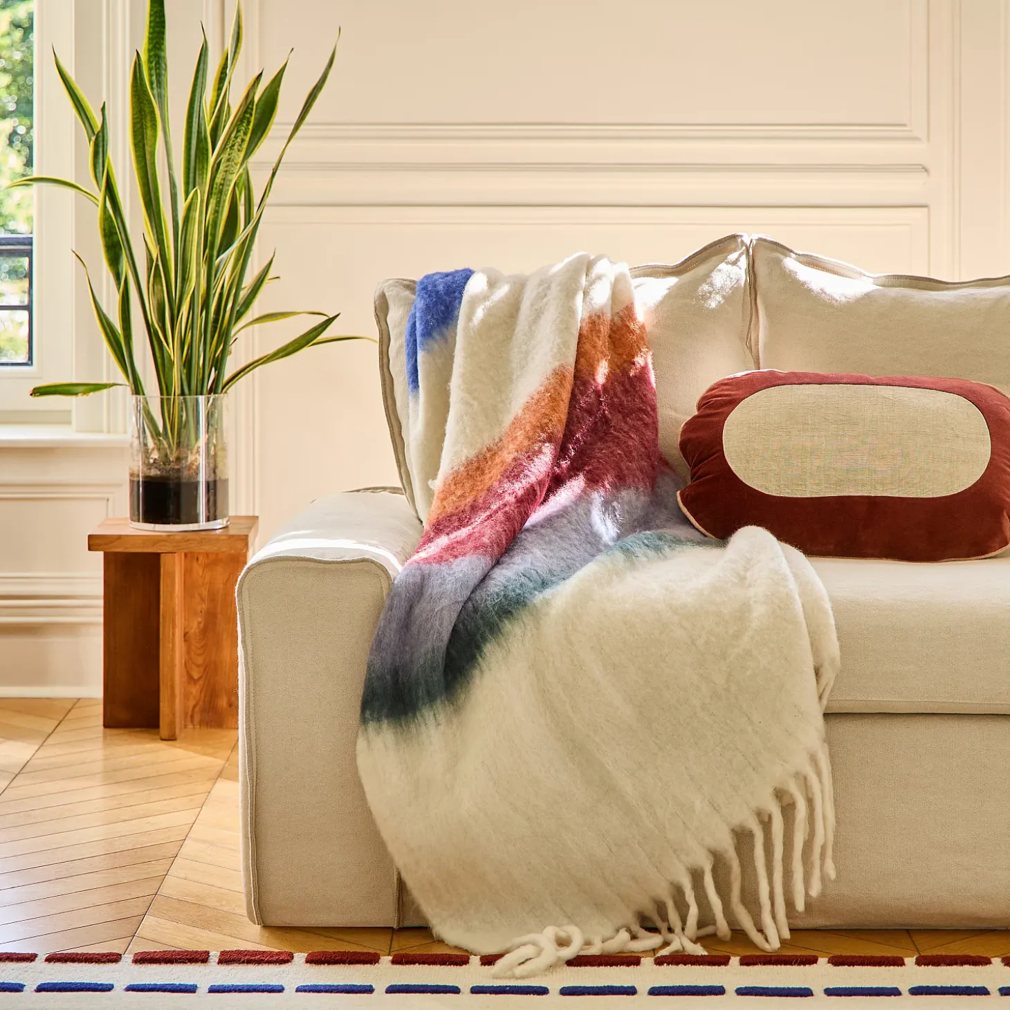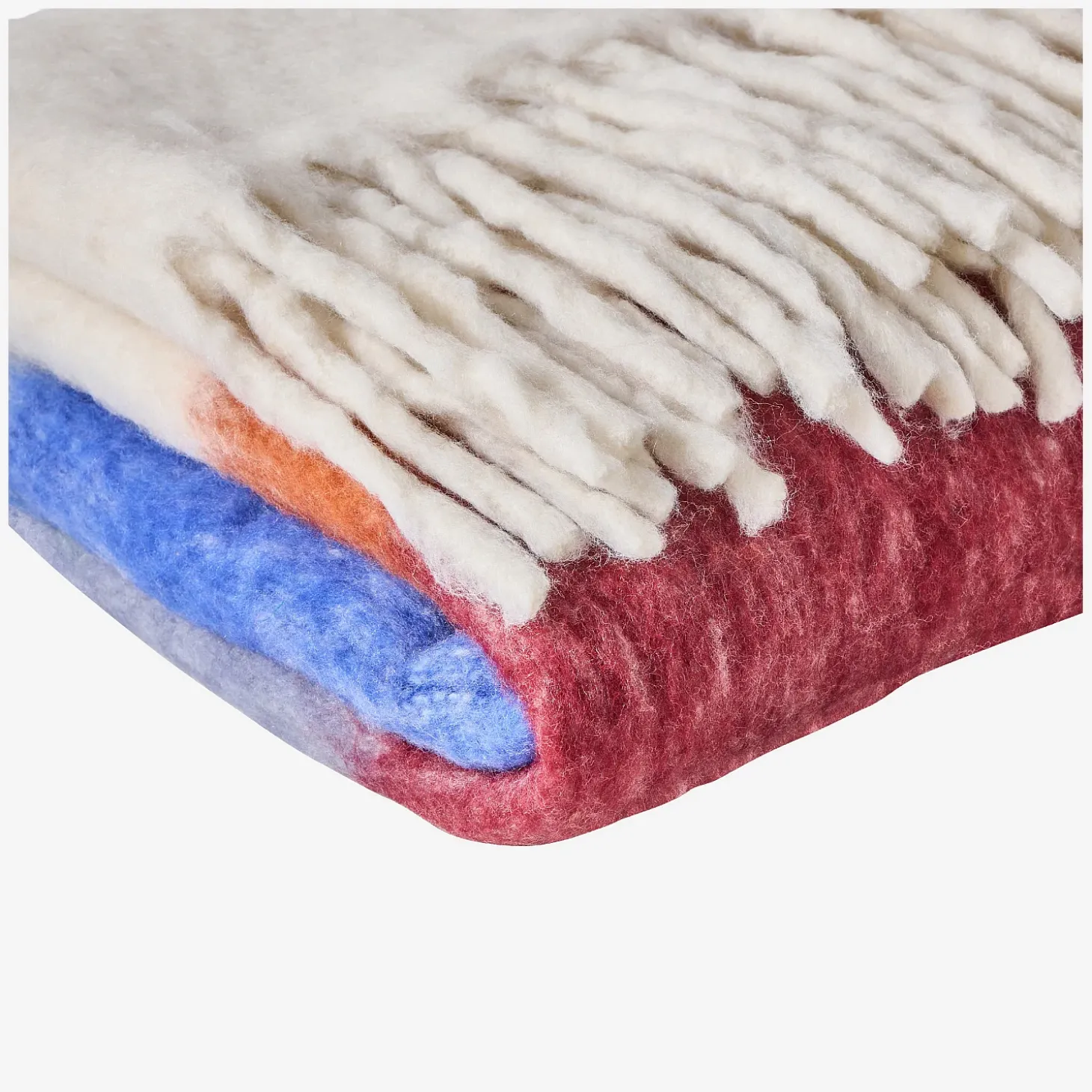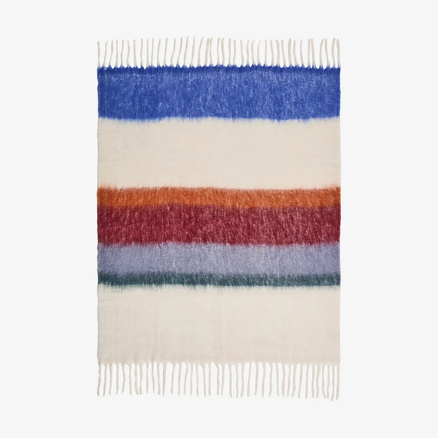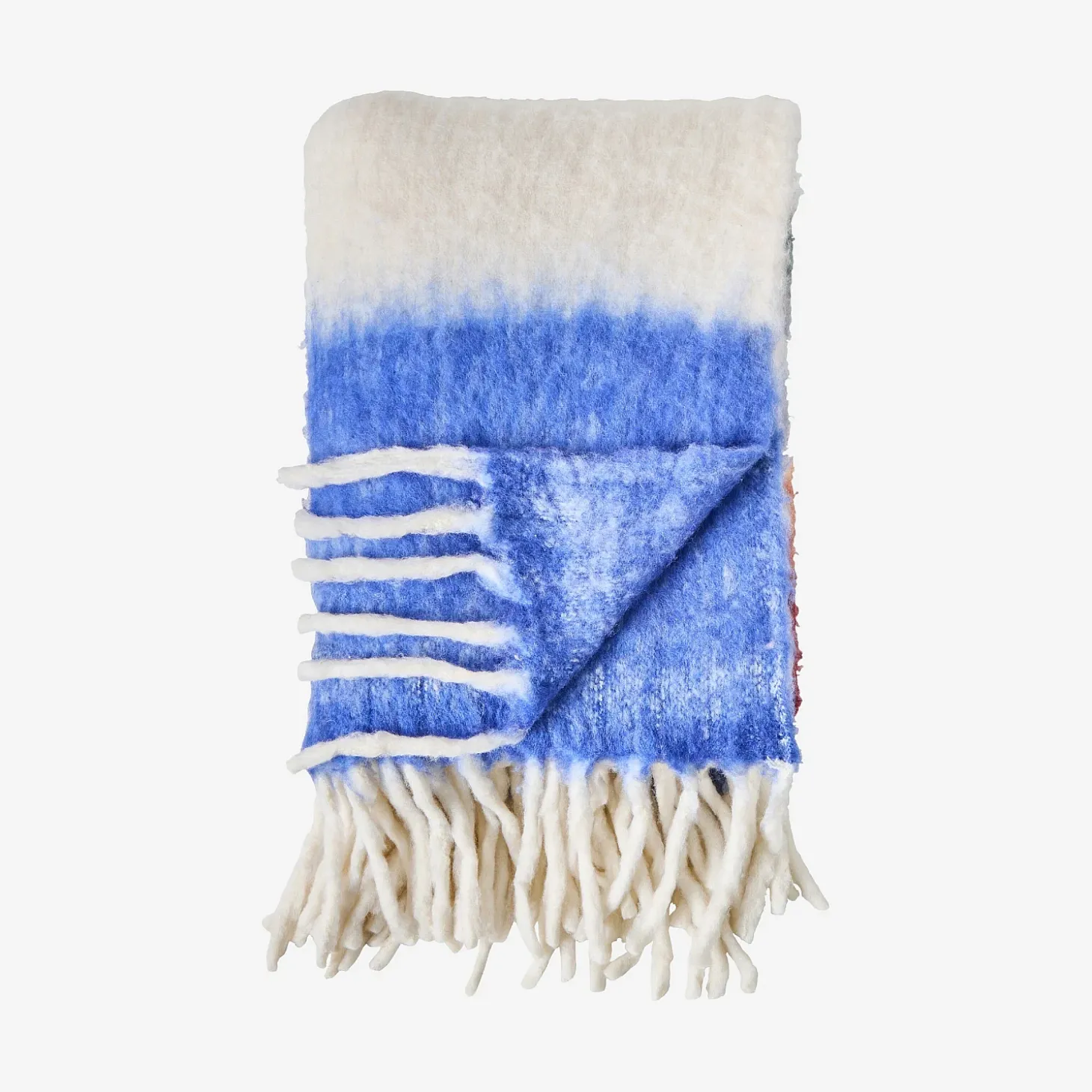 26% laine, 63% acrylique, 11% NylonRayures fondues et nuances colorées s’entremêlent pour créer un plaid tout en douceur, où l’on souhaite se blottir chaleureusement.