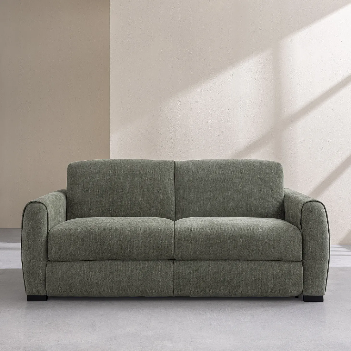 Le canapé convertible 2 places Canberra est habillé d’un tissu Lugano chenillé doux, décliné dans un vert olive élégant et naturel. Allié pratique pour un usage serein, ce revêtement déperlant garantit une protection efficace contre les éclaboussures.