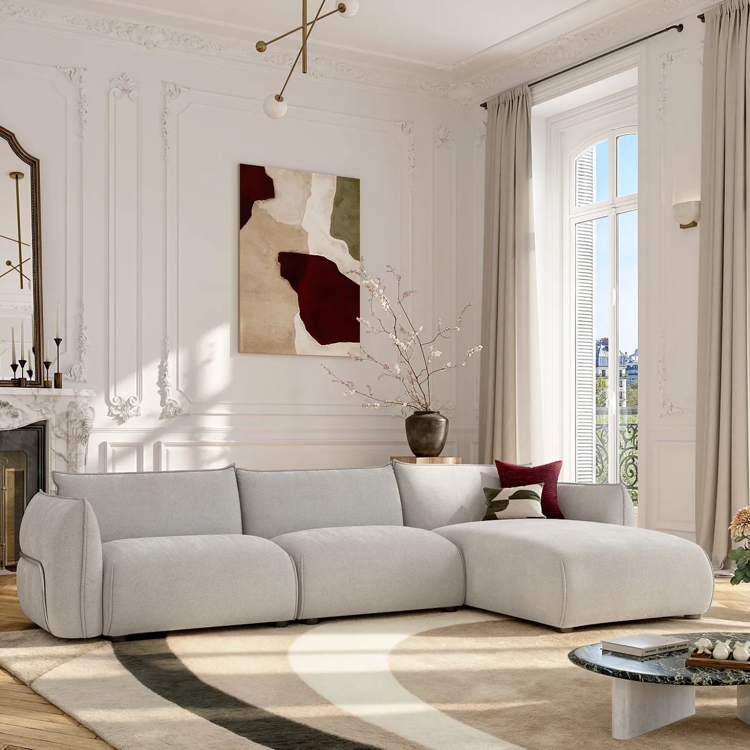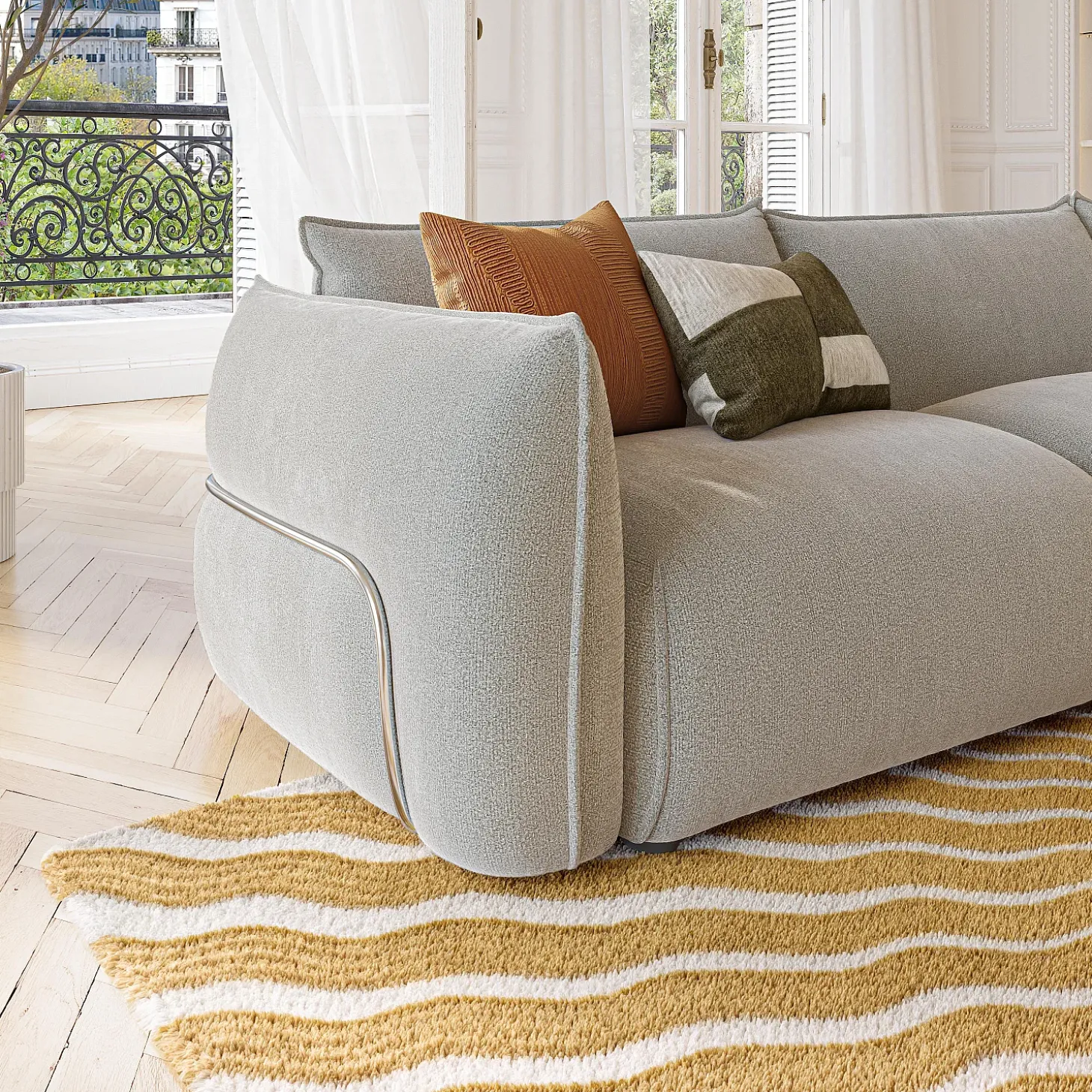 Système de fixation : crochets métalliques situées sur les modules permettant de les solidariser et de maintenir l’ensemble fermementTissu texturé, lignes épurées et assise spacieuse font de Céleste une pièce phare du salon. Une création qui sublime naturellement les intérieurs contemporains.
