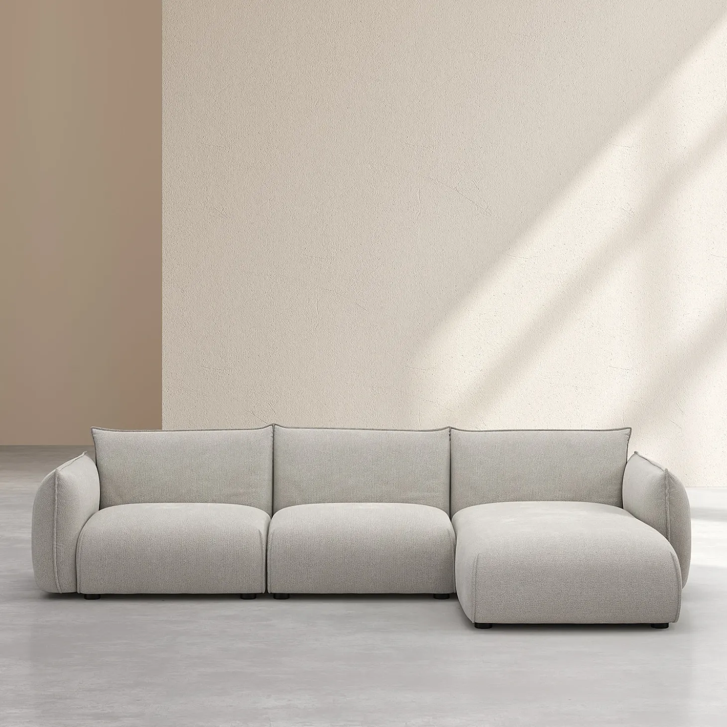 Le canapé d’angle droit Celeste en tissu gris perle apporte un subtil mélange d’élégance et de modernité. Son coloris discret crée une ambiance intemporelle apaisante.