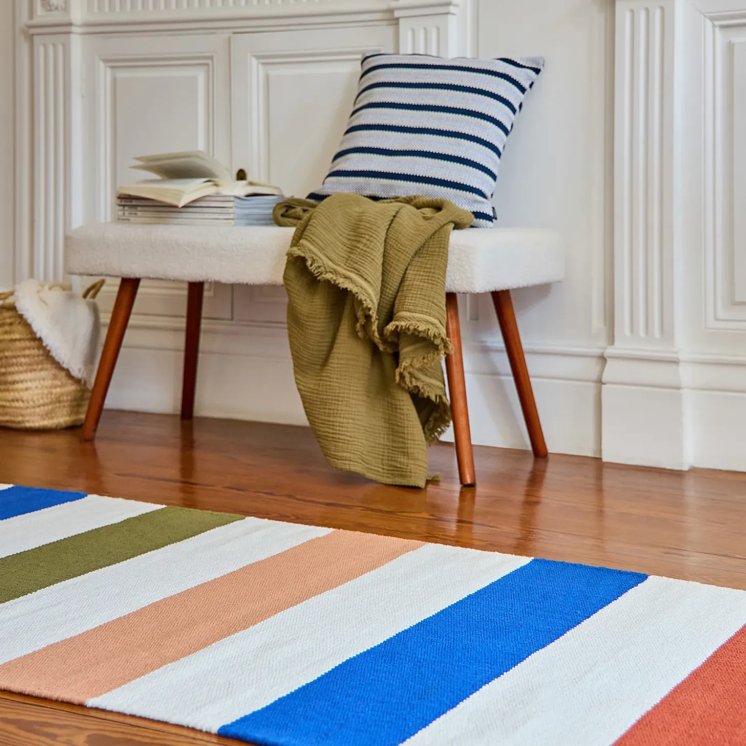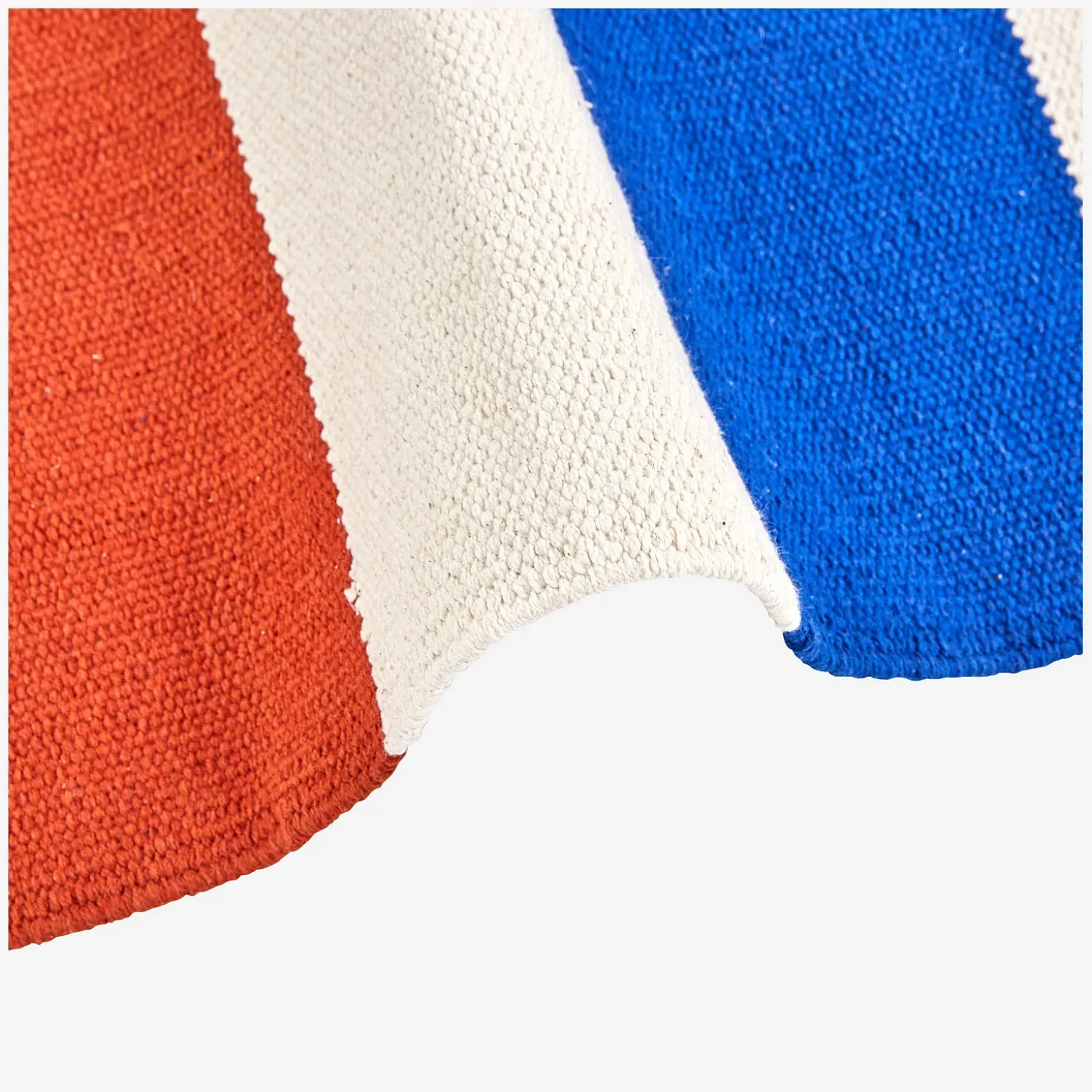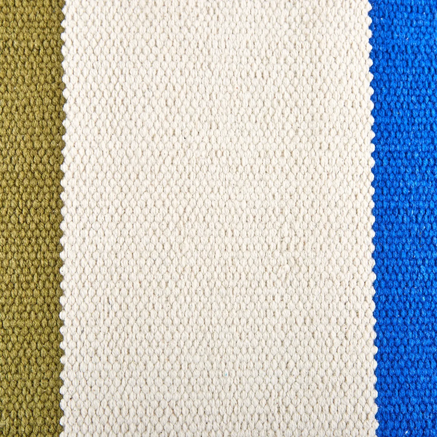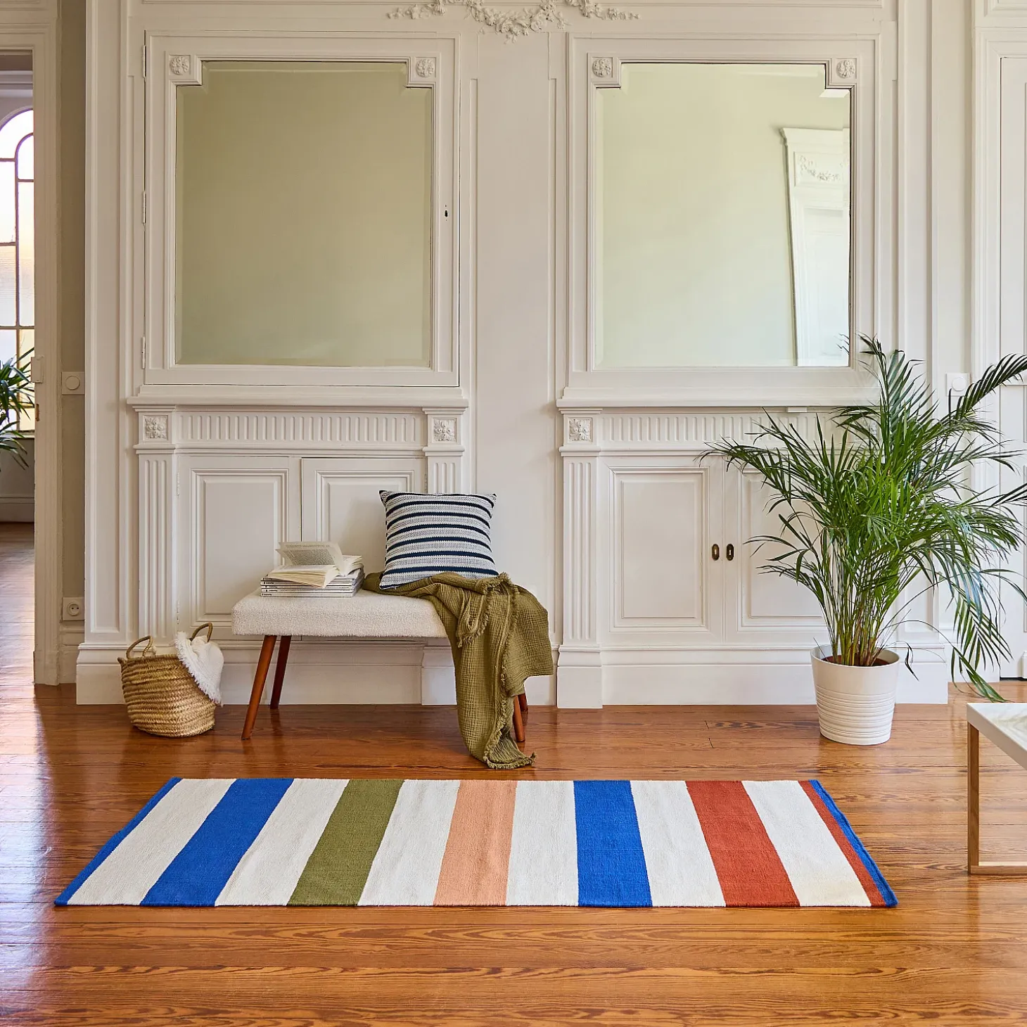 Le tapis Claudie en coton, avec ses larges rayures bleu électrique, apporte une énergie moderne et rafraîchissante aux intérieurs.