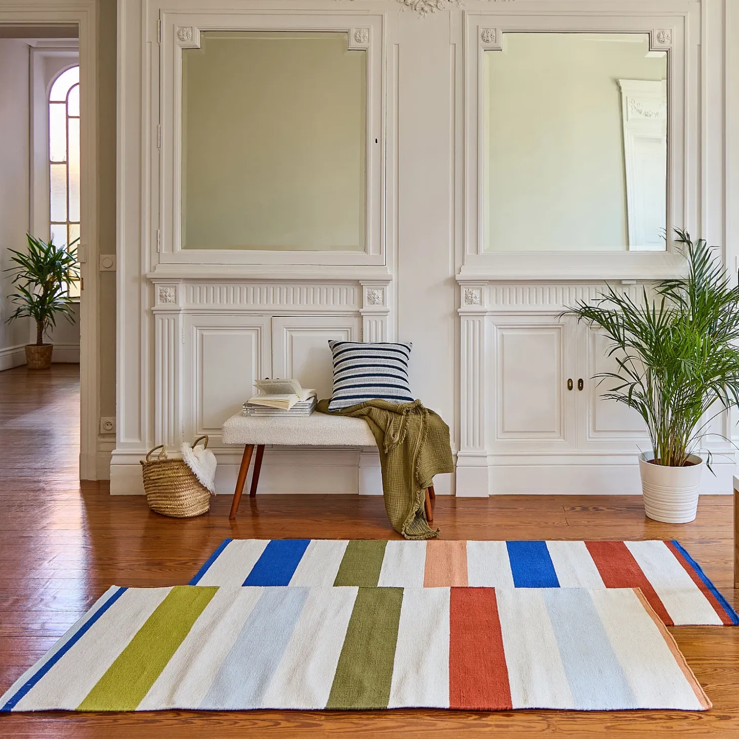 Conseils d’entretien : nettoyer les tâches avec un chiffon humide, laver à secAvec ses larges rayures inspirées des grands espaces, le tapis Claudie insuffle une énergie douce et naturelle à la maison. En coton léger, il conjugue modernité graphique et simplicité apaisante.