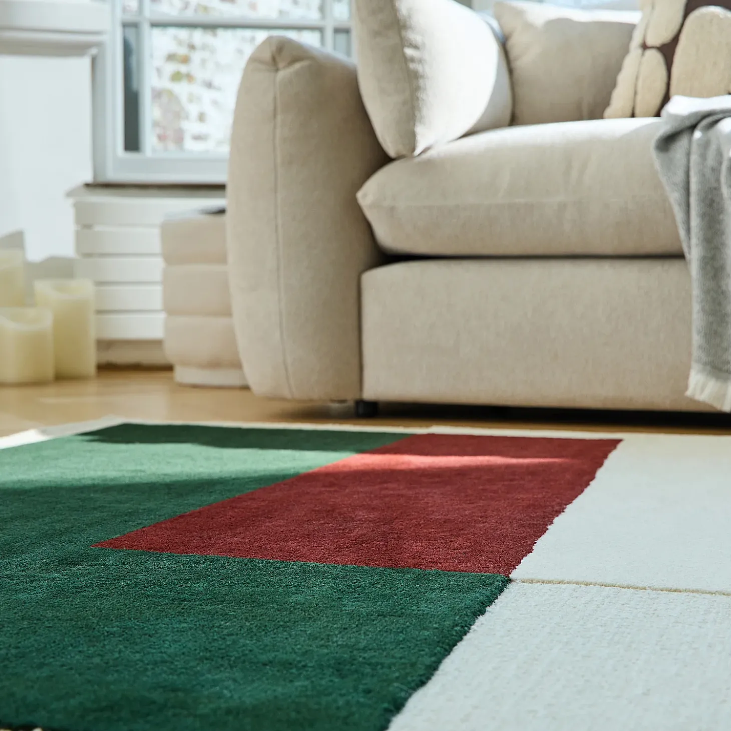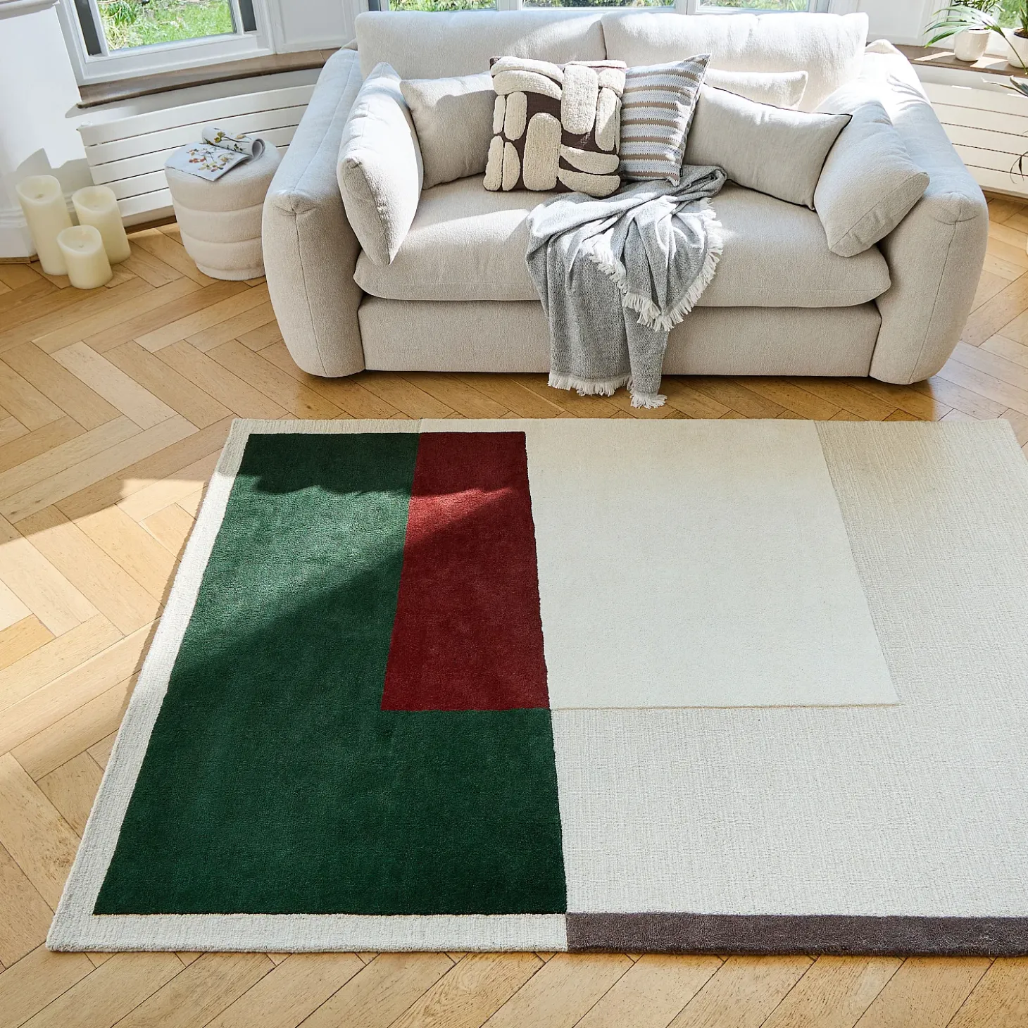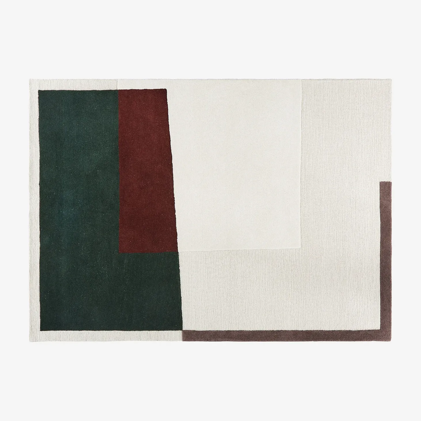 Confectionné en laine tuftée main, ce tapis met en valeur un motif géométrique, notamment composé d’un vert forêt profond qui contraste avec des teintes sobres et naturelles. Sa texture douce et dense renforce l’impact visuel de ce dessin structuré, tout en apportant confort et chaleur à l’espace.