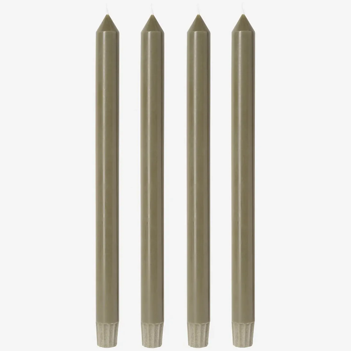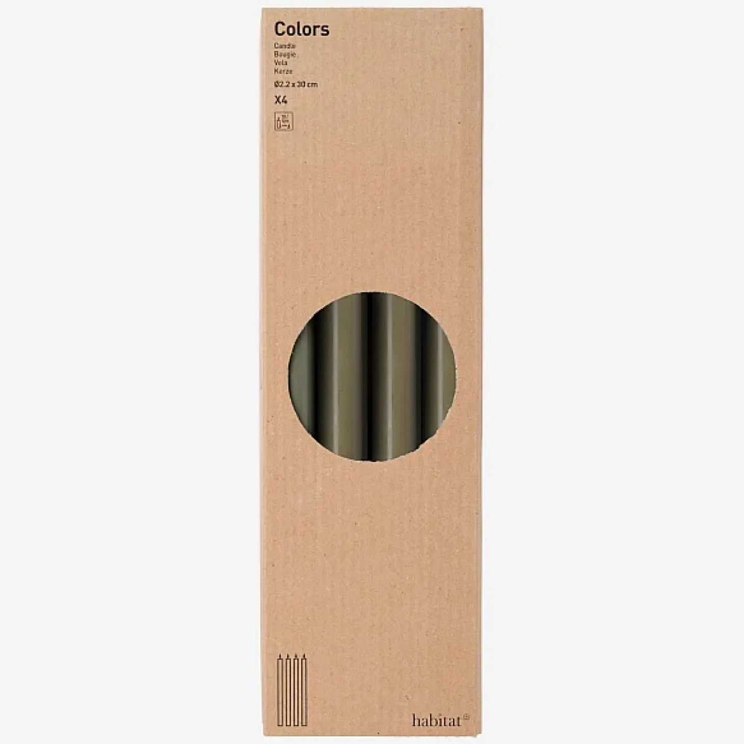 Les bougies cierges Colors de couleur kaki font 30 cm de hauteur. Elles sont disponibles en lot de 4.