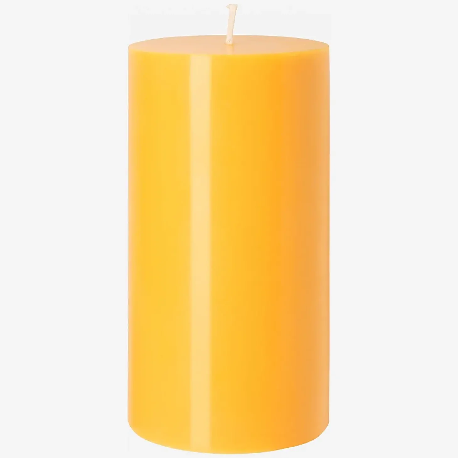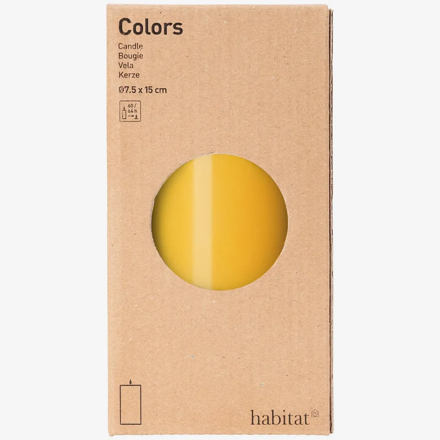 La bougie cylindrique Colors de couleur jaune mesure 7,5 cm de diamètre et 15 cm de hauteur.