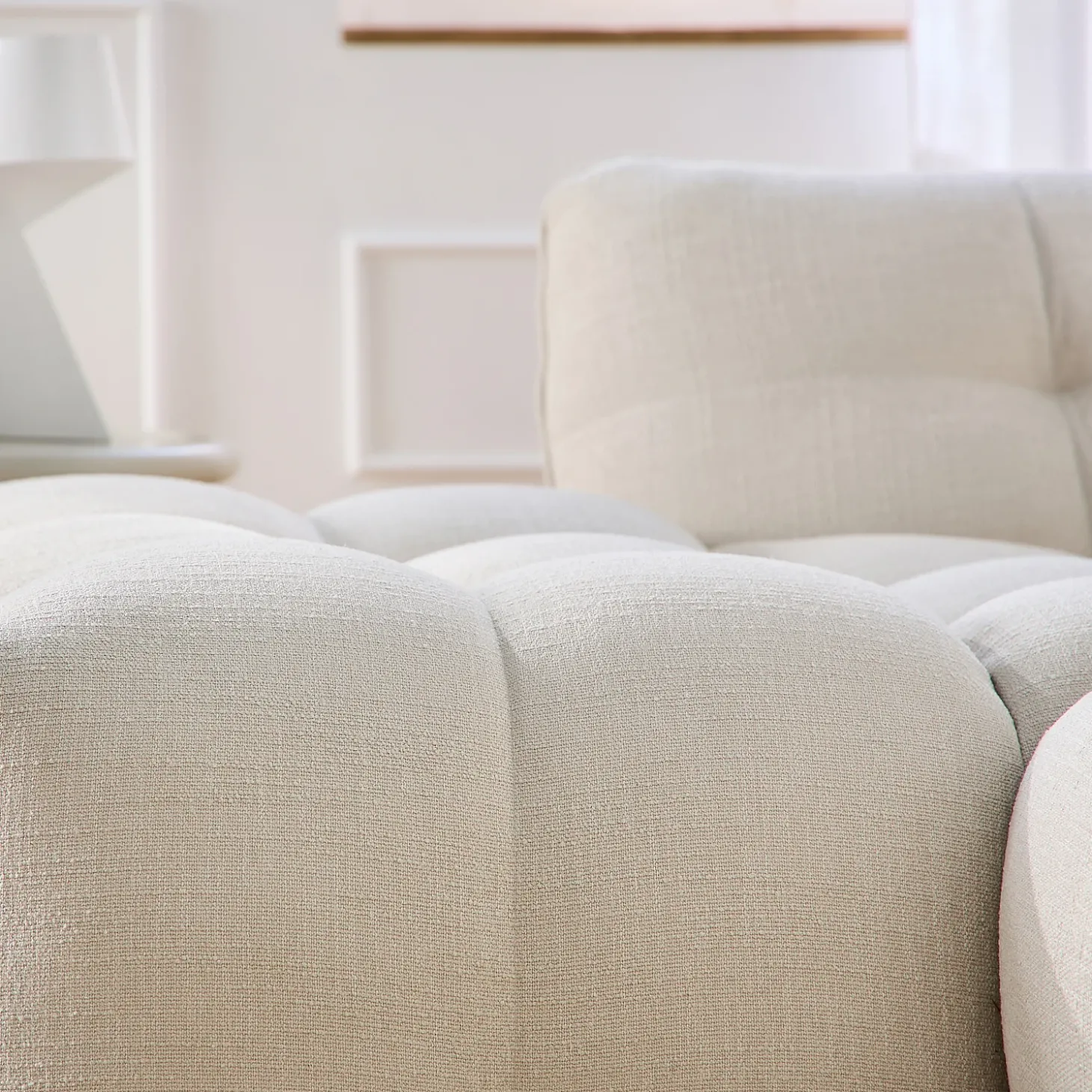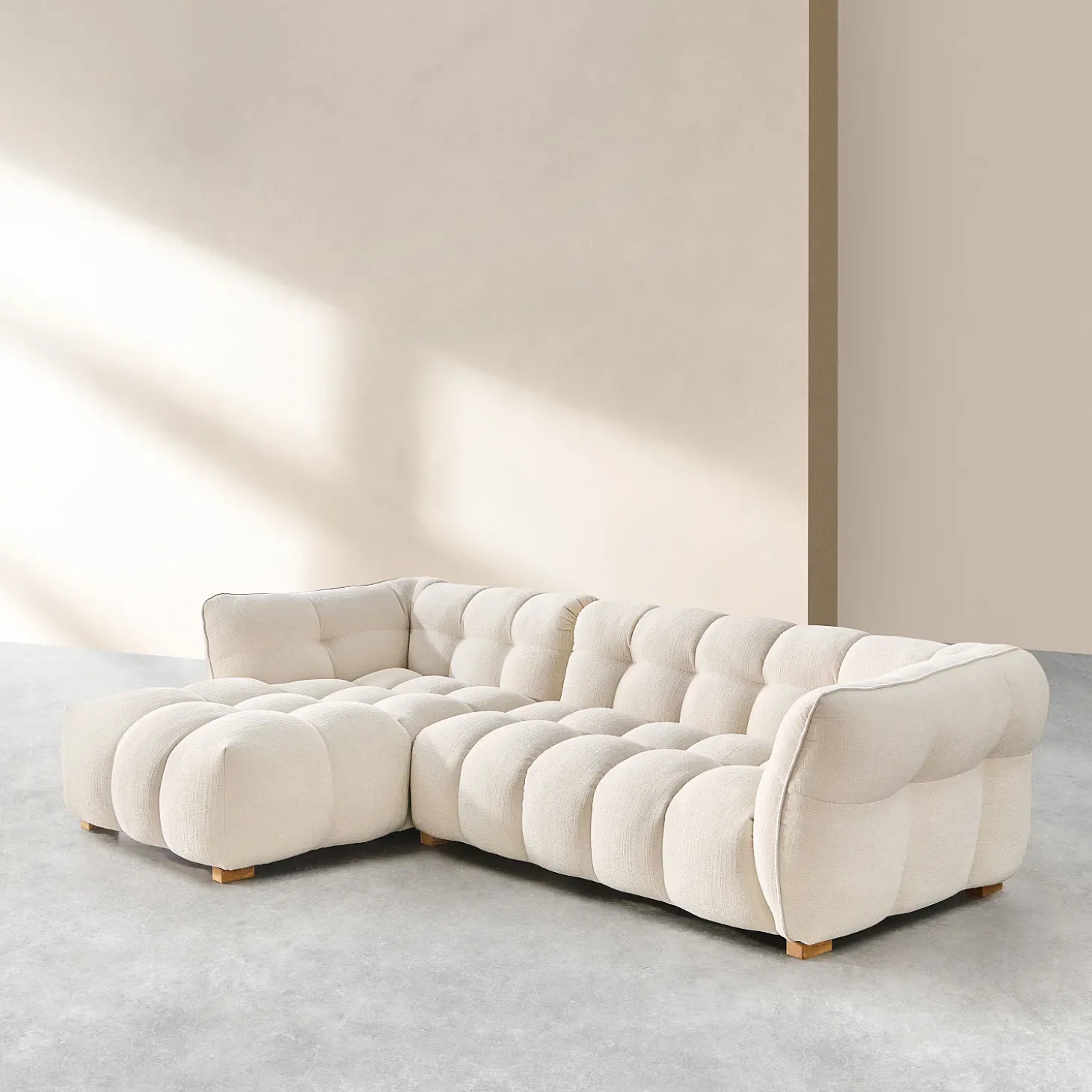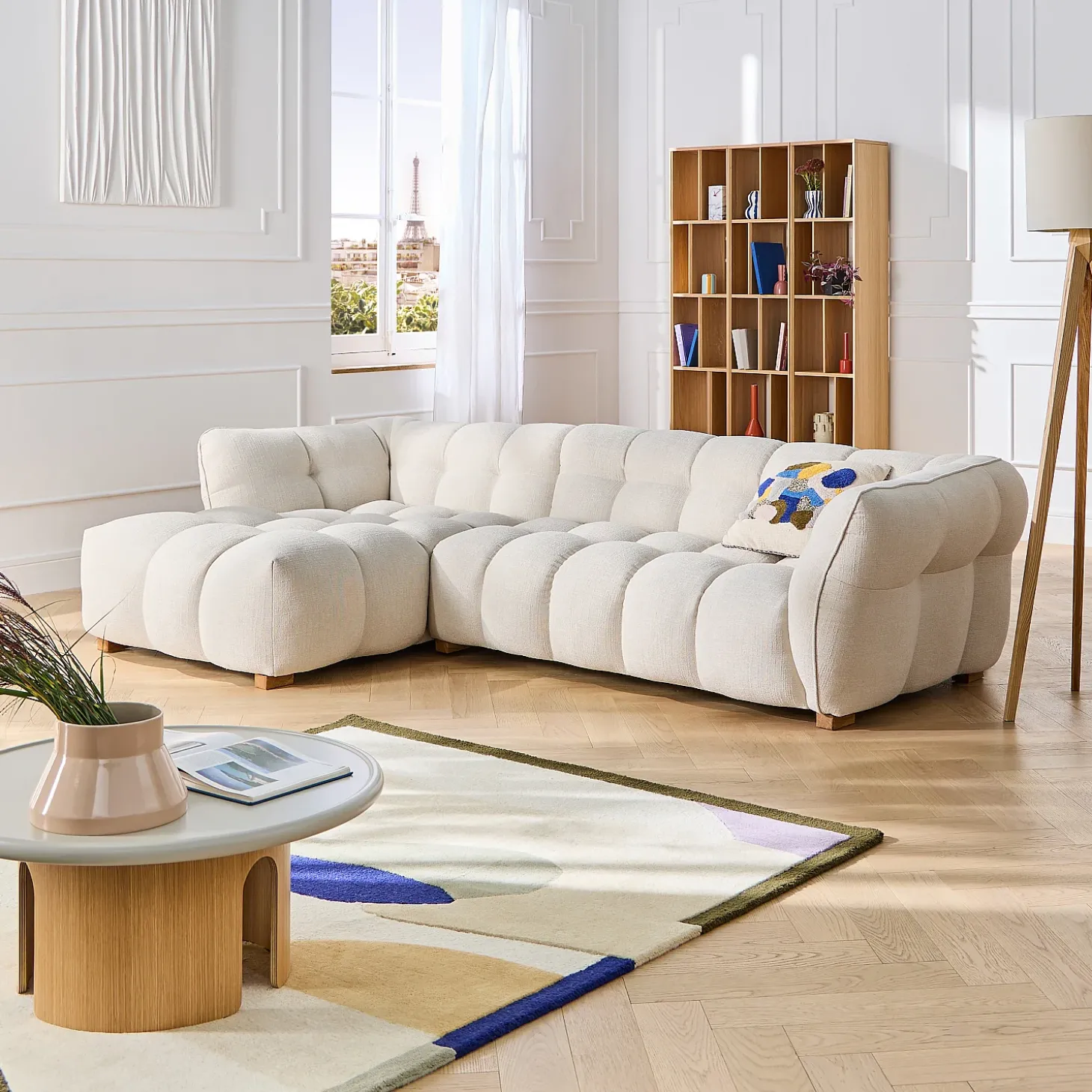 Le canapé d’angle gauche Dalvi est sublimé par un tissu en bouclette courte Mira couleur ivoire, qui souligne ses formes rebondies et son allure singulière.