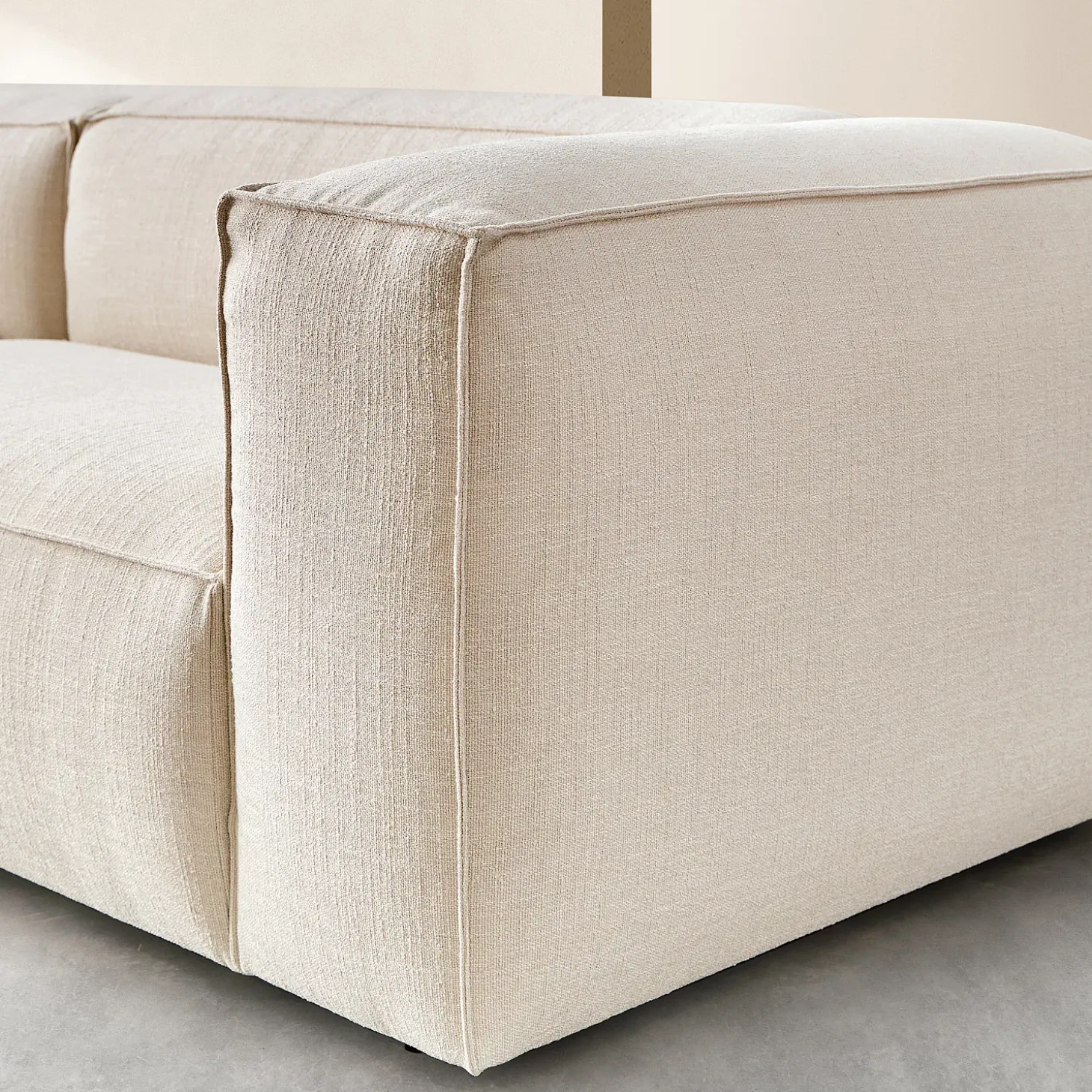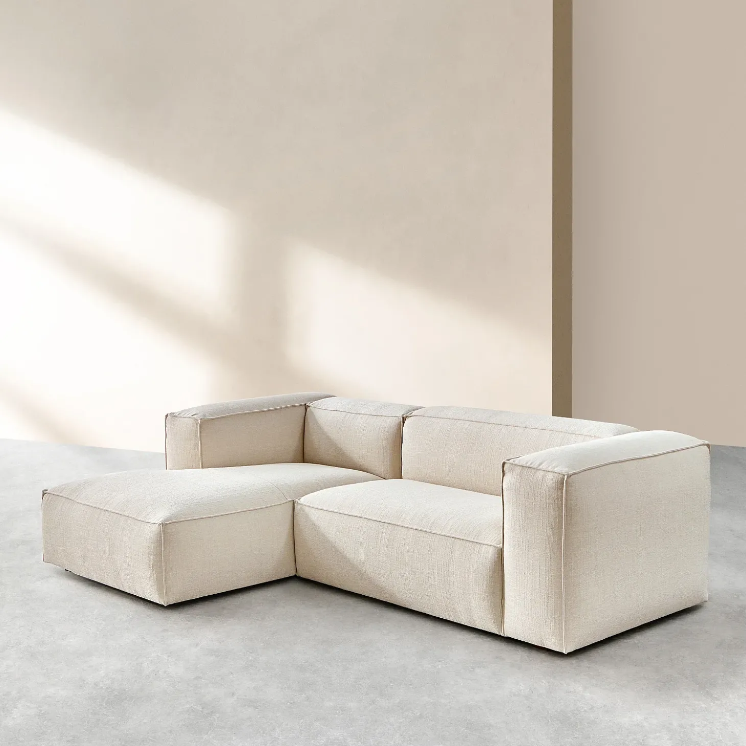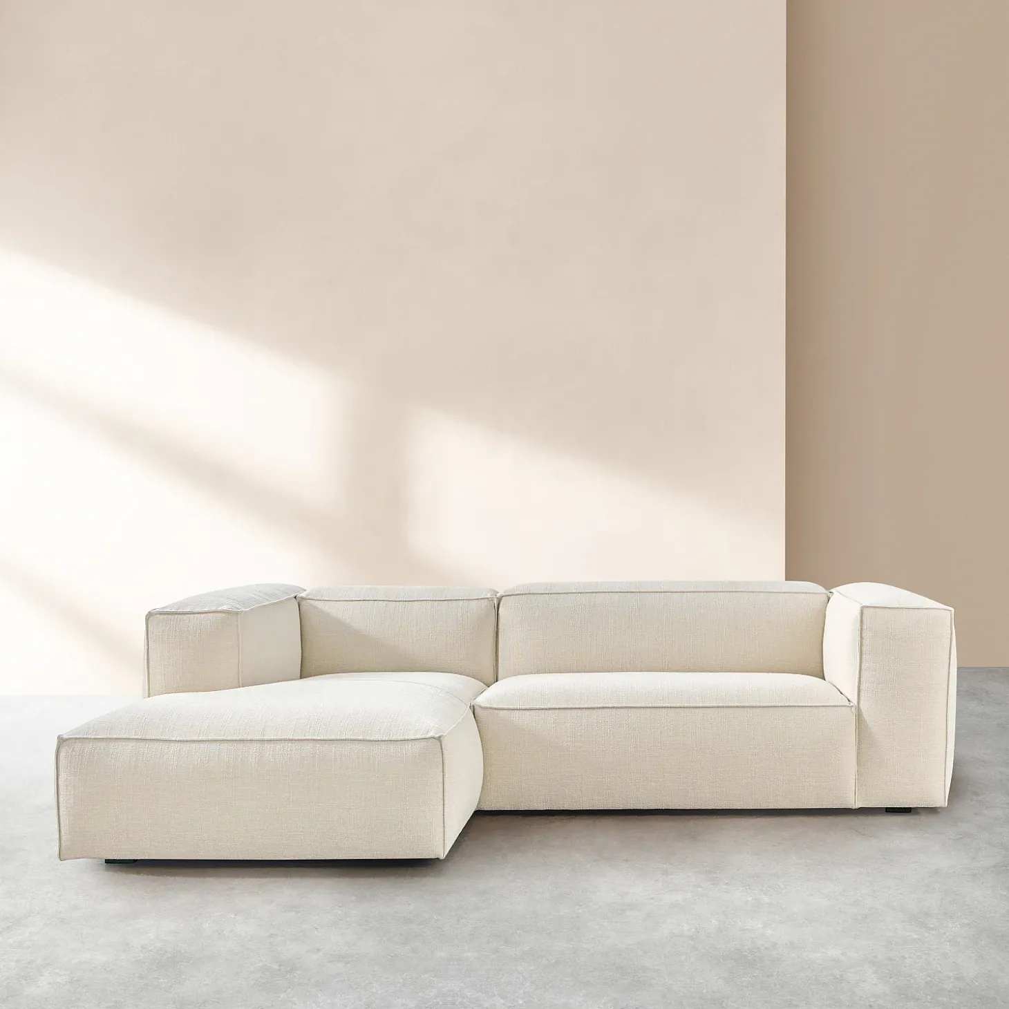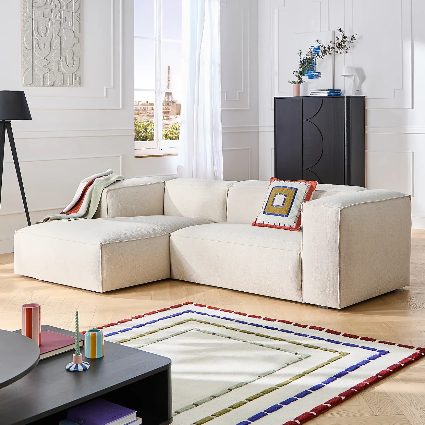 Le canapé d’angle gauche Edwin s’habille d’un tissu Mira en bouclette courte. Ce revêtement tendance offre un toucher texturé chaleureux et sensoriel. Sa déclinaison en coloris ivoire reflète la lumière, et prend subtilement place au coeur du foyer avec élégance et douceur.