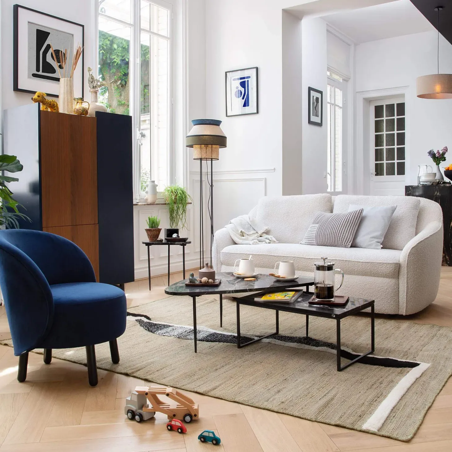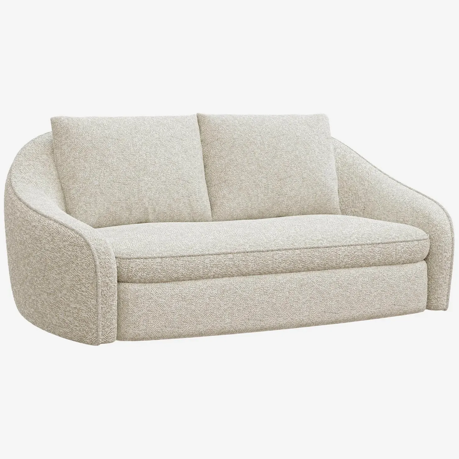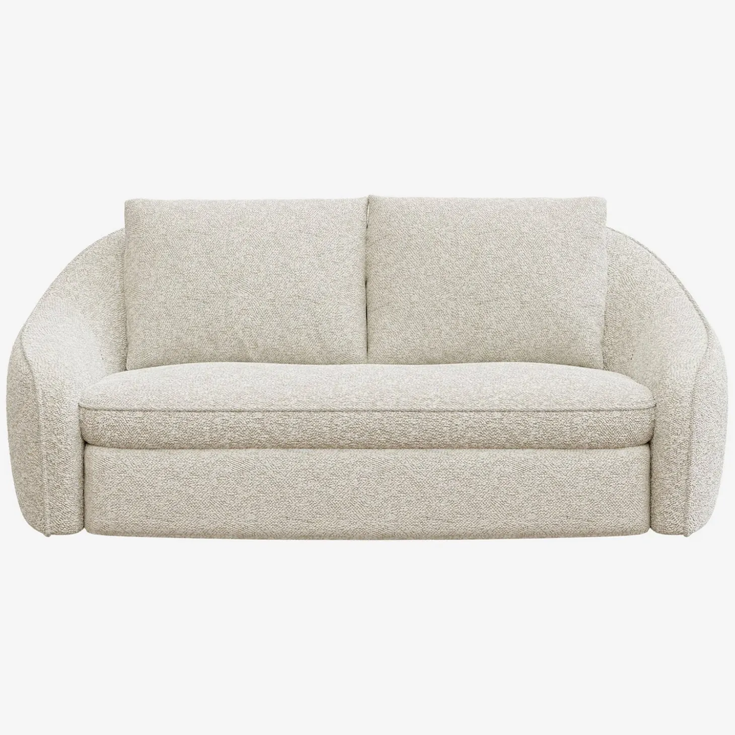 Cette assise tire son élégance de son revêtement de couleur beige à la finition bouclette et au toucher texturé. Son dossier et ses accoudoirs arrondis lui confèrent son côté enveloppant, très cosy. Aussi beau de face que de dos, il s’installe avantageusement au centre d’une pièce.