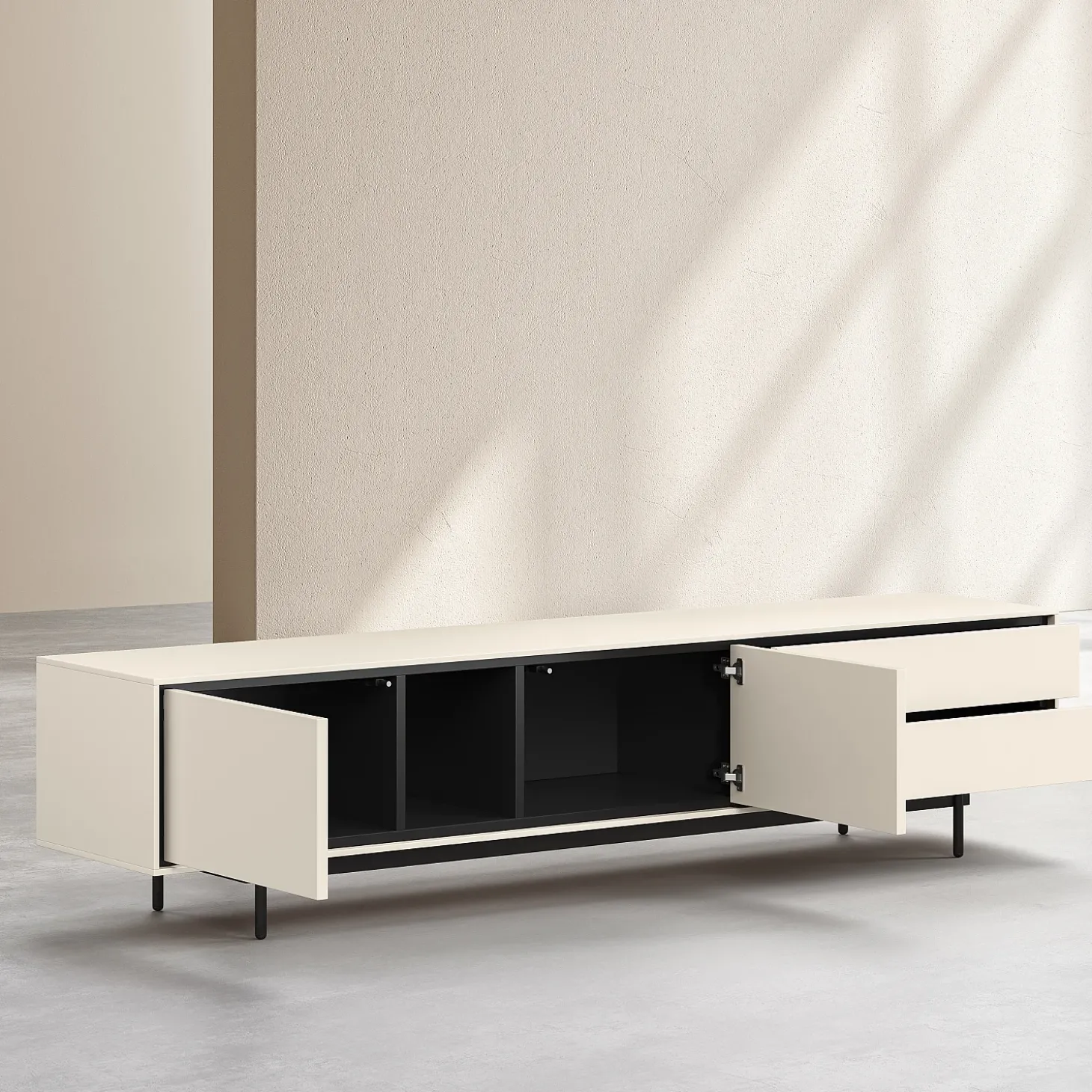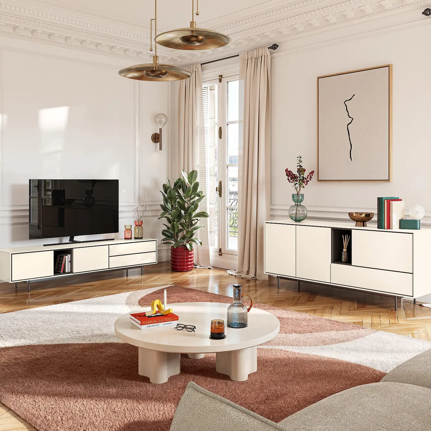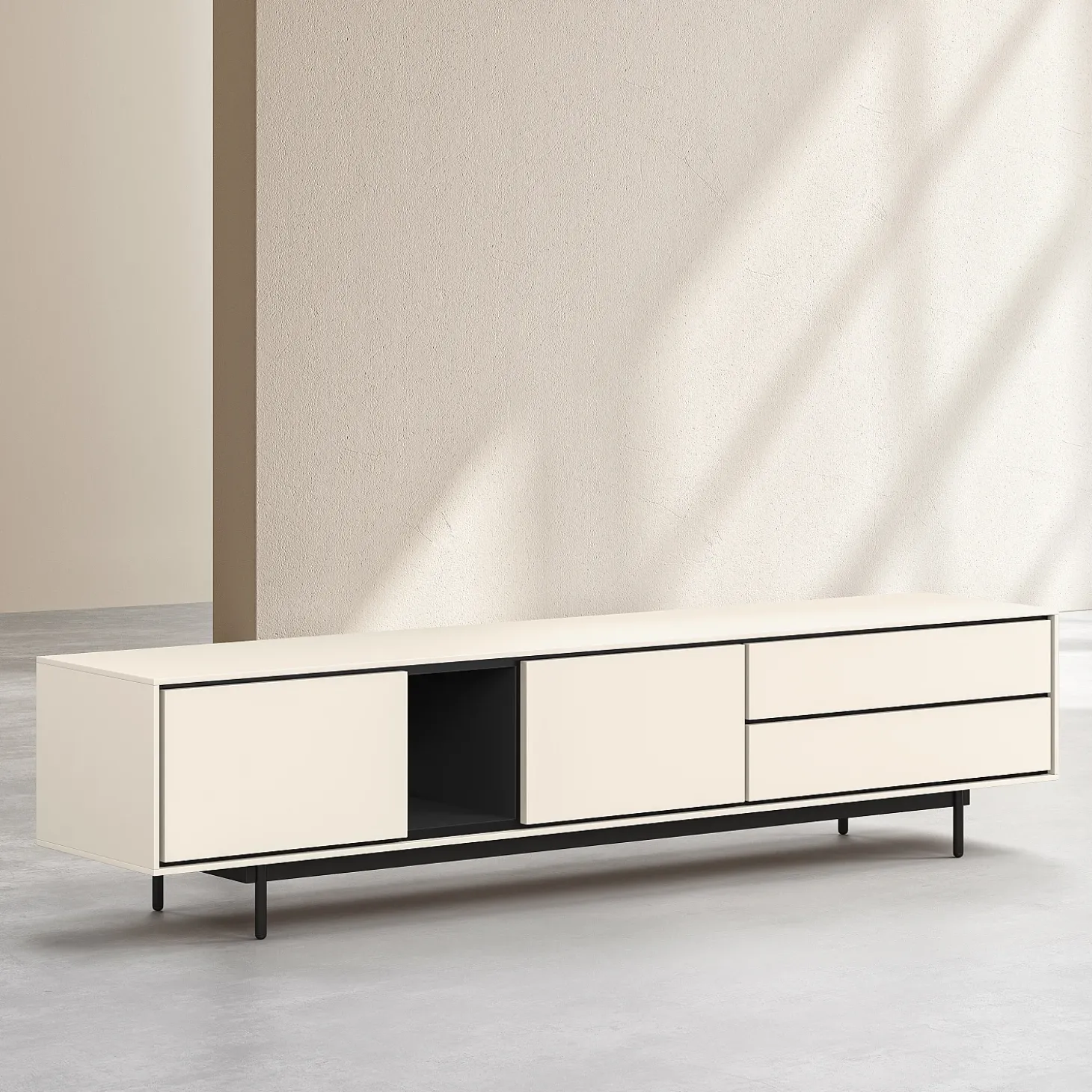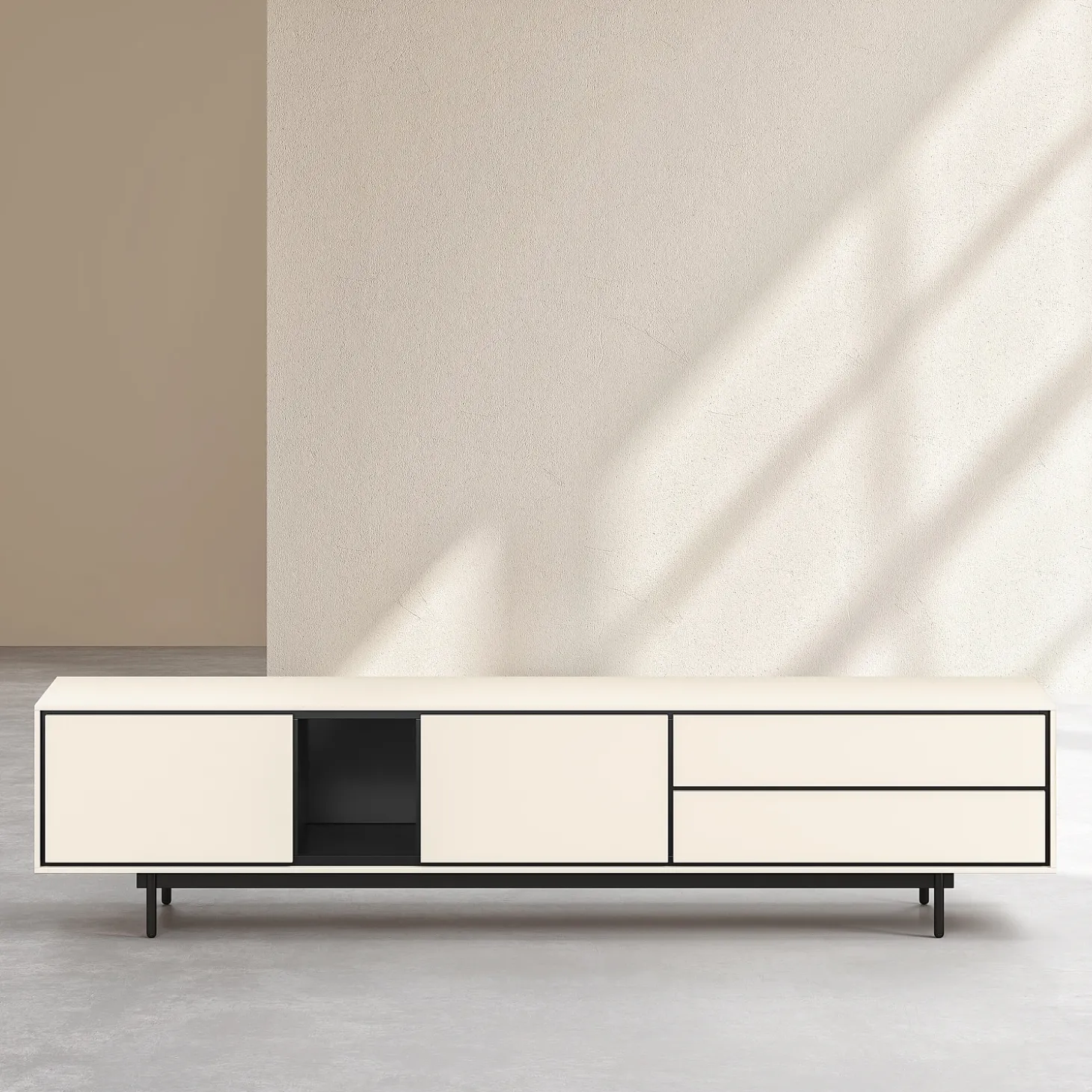 Ses deux portes et deux tiroirs offrent un rangement généreux, dissimulé derrière une façade structurée aux lignes nettes et à la précision graphique affirmée. Sa finition laquée beige diffuse une profondeur élégante et une douceur visuelle, tandis que les lignes sombres qui soulignent les contours créent un contraste raffiné, accentuant la rigueur de la confection.