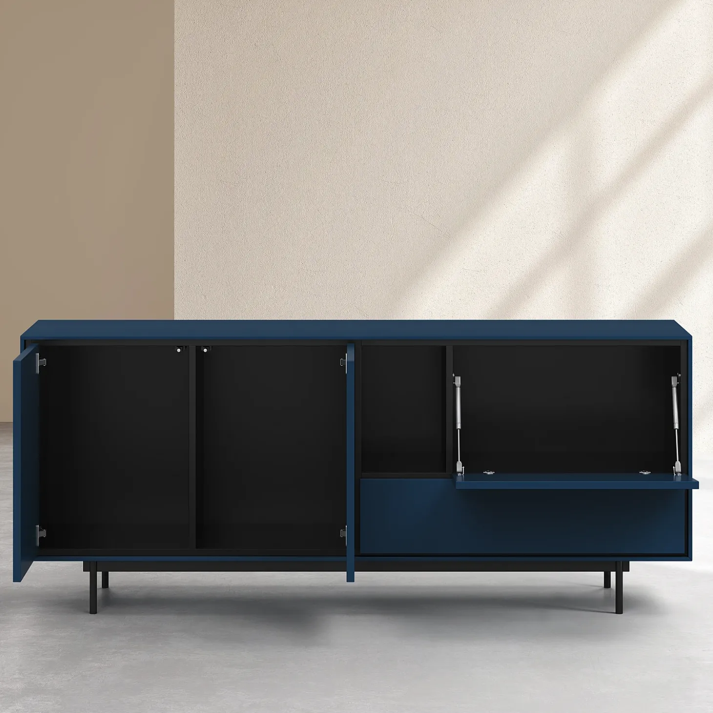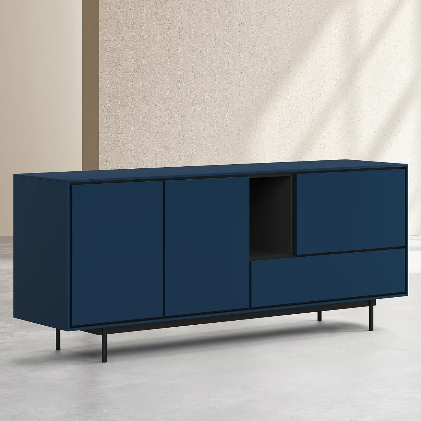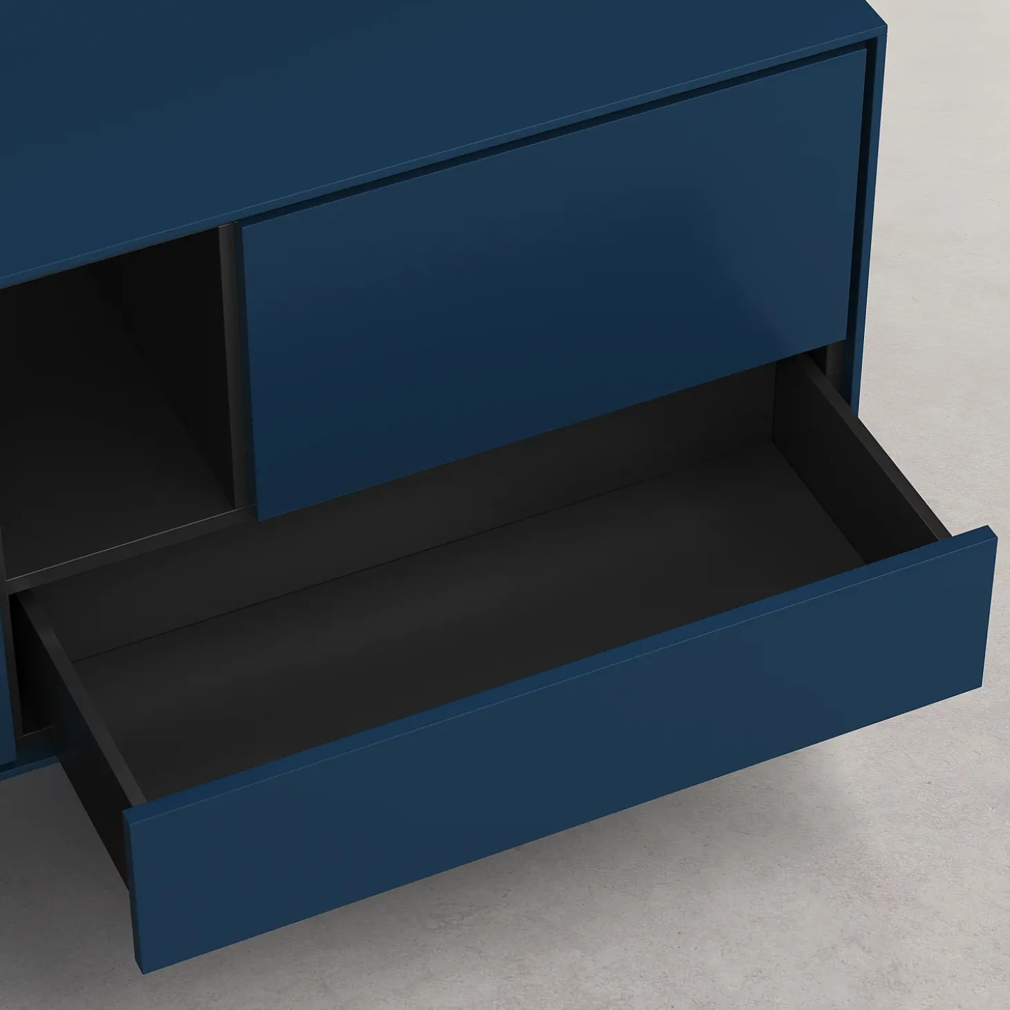 Doté de trois portes et d’un tiroir, il offre des espaces de rangement généreux subtilement intégrés à une structure épurée. Sa finition laquée bleu pétrole diffuse une profondeur élégante et une douceur visuelle, tandis que les lignes sombres qui soulignent les contours créent un contraste raffiné, mettant en valeur la rigueur de la confection.