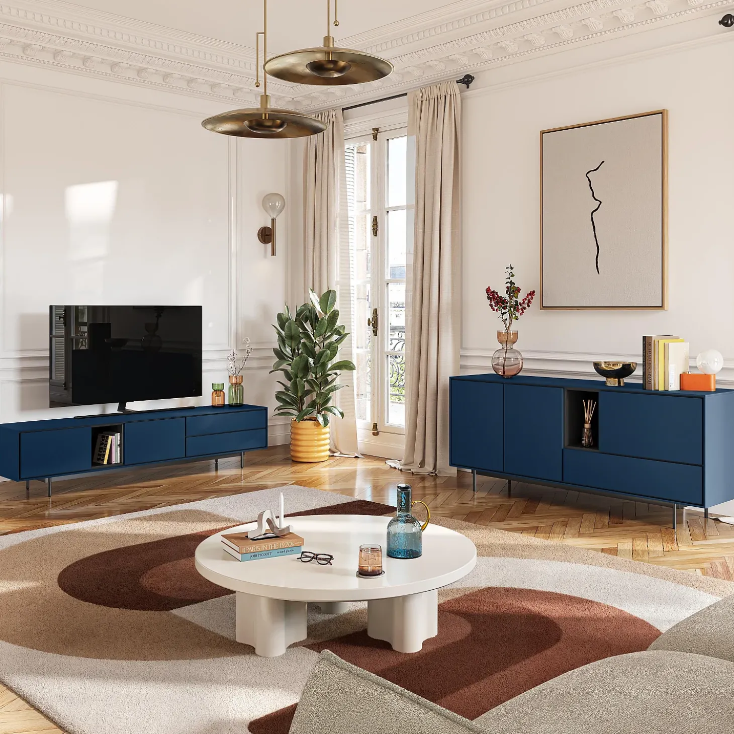 Charge maximale supportée : 50 kg sur le plateau supérieur, 10 kg par compartiment (tiroir, étagère ou niche)Farrel signe un buffet aux lignes contemporaines, où la finition laquée rencontre une organisation fonctionnelle pensée pour conjuguer sobriété et praticité.
