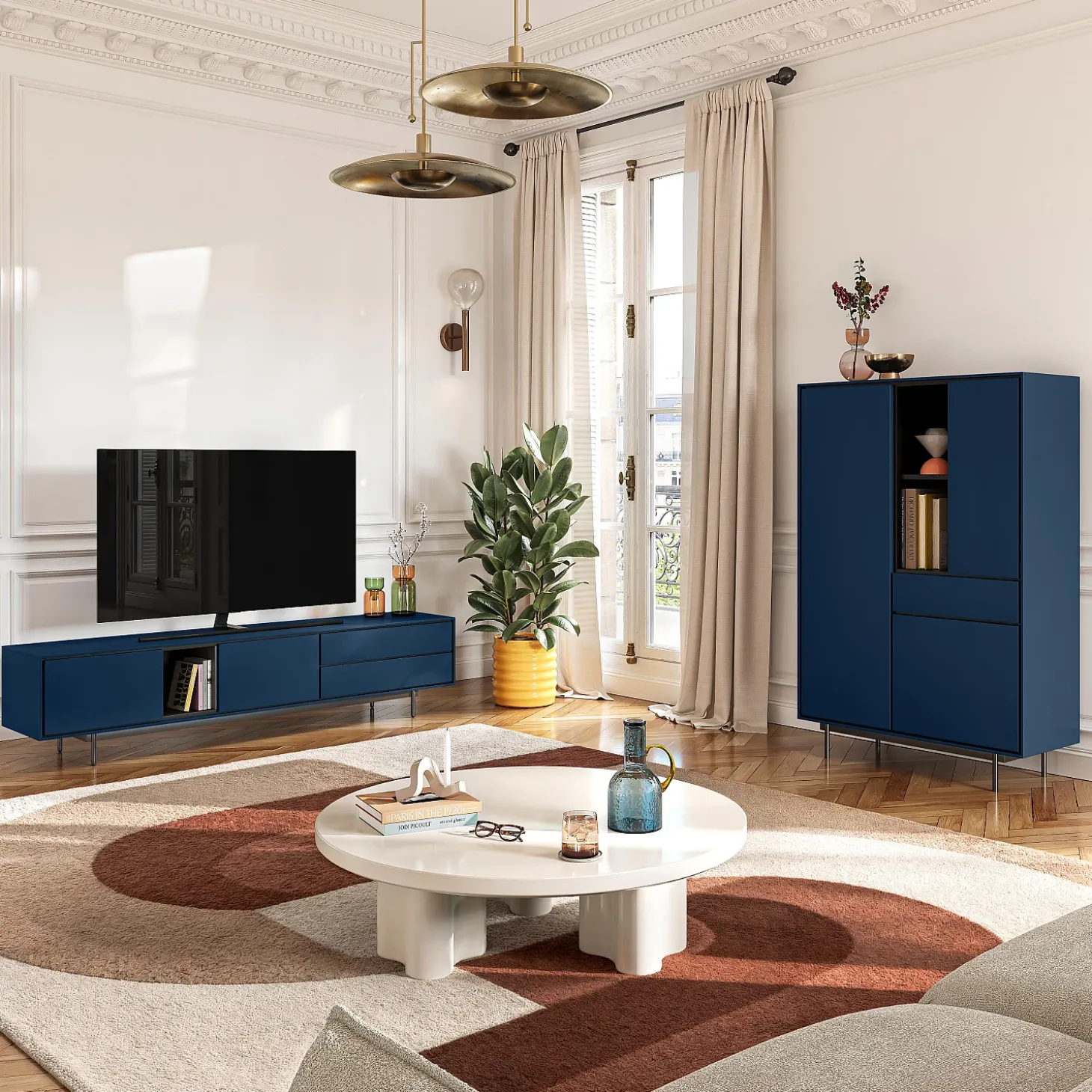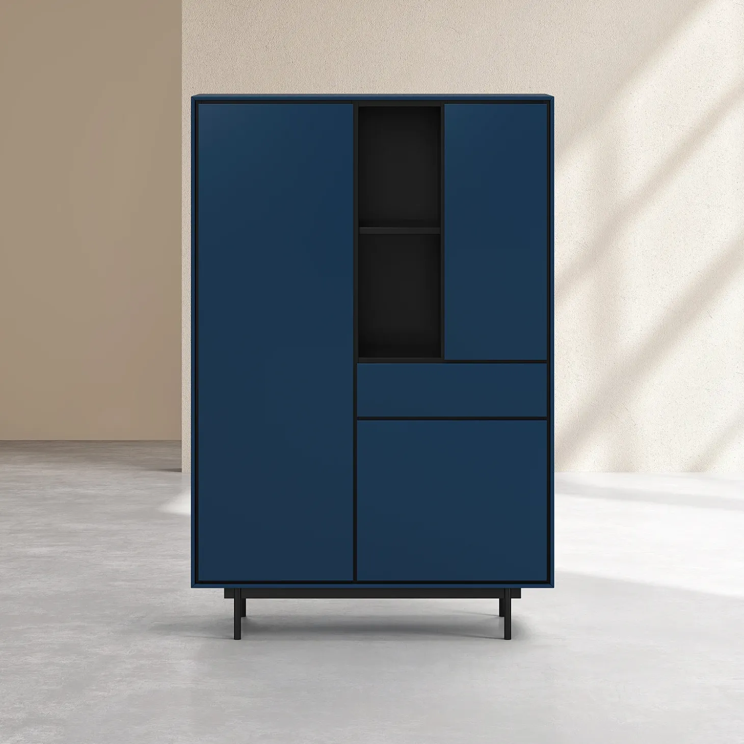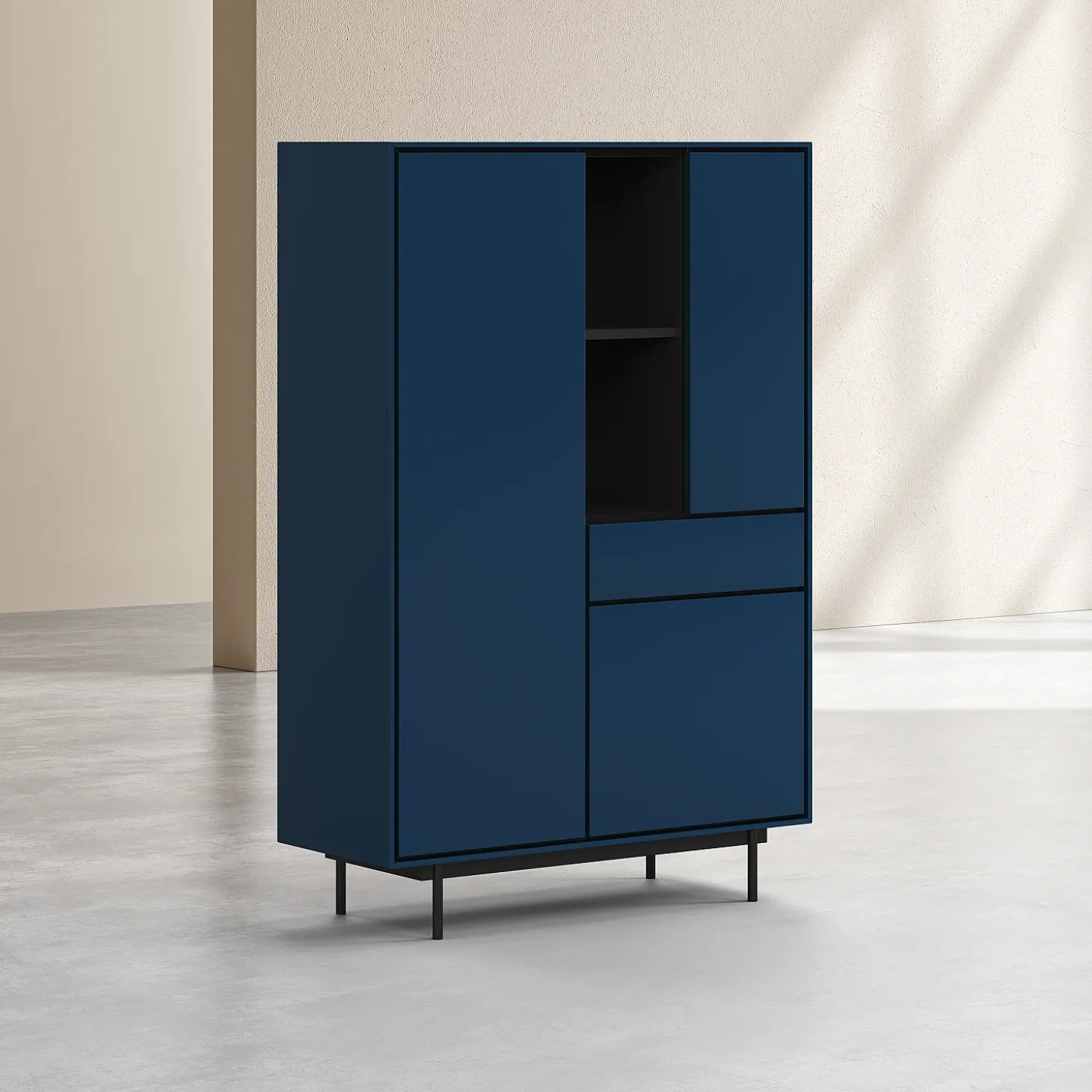 Doté de trois portes et d’un tiroir, il offre des volumes de rangement généreux intégrés avec précision. Sa finition laquée bleu pétrole diffuse une profondeur élégante, tandis que les lignes sombres qui soulignent les contours créent un contraste raffiné, mettant en valeur la rigueur de la confection.