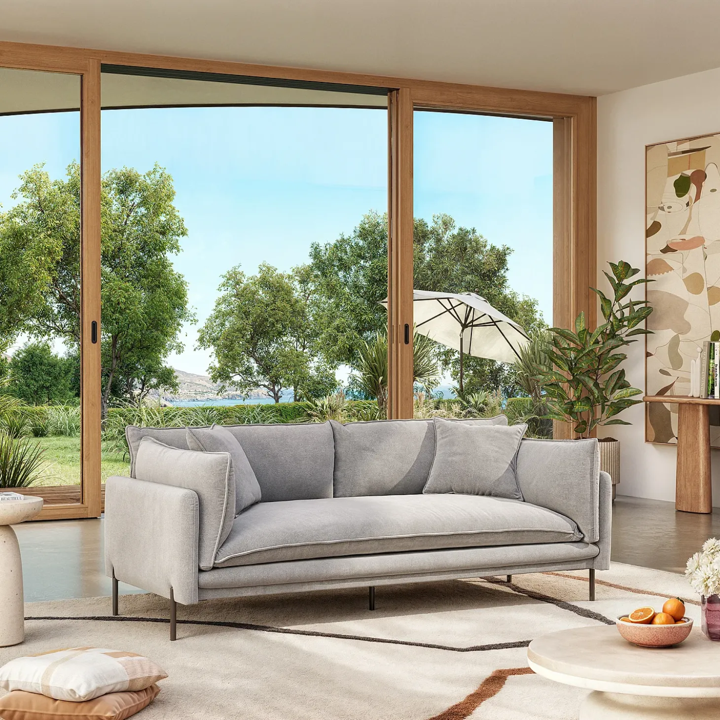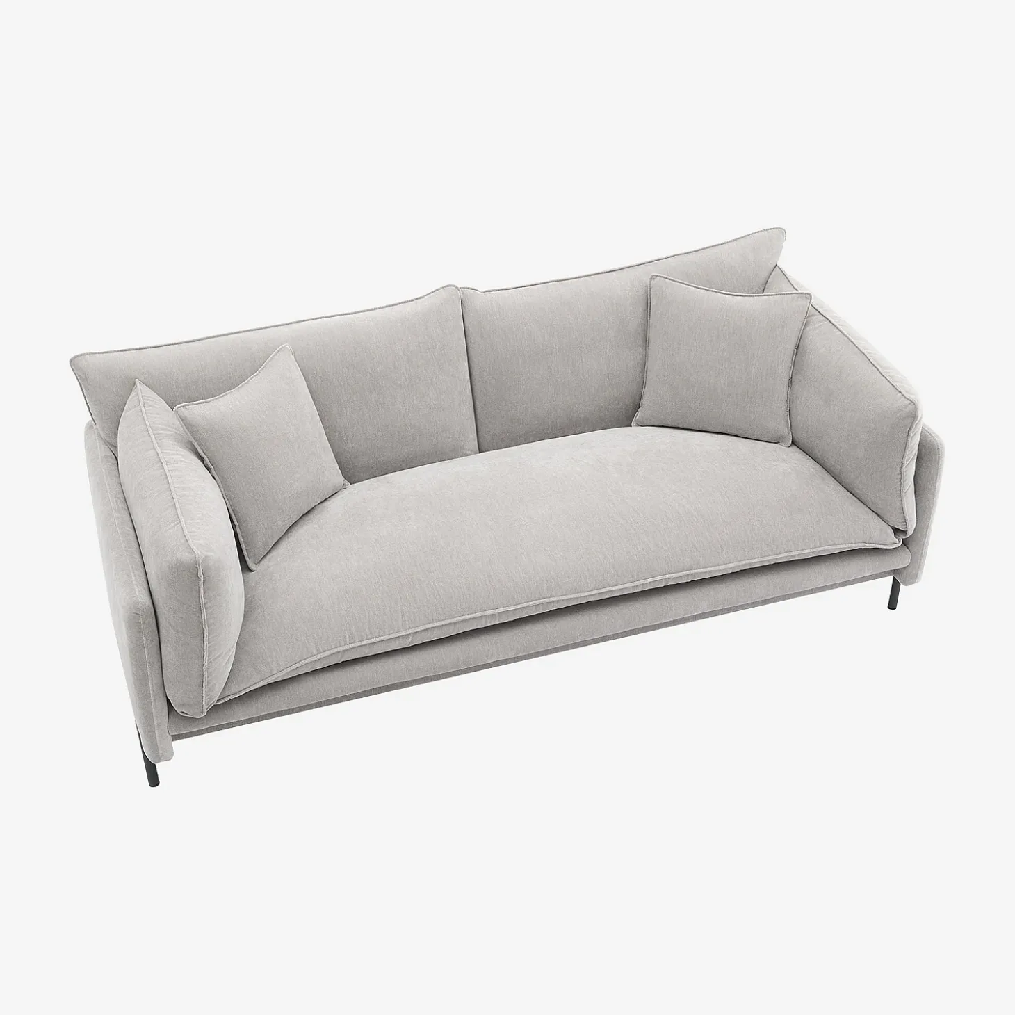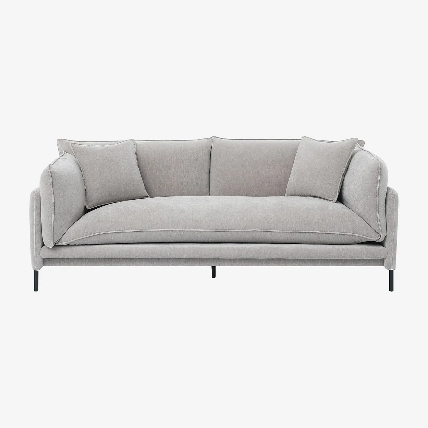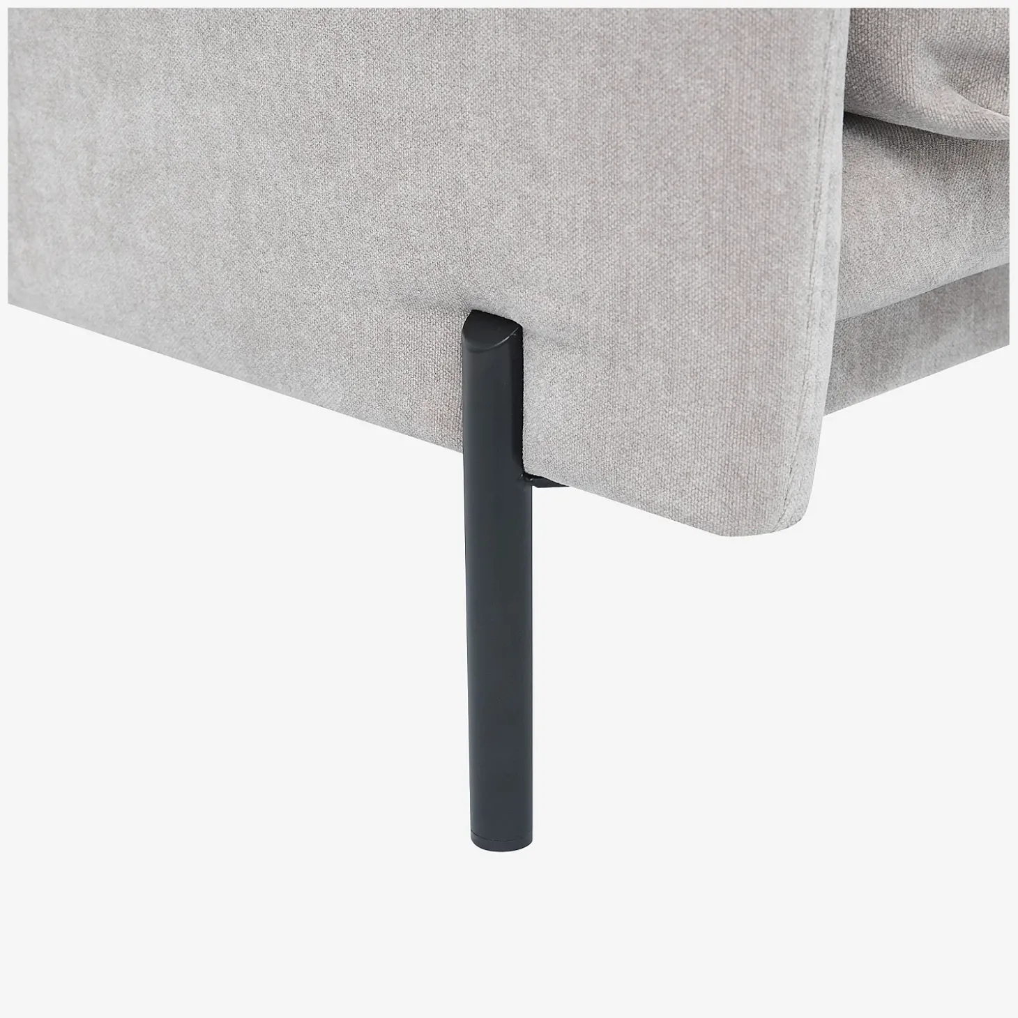 Ses pieds en métal noir créent un espace aéré, tandis que son revêtement en tissu doux insuffle une élégance chaleureuse, soulignée par deux coussins décoratifs pour un ensemble équilibré. Harmonieuse, sa teinte gris perle est à la fois chic et moderne, idéale pour une décoration d’intérieur intemporelle.