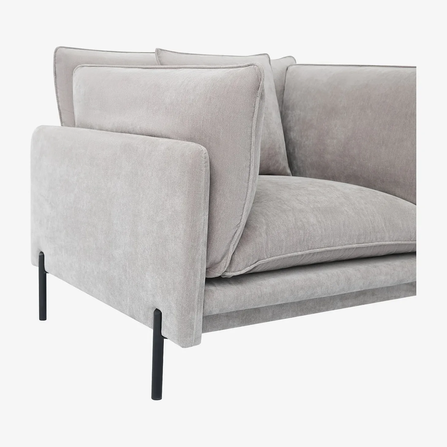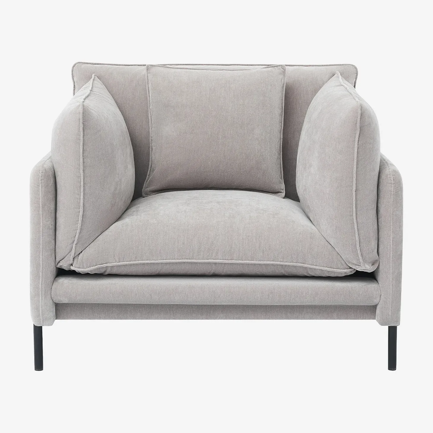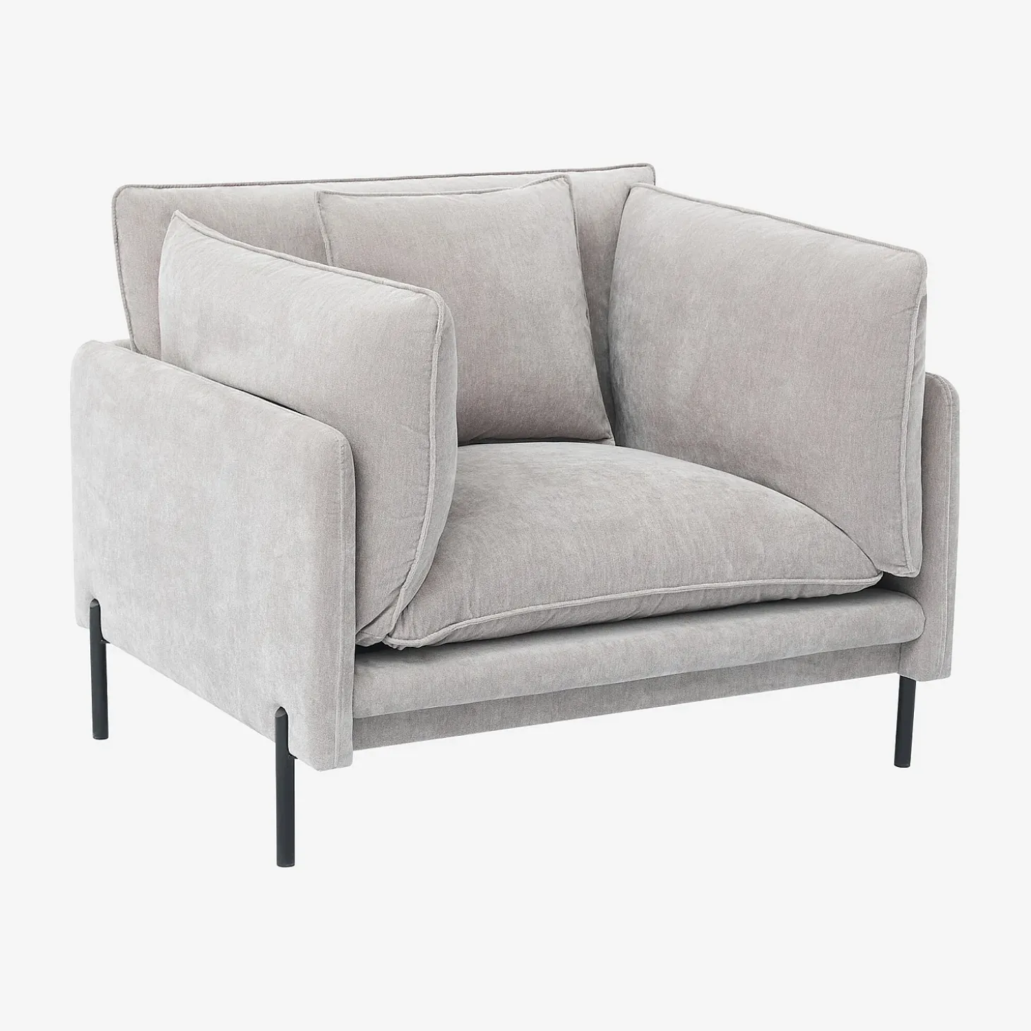 Ses pieds en métal noir créent un espace aéré, tandis que son revêtement en tissu doux insuffle une élégance chaleureuse, soulignée par un coussin décoratif pour un ensemble équilibré. Harmonieuse, sa teinte gris perle est à la fois chic et moderne, idéale pour une décoration d’intérieur intemporelle.