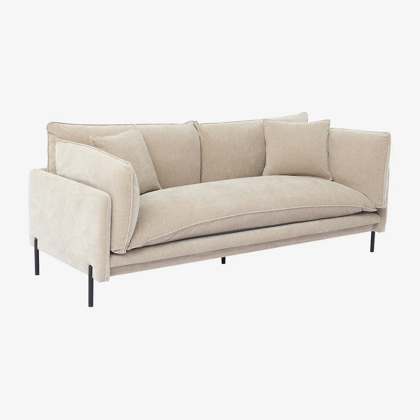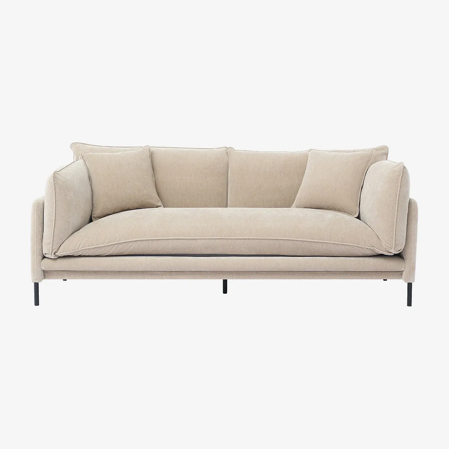 Ses pieds en métal noir créent un espace aéré, tandis que son revêtement en tissu doux insuffle une élégance chaleureuse, soulignée par deux coussins décoratifs pour un ensemble équilibré. Sa couleur taupe réchauffe l’atmosphère d’une pièce, ajoutant une touche de chic à la décoration intérieure.