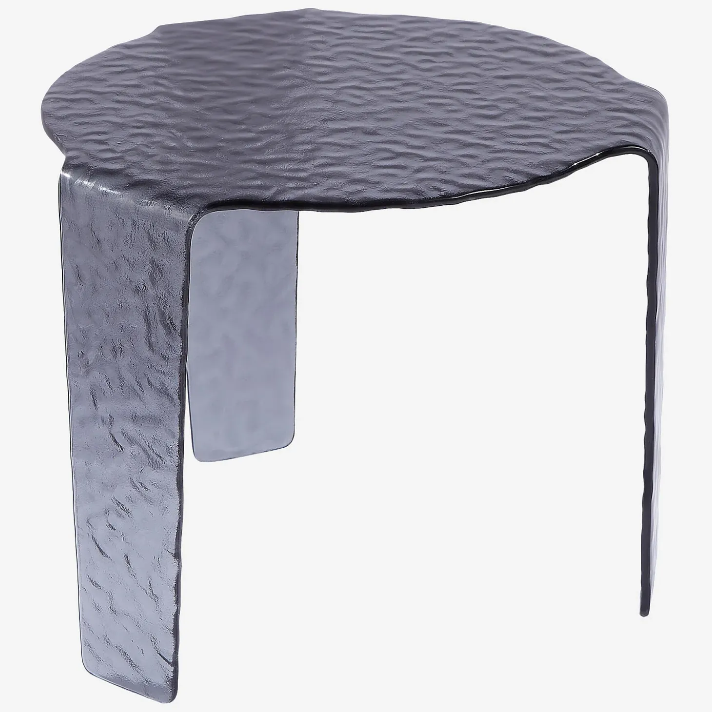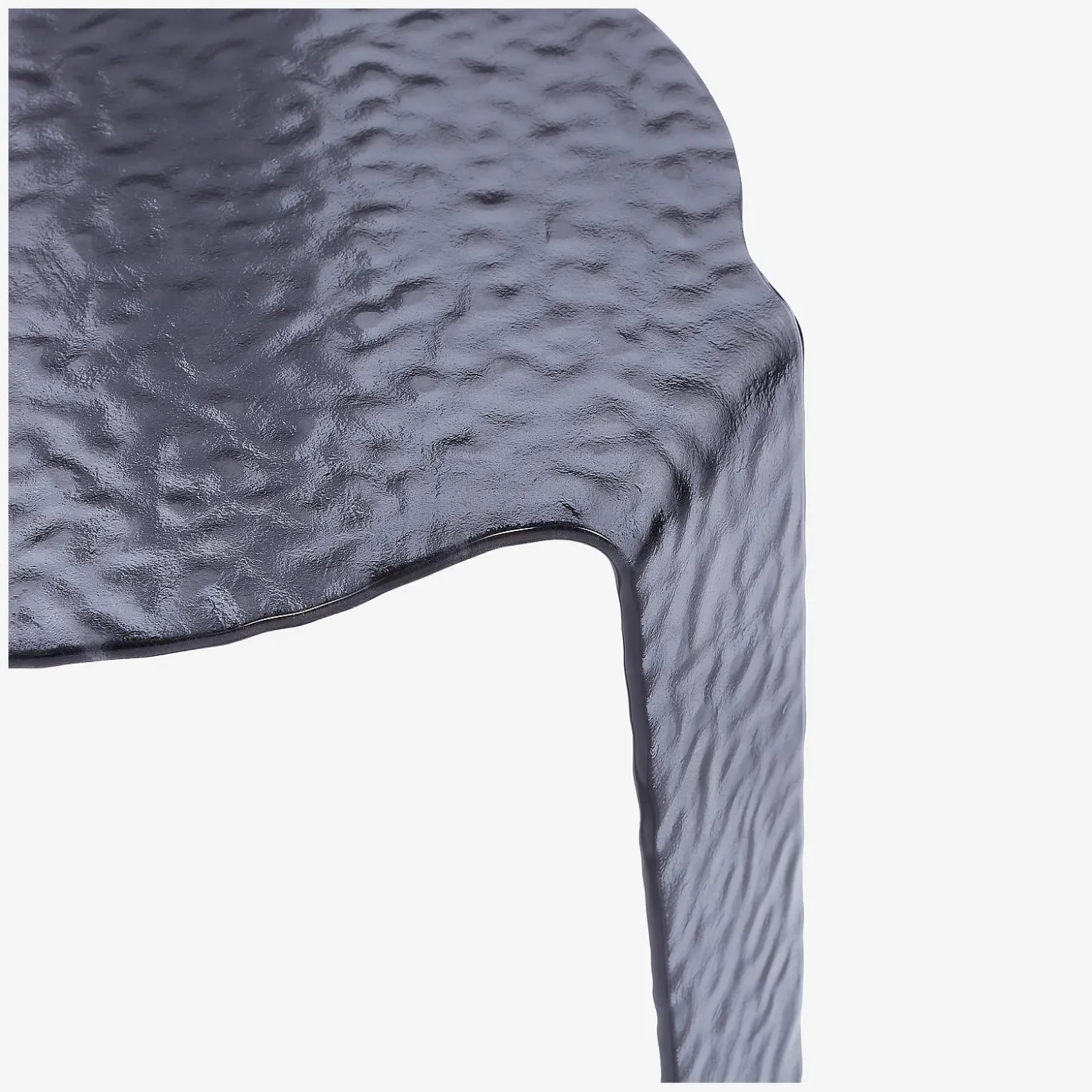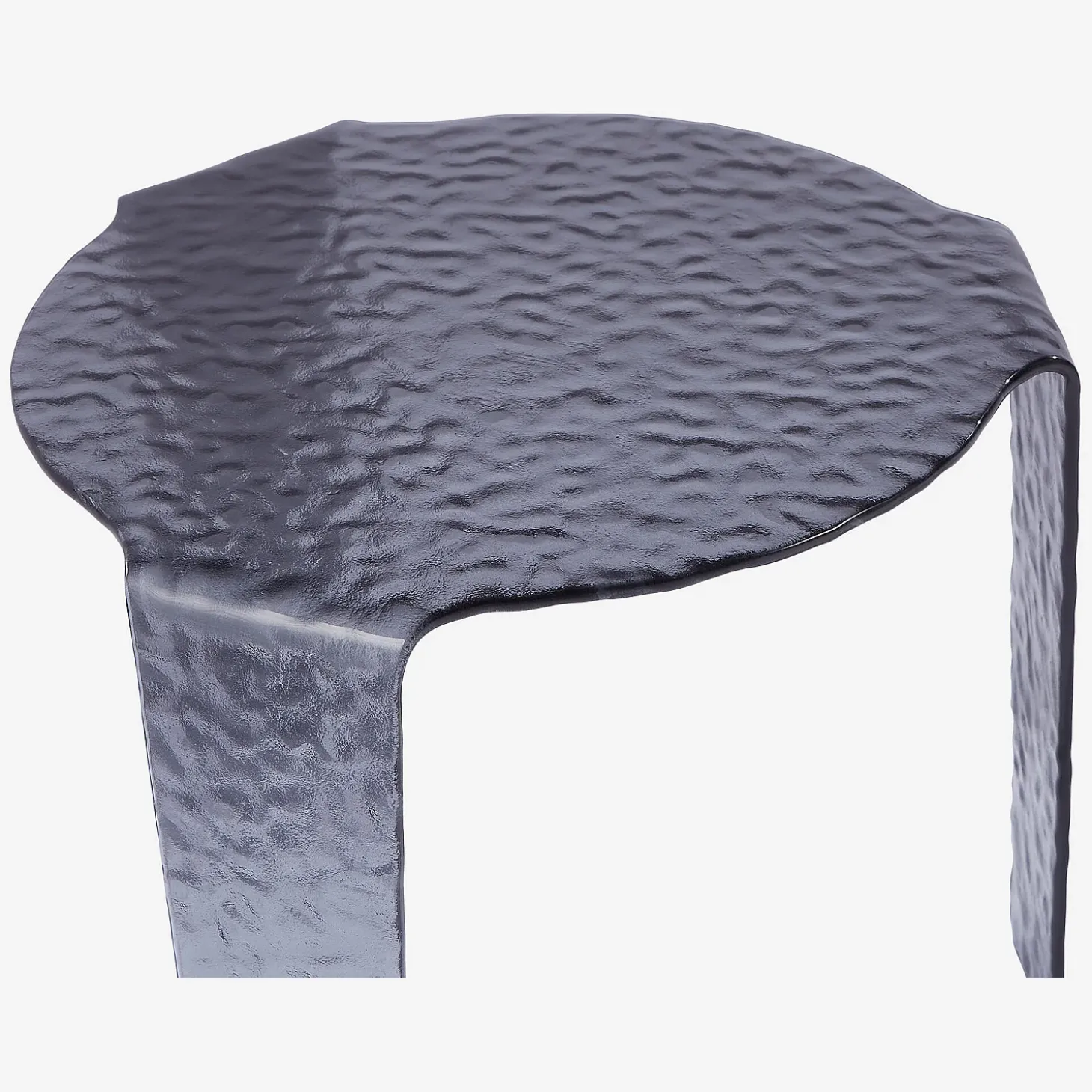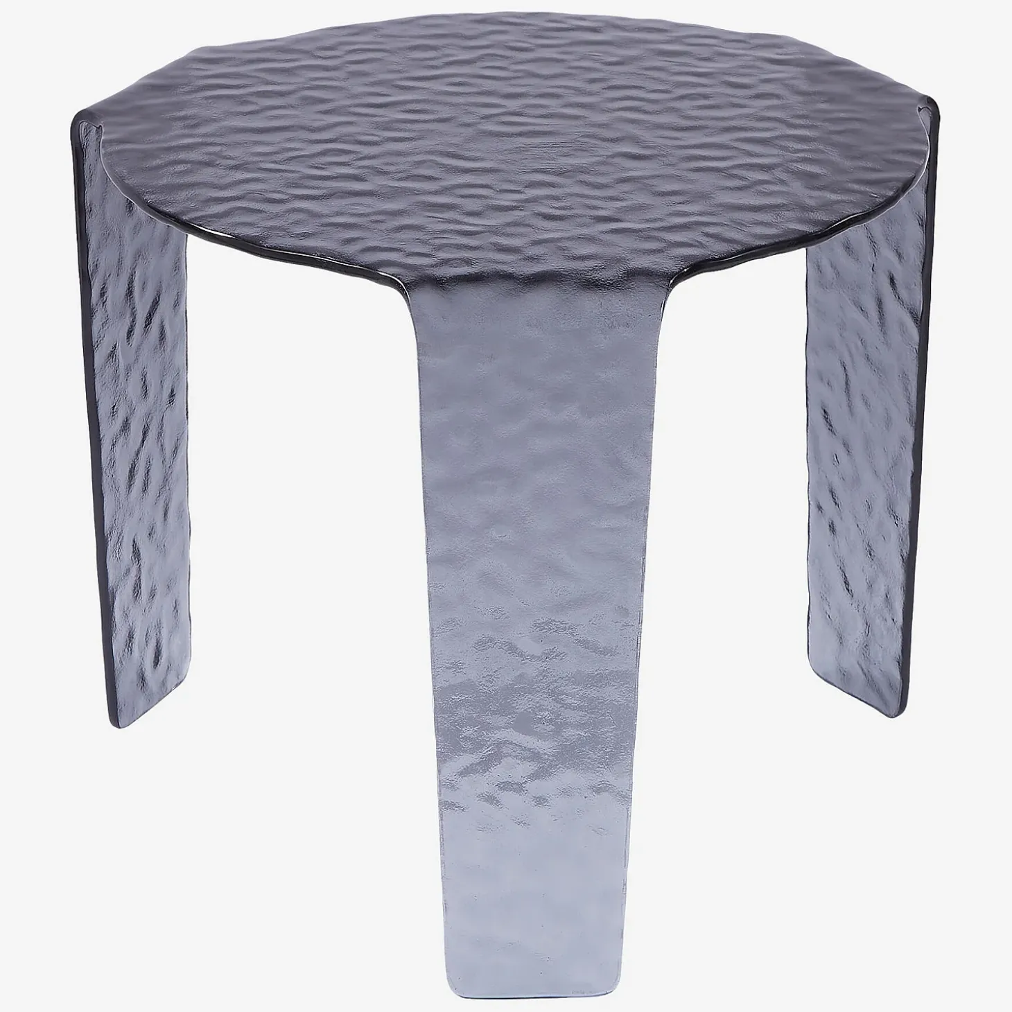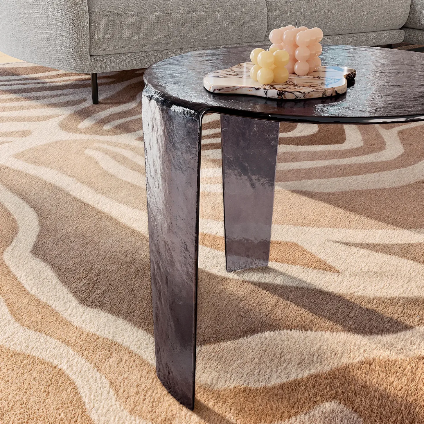 Entièrement conçue en verre bullé, elle associe finesse visuelle et solidité. Son piètement et son plateau fusionnent dans une silhouette sculpturale continue, mettant en valeur les reflets subtils de sa teinte gris fumé.