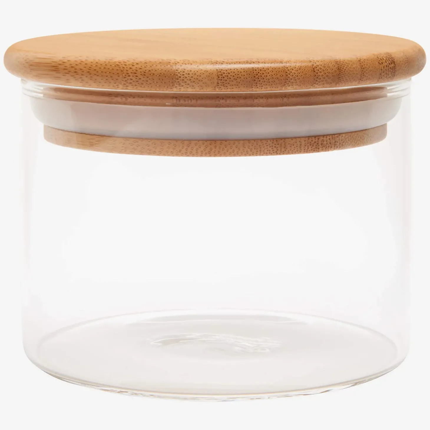 Le bocal Ferm de 10 cm de diamètre et 8 cm de hauteur est en verre borosilicate et possède un couvercle en bambou. Le borosilicate est une matière reconnue pour sa haute malléabilité et sa grande résistance aux températures. Ainsi lorsqu’il ne protège pas des aliments secs, il peut contenir des déconctions chaudes.
