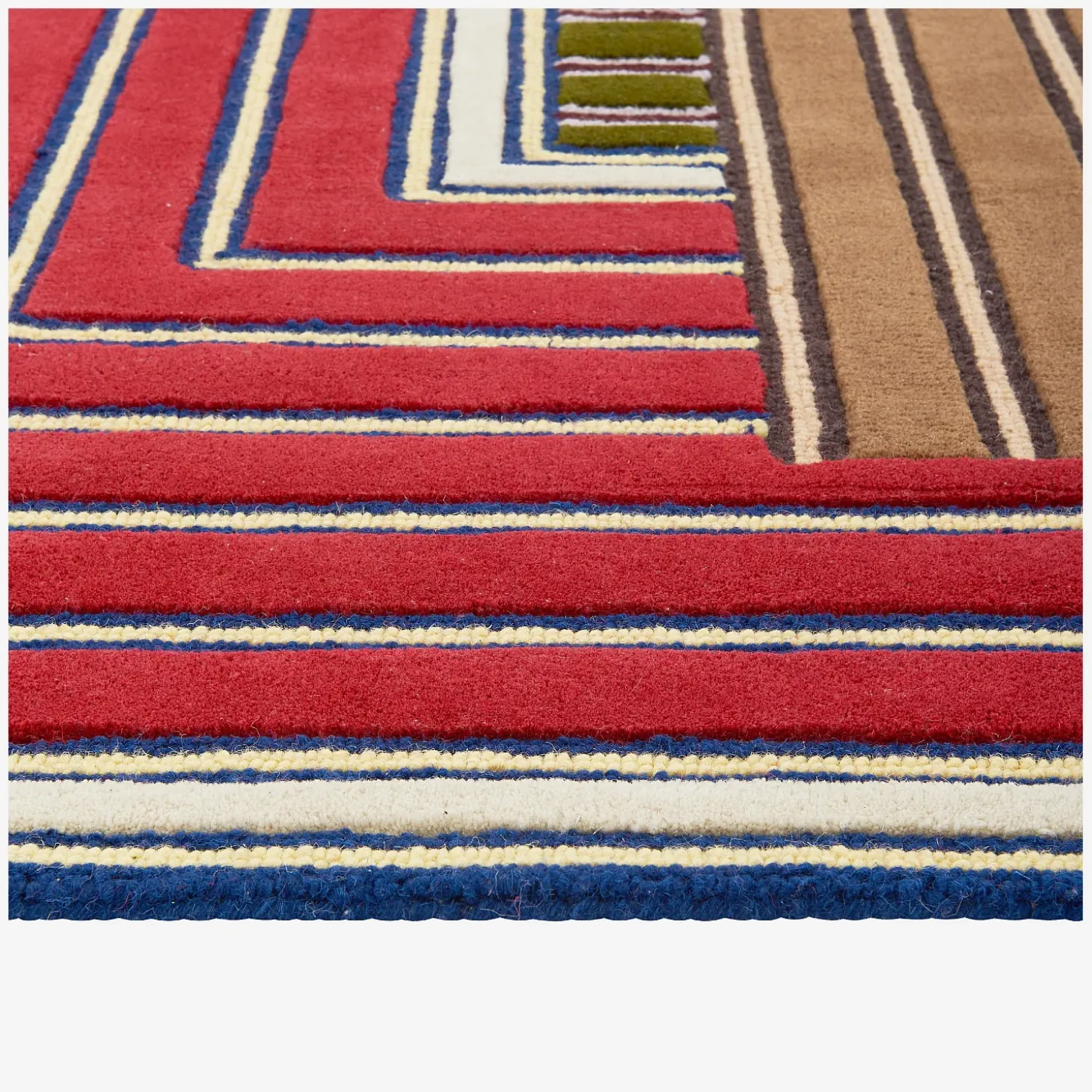 Dominé par des tons rouges profonds et vibrants, ce tapis est ponctué de touches d’orange, de vert et de bleu ciel, qui apportent de la fraîcheur et de la légèreté à la palette chaude. La juxtaposition de ces couleurs, tout en contrastes, génère une énergie vivante et contemporaine, renforcée par la richesse tactile de la laine tuftée.
