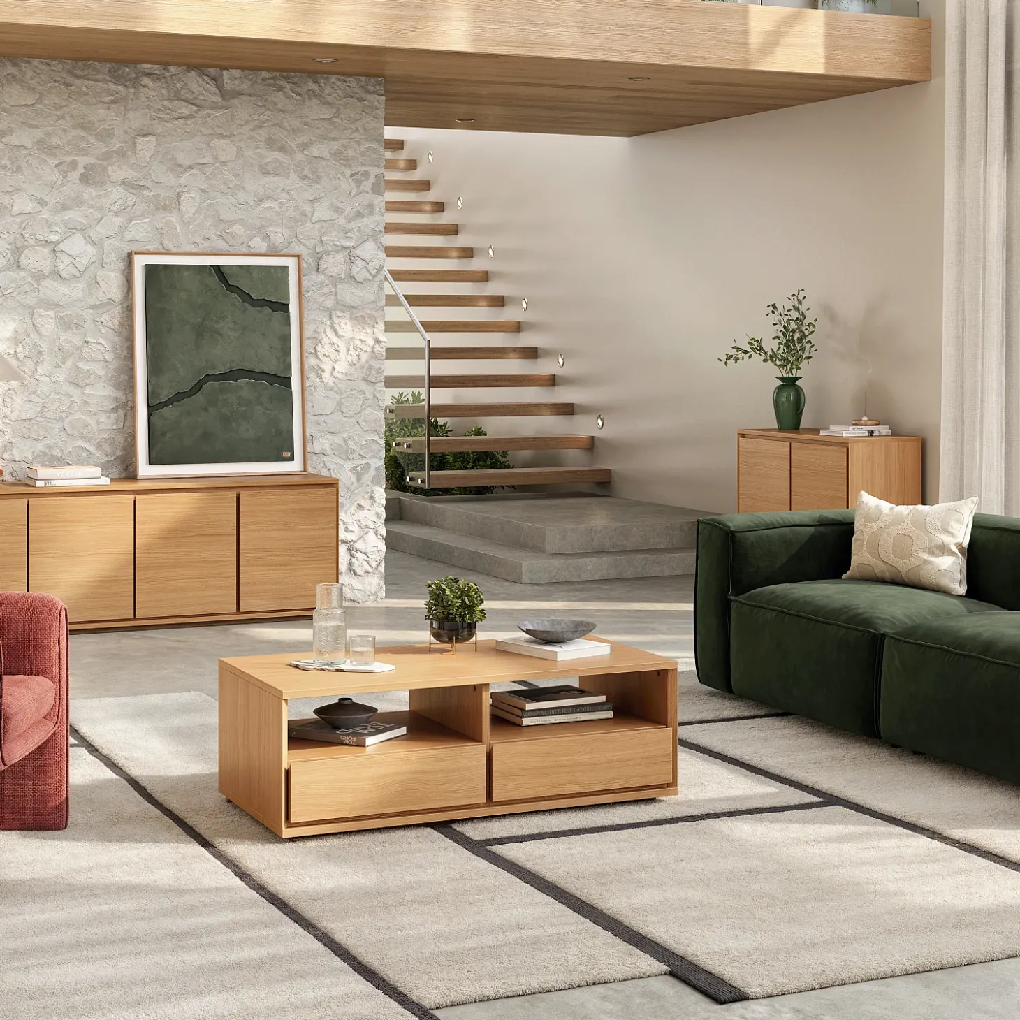 La table basse avec rangements en chêne Hazo s’invite dans le salon, apportant une note authentique.