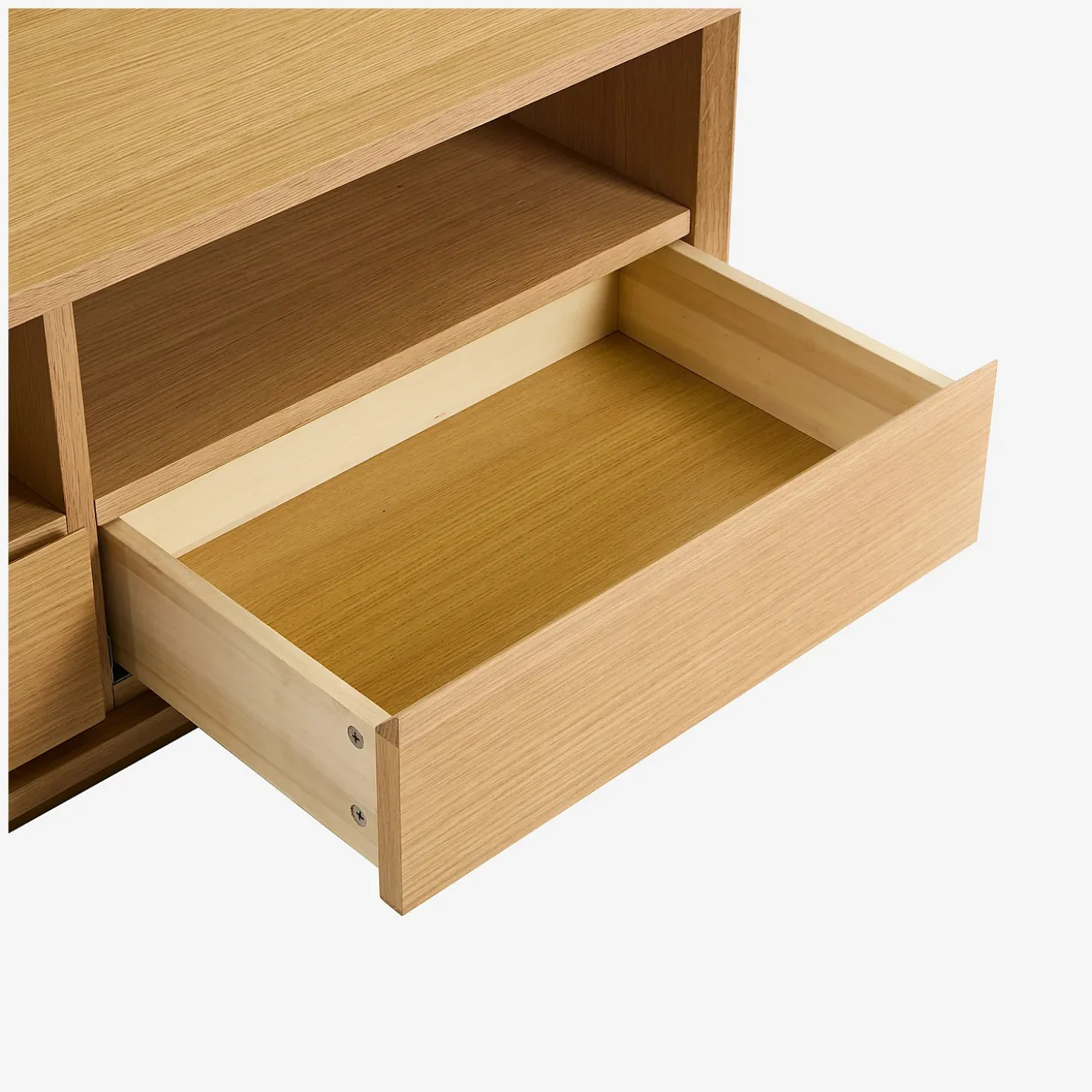 Ses deux tiroirs offrent un rangement idéal pour un rendu ordonné. Les différents espaces ouverts permettent d’y exposer de la décoration tout en gardant un plateau dégagé.