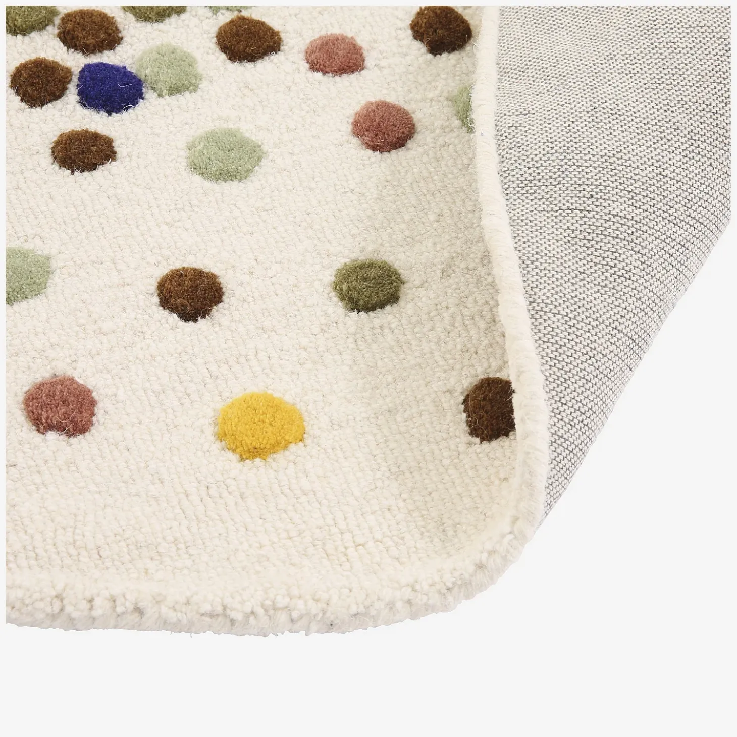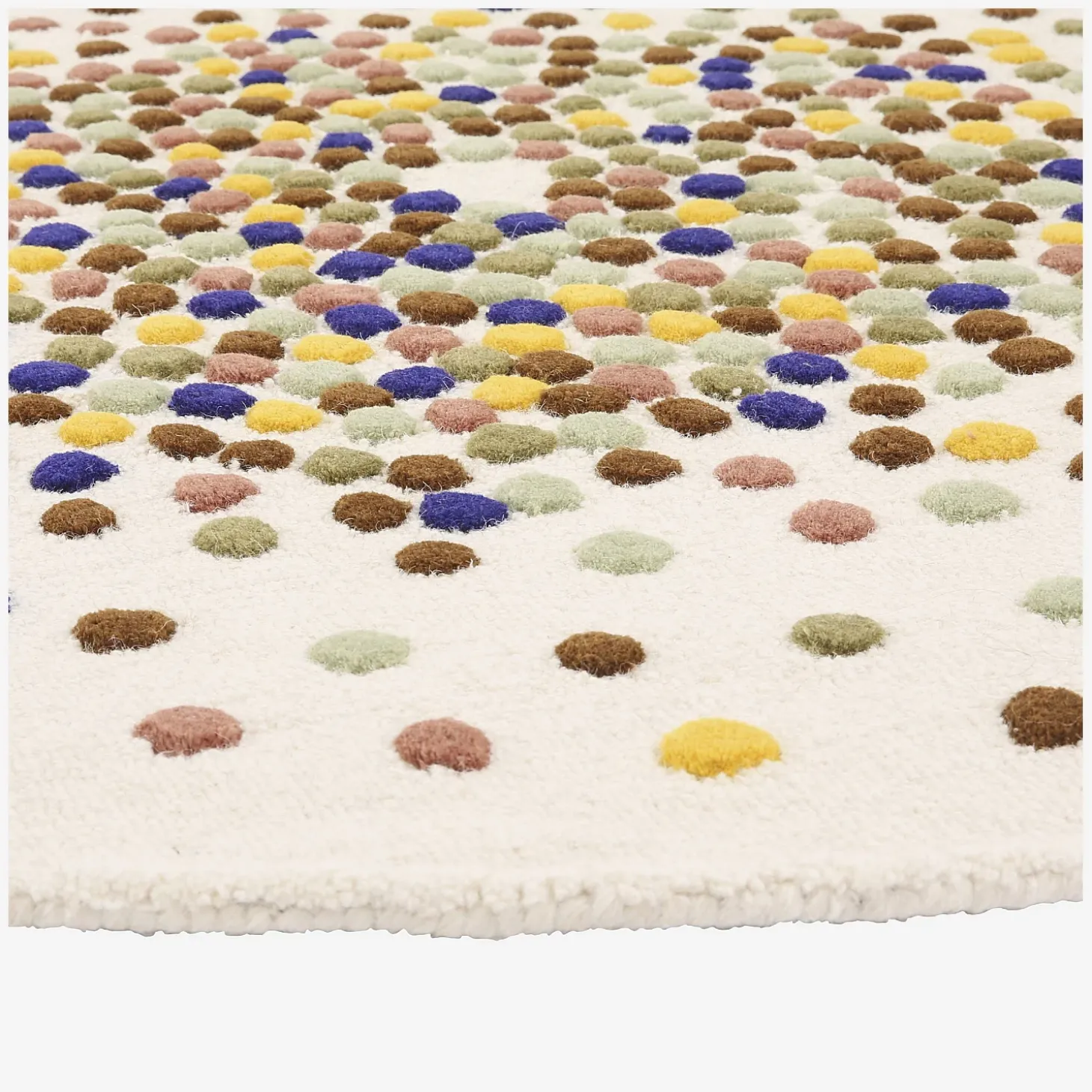 Le tapis rond 150 cm Idylle s’inspire de l’univers du kaléidoscope : une multitude de pois colorés disposés en composition libre. Le motif évoque la légèreté, la lumière, et l’enfance — un parti-pris chaleureux et accueillant. Ce tapis 100% laine est tufté à la main par des artisans indiens. Chaque fil est piqué, coupé, puis brossé pour faire ressortir la texture et le confort.