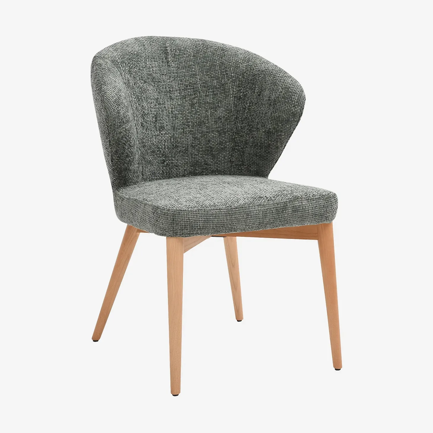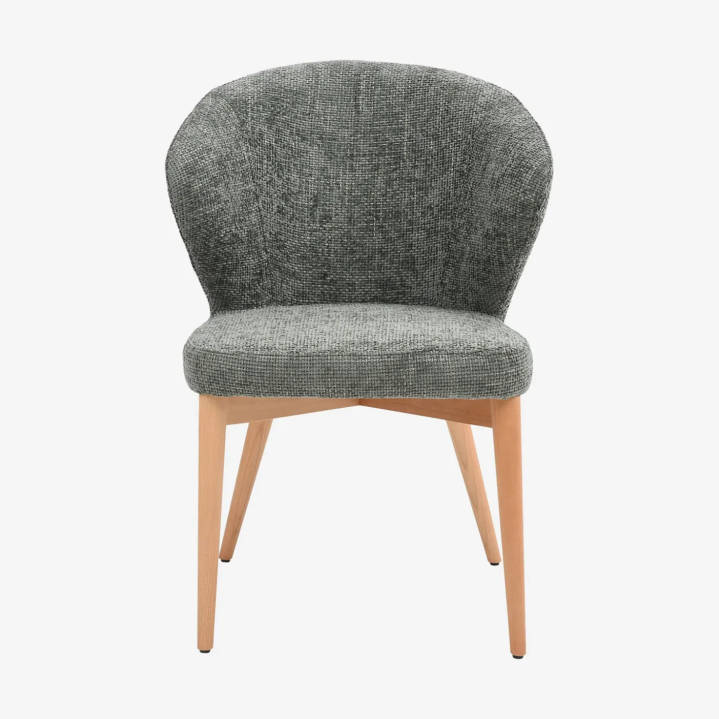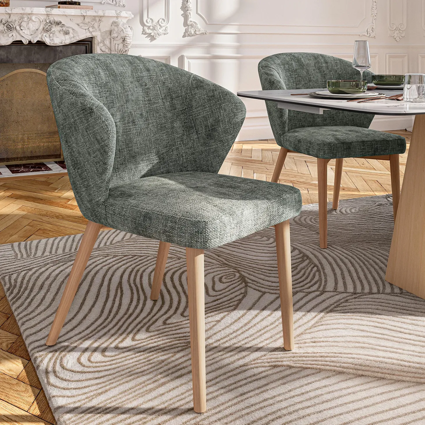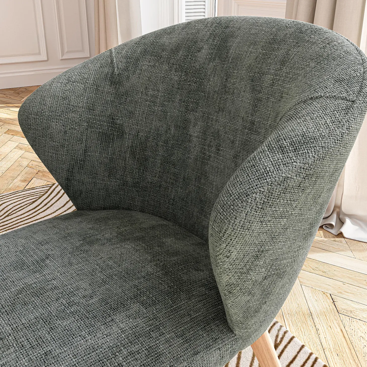 Son tissu chenille épais révèle un toucher velouté et un relief visuel subtil, qui sublime sa teinte vert sapin apaisante. La couleur chêne de ses quatre pieds en bois massif souligne le tout avec discrétion.