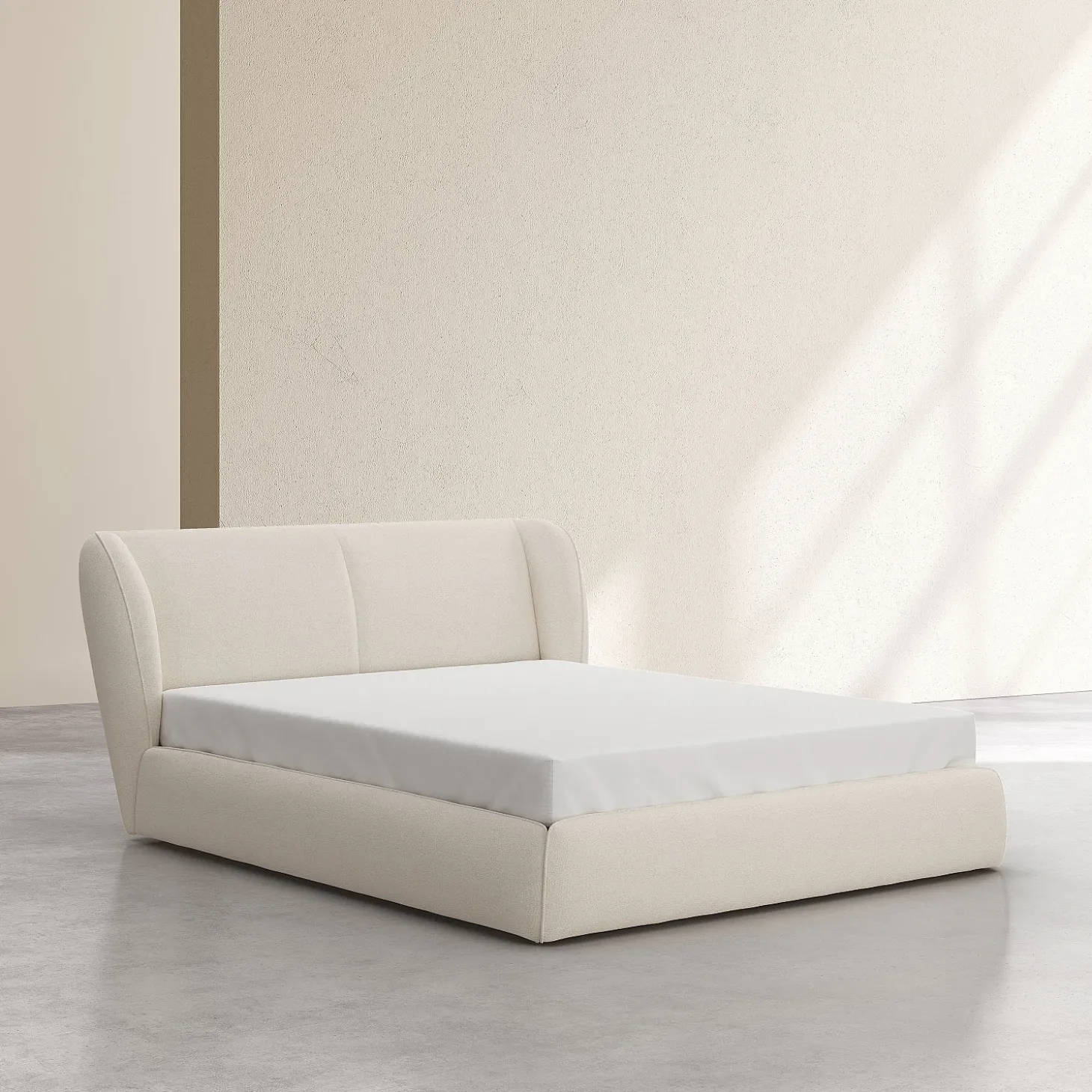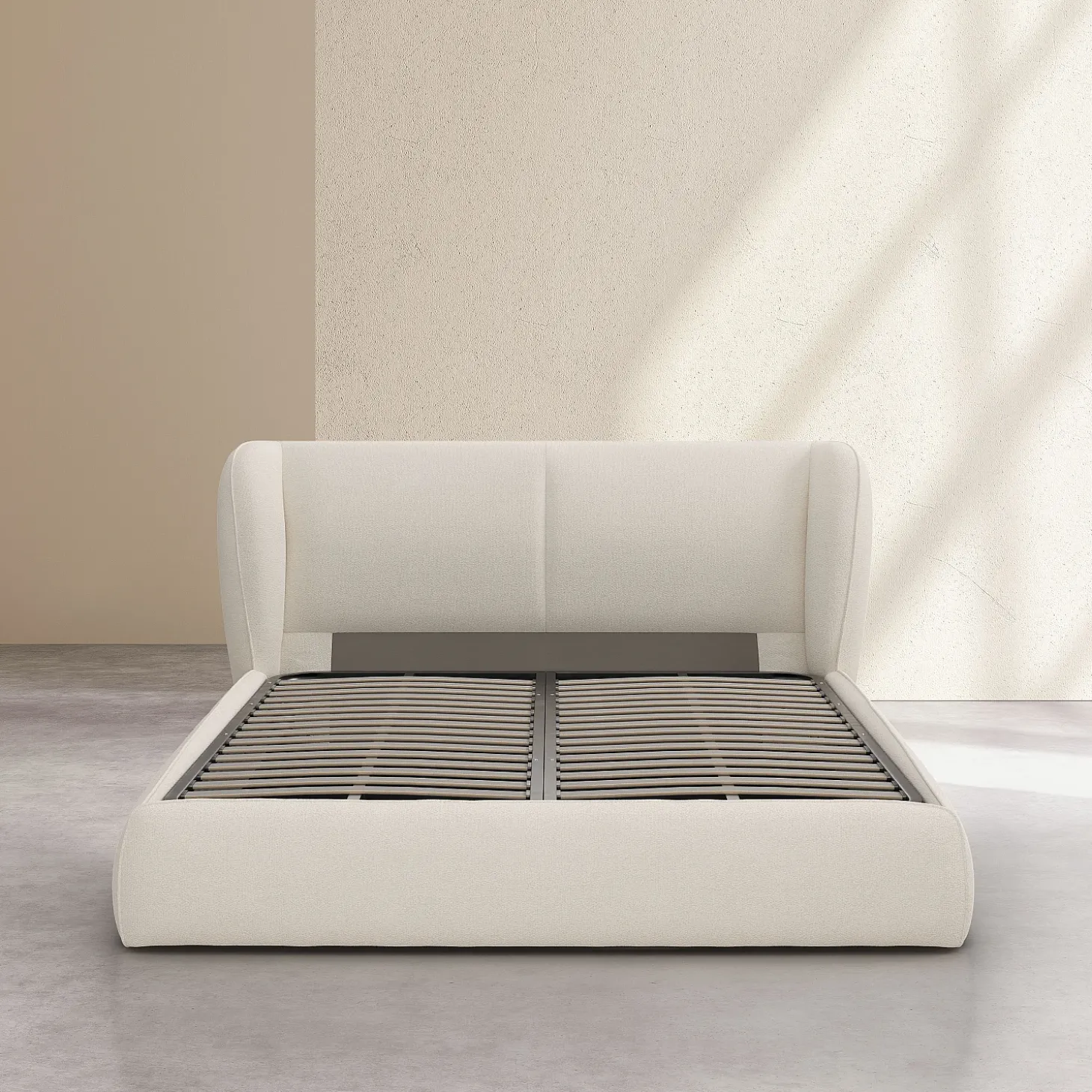 Du cadre à la tête de lit, il est entièrement habillé d’un tissu bouclette beige meringue. Ce revêtement texturé, à la fois tendance et chaleureux, crée une harmonie visuelle chic et épurée.