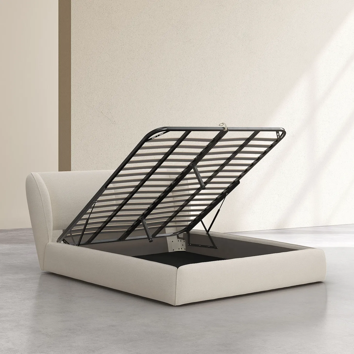 En format queen size, il optimise le confort tout en proposant un espace de rangement astucieux grâce à sa fonction lit-coffre. Le design aux rebords courbés de la tête de lit molletonnée offre un appui stable et enveloppant.