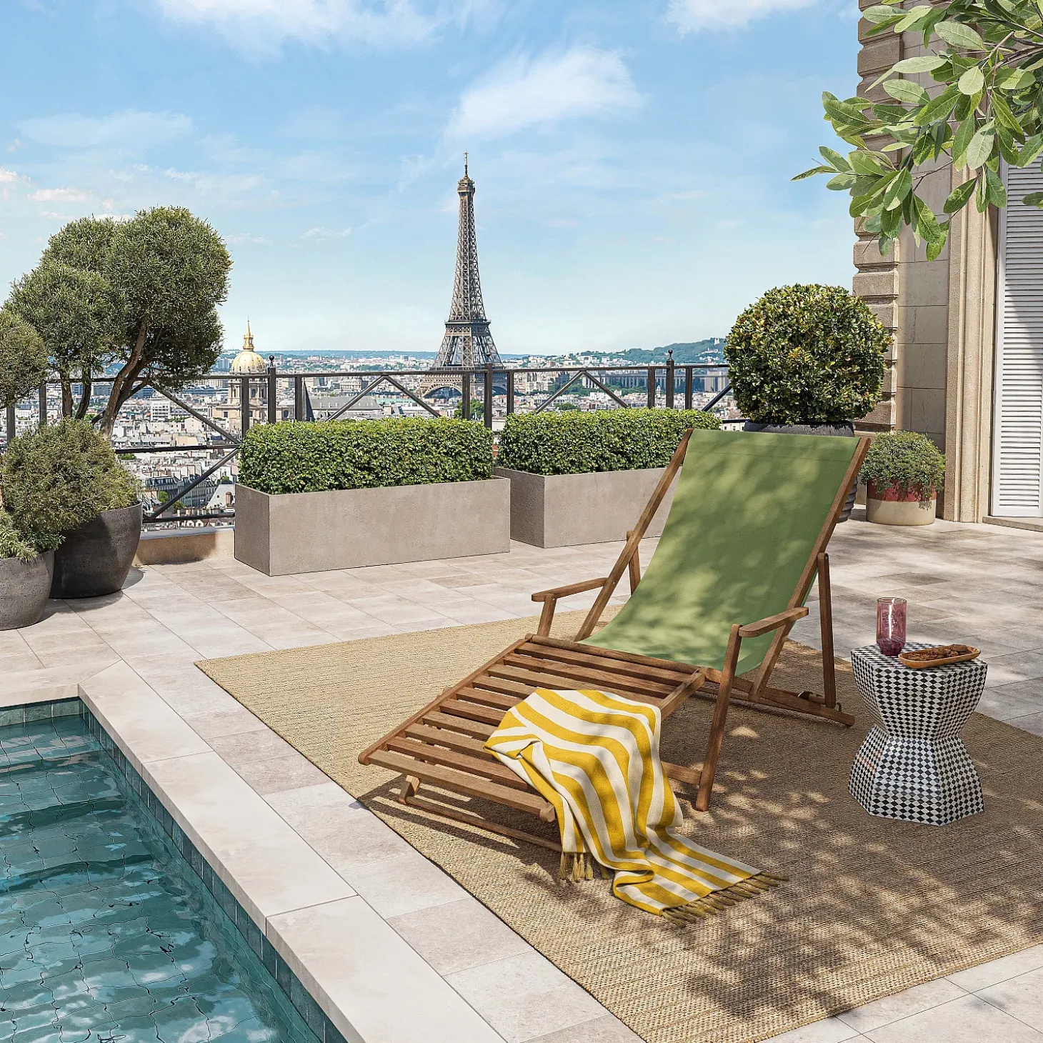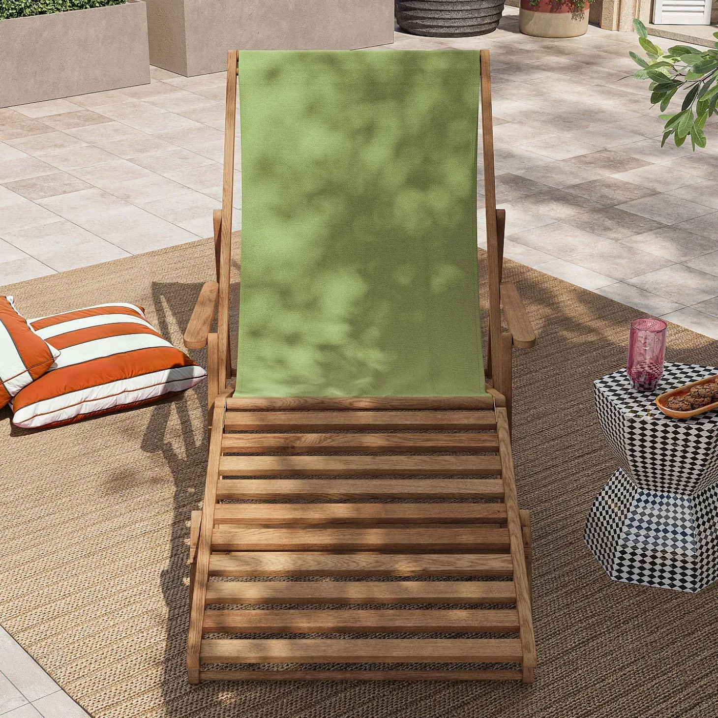 Son dossier incliné, prolongé par le repose-pieds, invite à la détente, tandis que la teinte vert olive diffuse une douceur lumineuse dans tous les espaces extérieurs.